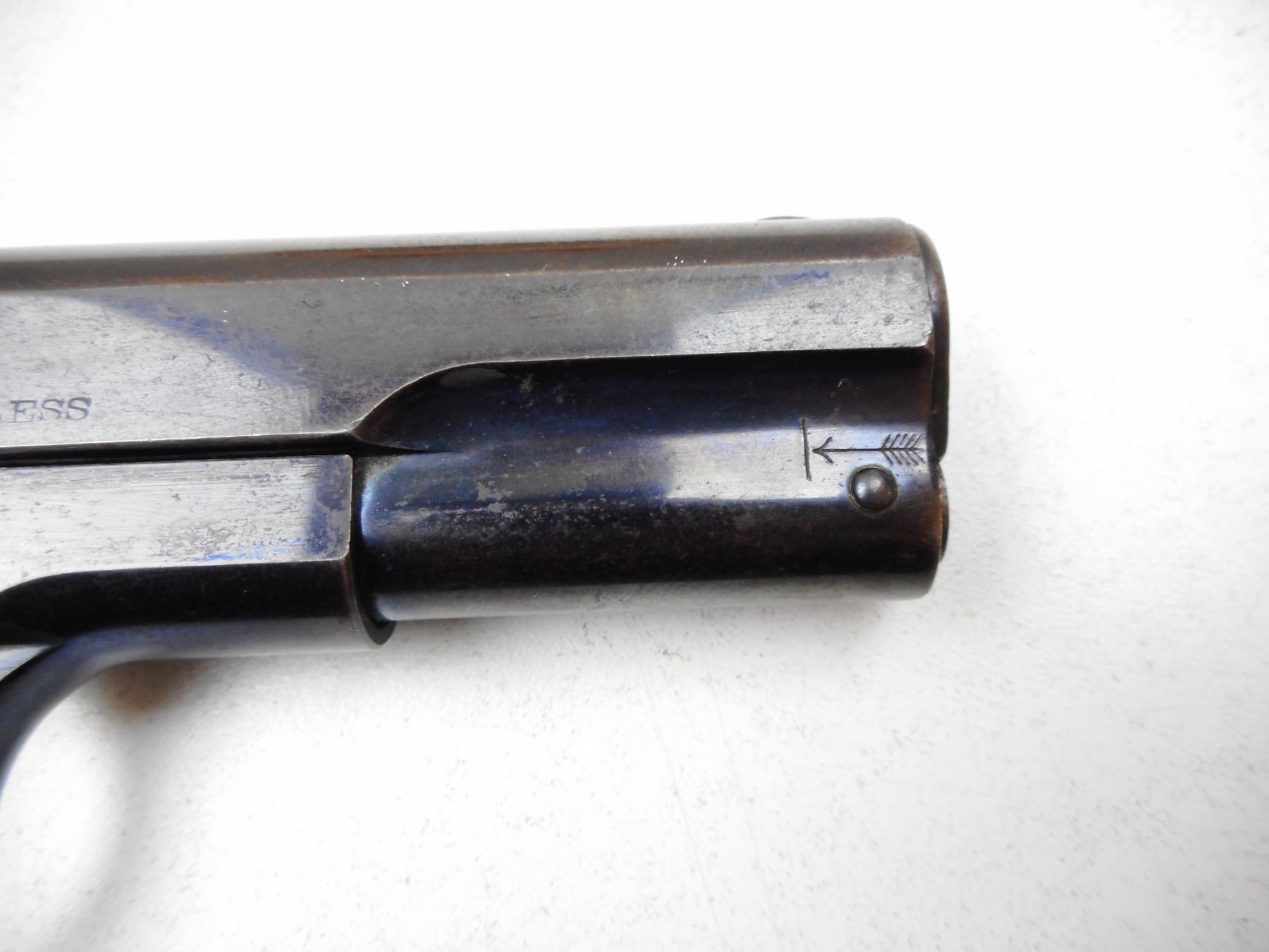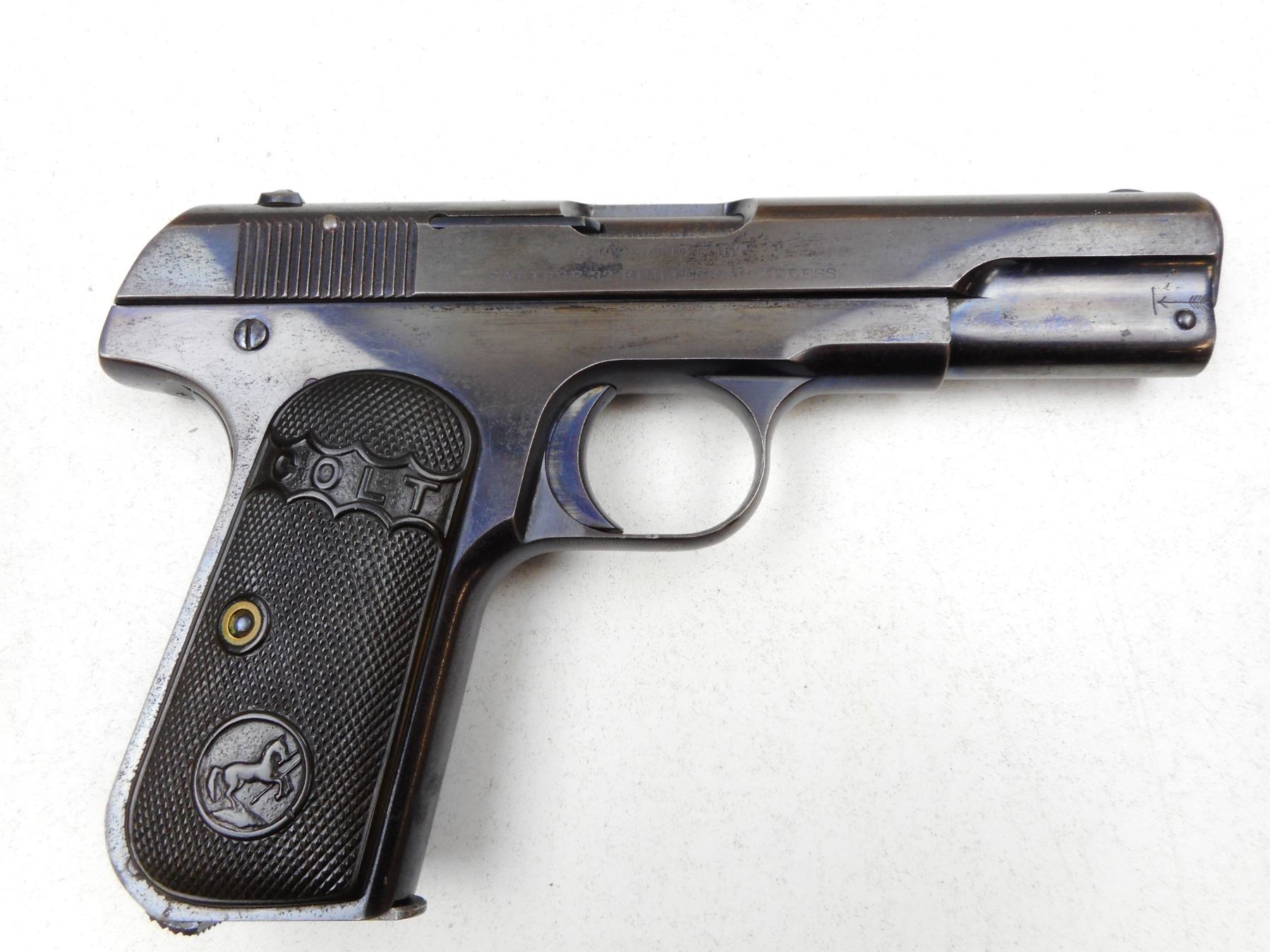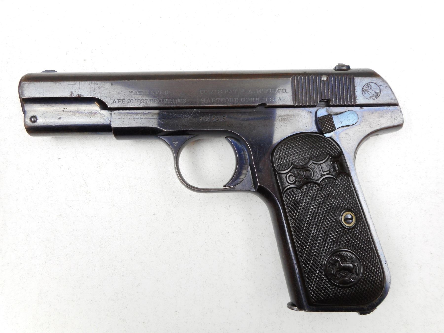 COLT , MODEL: 1903 POCKET HAMMERLESS , CALIBER: 32 AUTO , COMES WITH MAGAZINE, BRIGHT REBLUED FINISH, HARD RUBBER CHECKERED GRIPS, GOOD BORE, NOTCH & BLADE SIGHTS, MATCHING #'S, BLUE WORN ON GRIP STRAPS. , SERIAL # 65143 , ACTION: SEMI-AUTOMATIC , BARREL LENGTH: 102MM , CONDITION: 7/10 , STOCK # 2228 , CLASS: CANADIAN PROHIBITED CLASS