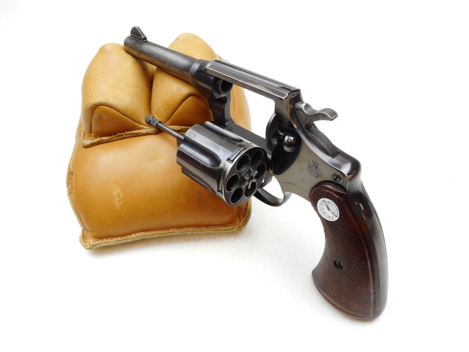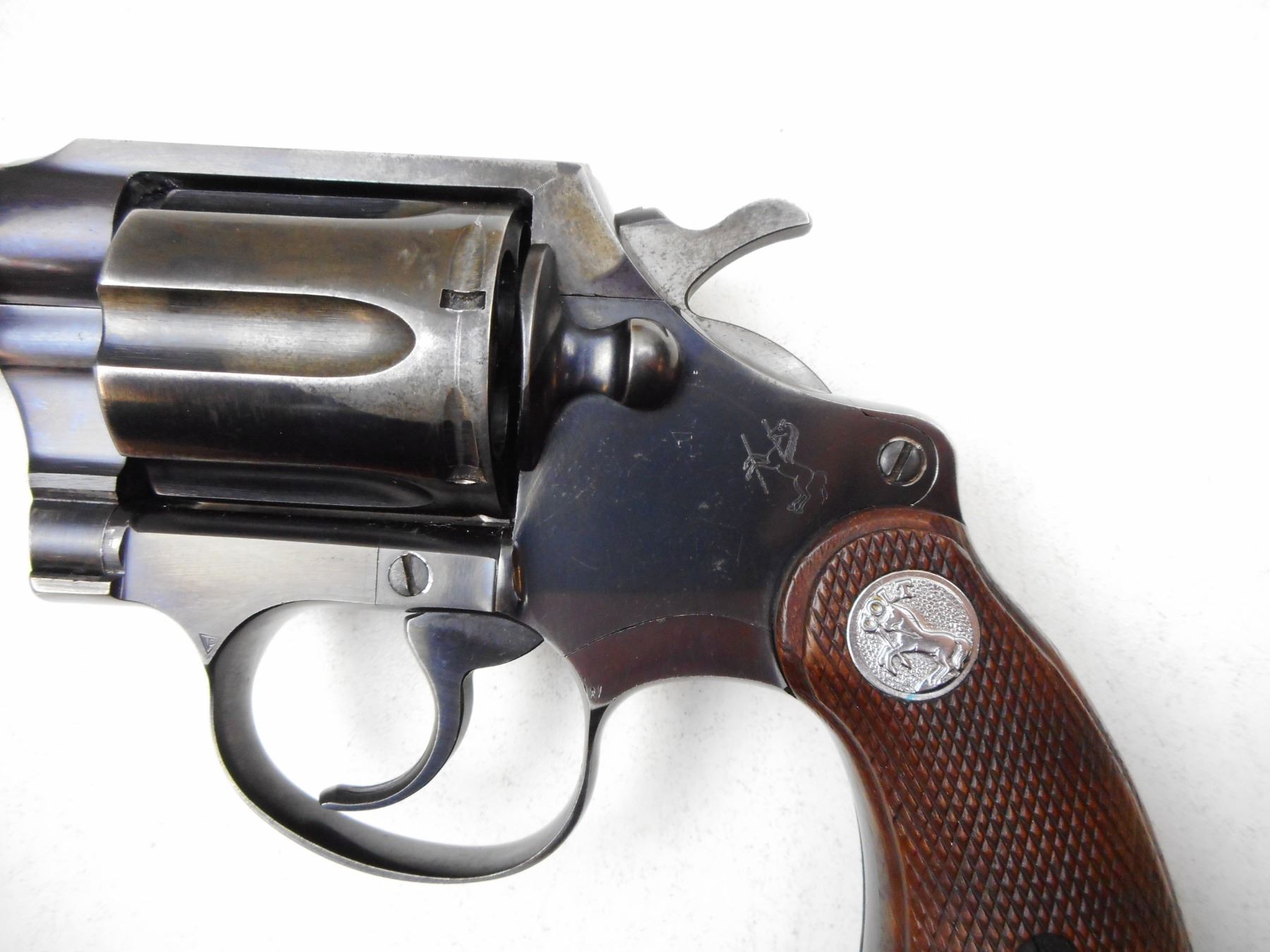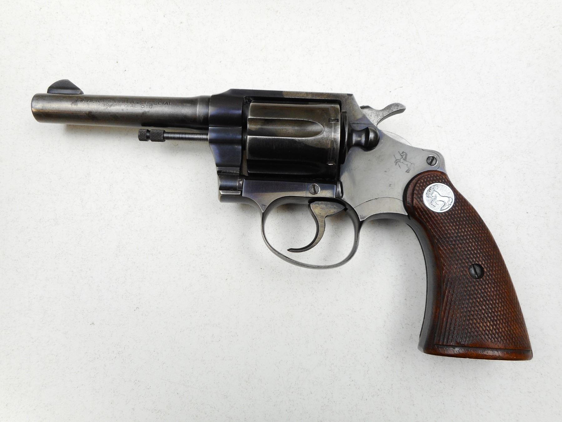 COLT , MODEL: POLICE POSITIVE SPECIAL , CALIBER: 38SPL , COMES WITH HOLSTER, NOTCH & BLADE SIGHT, CHECKEERED WOOD GRIP, BLUE FINISH SHOWING HOLSTER WEAR ON BARREL CYLINDER AND LEFT FRAME, TIGHT LOCKUP AND INDEXES WELL, VERY GOOD BORE , SERIAL # 665690 , ACTION: REVOLVER , BARREL LENGTH: 102MM , CONDITION: 6/10 , STOCK # 2229 , CLASS: CANADIAN PROHIBITED CLASS