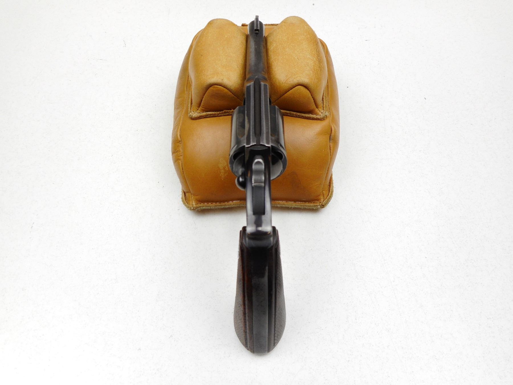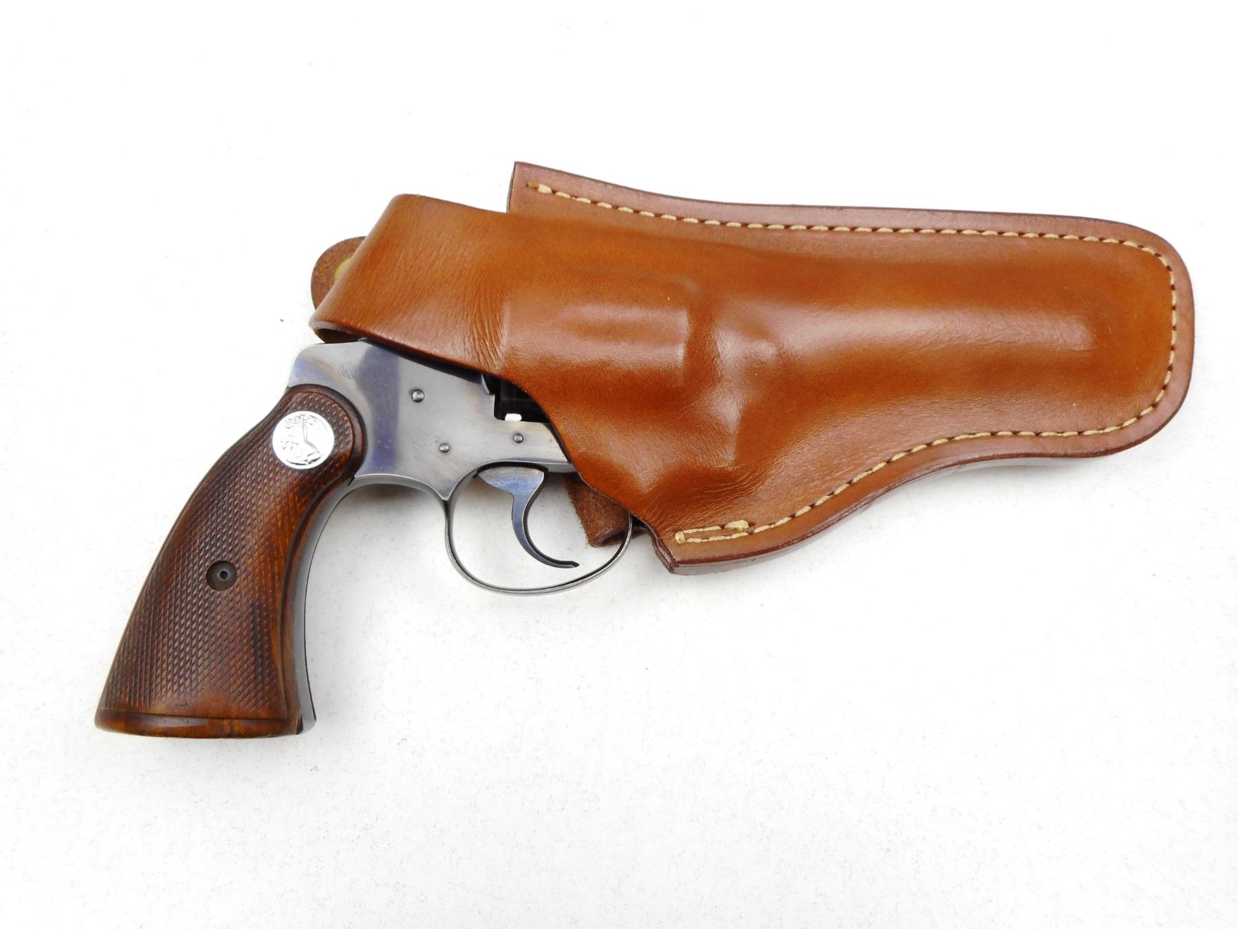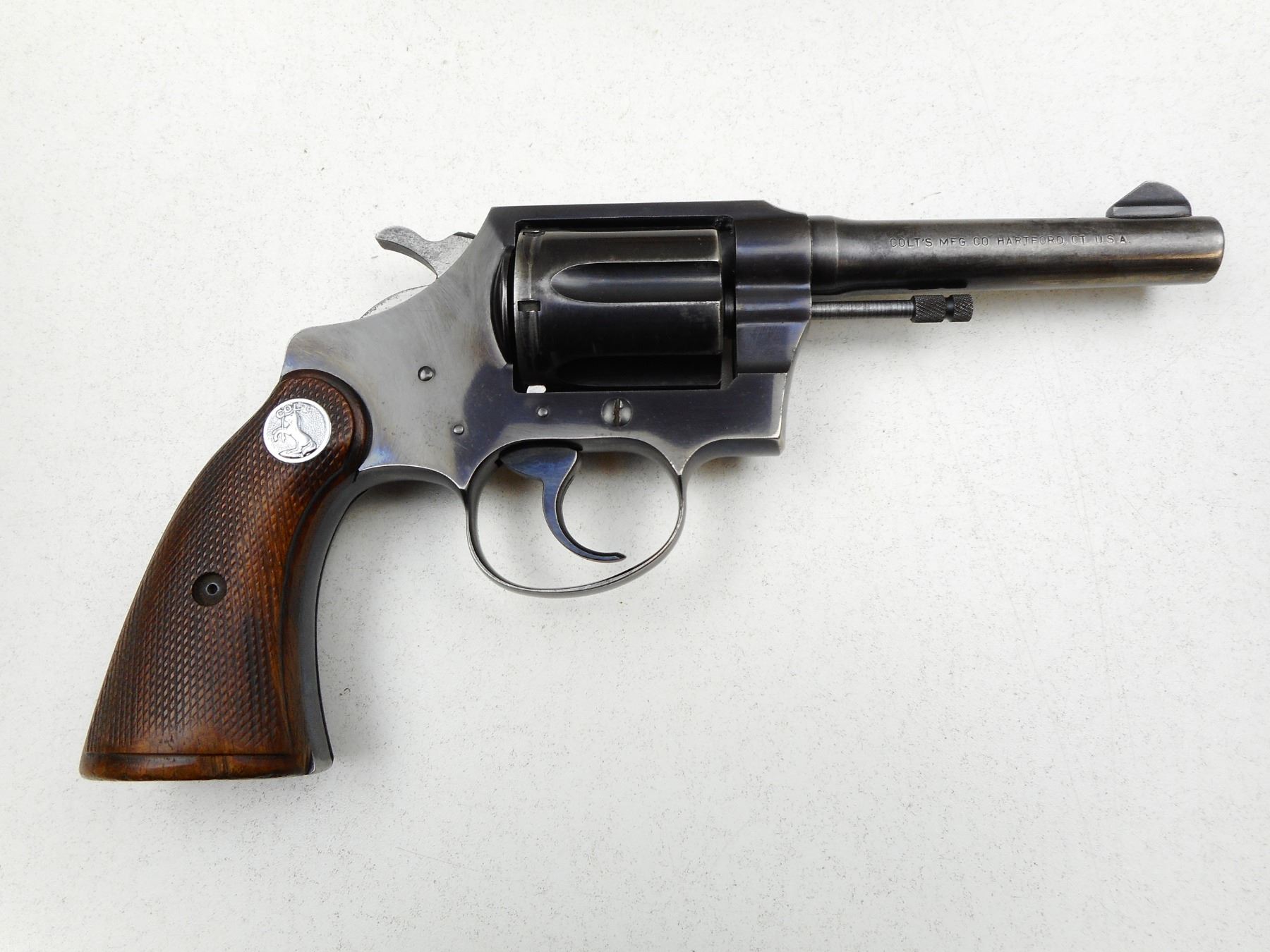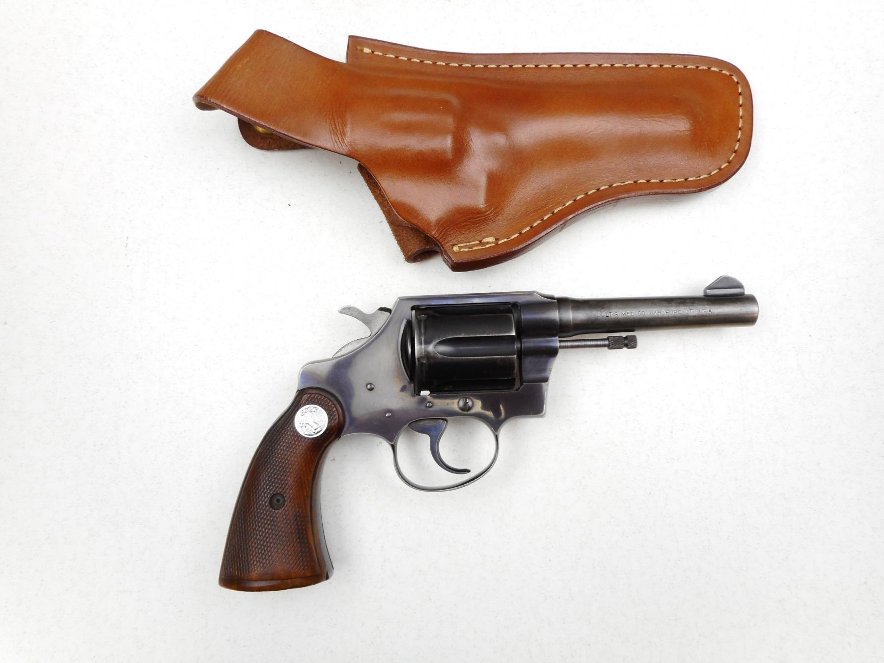 COLT , MODEL: POLICE POSITIVE SPECIAL , CALIBER: 38SPL , COMES WITH HOLSTER, NOTCH & BLADE SIGHT, CHECKEERED WOOD GRIP, BLUE FINISH SHOWING HOLSTER WEAR ON BARREL CYLINDER AND LEFT FRAME, TIGHT LOCKUP AND INDEXES WELL, VERY GOOD BORE , SERIAL # 665690 , ACTION: REVOLVER , BARREL LENGTH: 102MM , CONDITION: 6/10 , STOCK # 2229 , CLASS: CANADIAN PROHIBITED CLASS