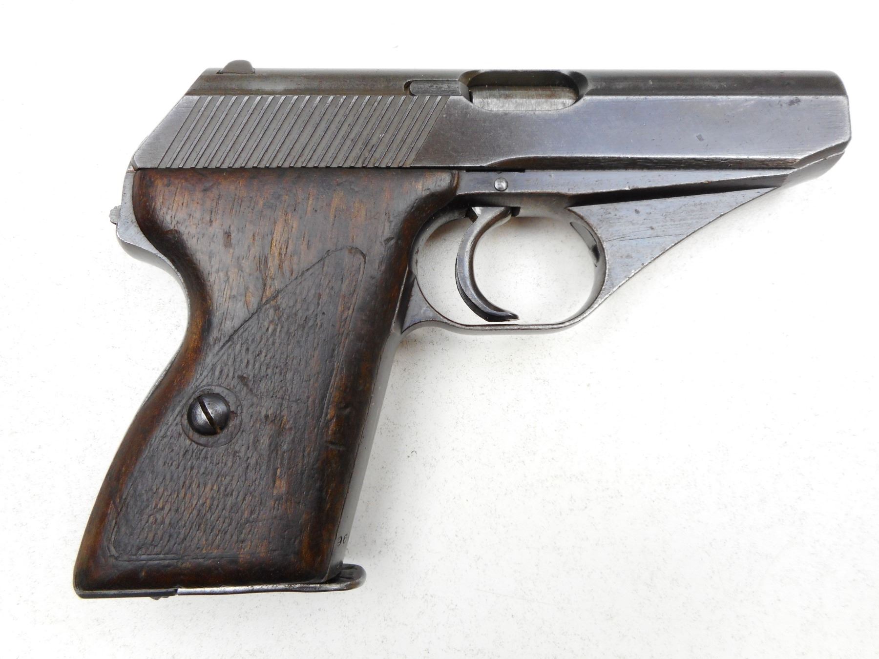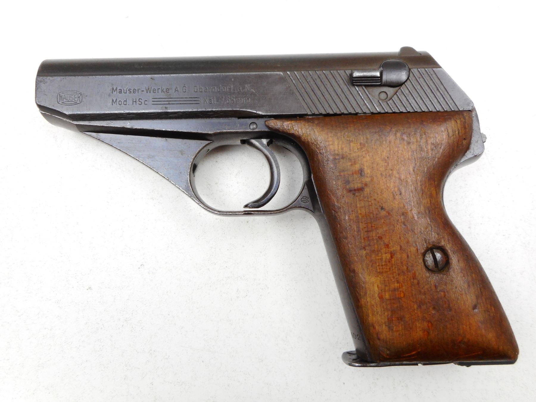 MAUSER , MODEL: HSC , CALIBER: 7.65MM , COMES WITH MAGAZINE, NOTCH & BLADE SIGHTS, CHECKERED WOOD GRIPS, GOOD BORE, BLUE FINISH FADING TO GREY, APPROPRIATE WEAR , SERIAL # 964402 , ACTION: SEMI-AUTOMATIC , BARREL LENGTH: 86MM , CONDITION: 7/10 , STOCK # 2233 , CLASS: CANADIAN PROHIBITED CLASS