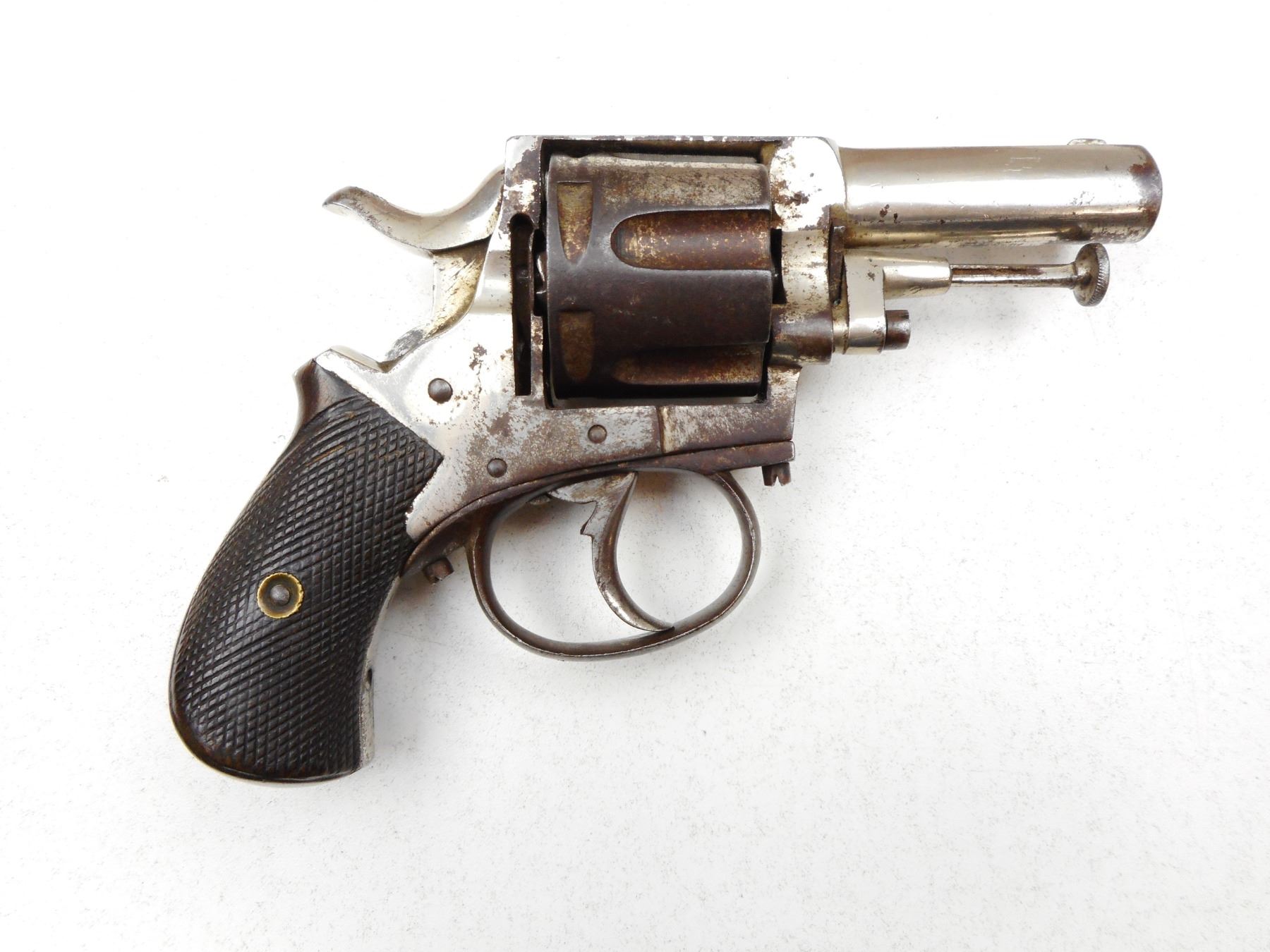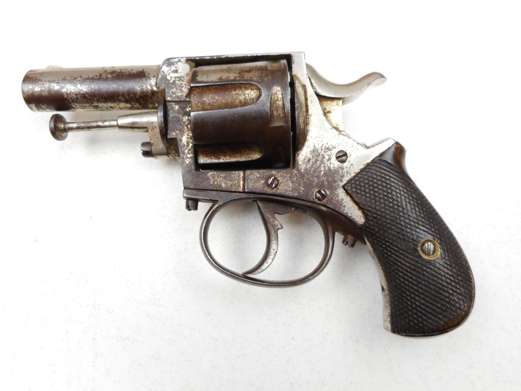 UNKNOWN BELGIAN , MODEL: BRITISH BULL DOG , CALIBER: 38 , NOTCH & BLADE SIGHT, RUSTED/PITTED NICKEL FINISH, DOES NOT INDEX, WOODEN BIRDS HEAD GRIPS , SERIAL # Z23X , ACTION: REVOLVER , BARREL LENGTH: 59MM , CONDITION: 1/10 , STOCK # 2238 , CLASS: CANADIAN PROHIBITED CLASS