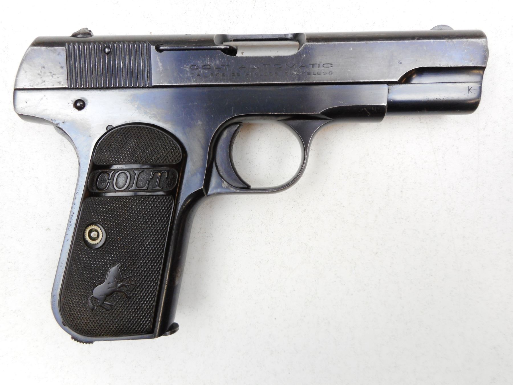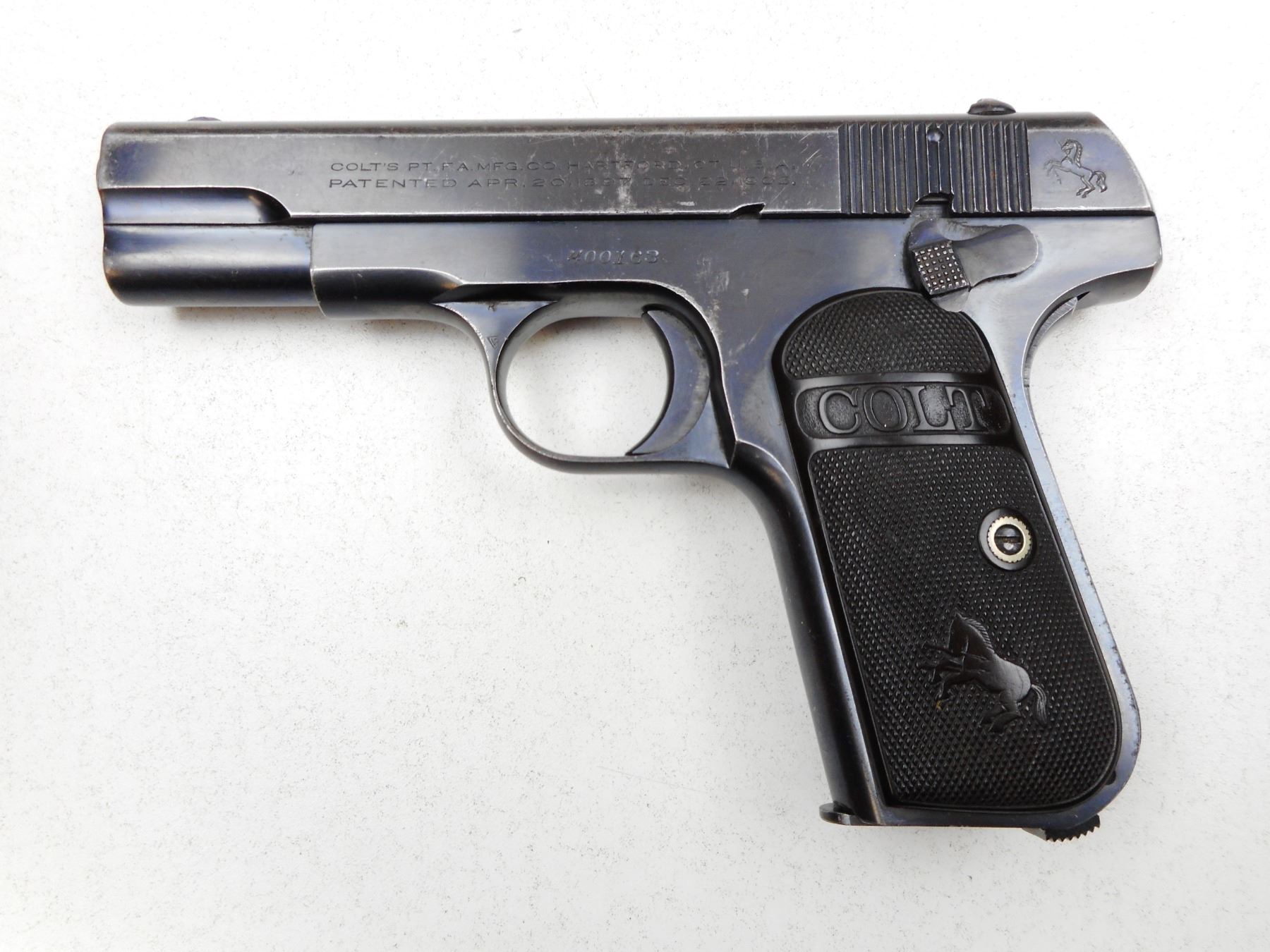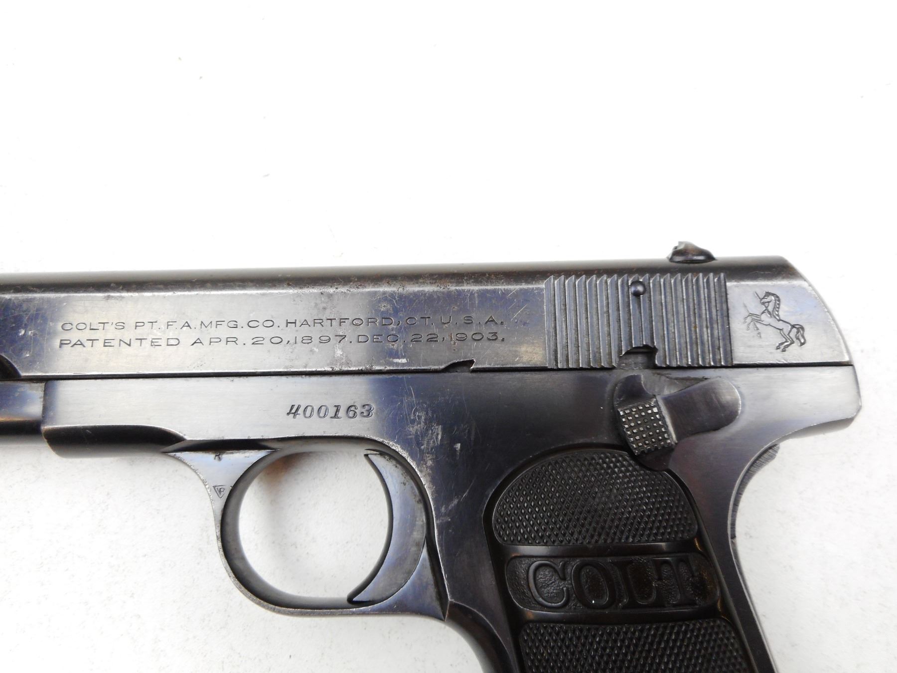 COLT , MODEL: 1903 POCKET HAMMERLESS , CALIBER: 32ACP , COMES WITH MAGAZINE, NOTCH & BLADE SIGHTS, BLACK HARD RUBBER CHECKERED GRIPS, BLUE FINISH SHOWING APPROPRIATE AGE RELATED WEAR, GOOD BORE, GRIP SAFETY , SERIAL # 400163 , ACTION: SEMI-AUTOMATIC , BARREL LENGTH: 95MM , CONDITION: 7/10 , STOCK # 2240 , CLASS: CANADIAN PROHIBITED CLASS