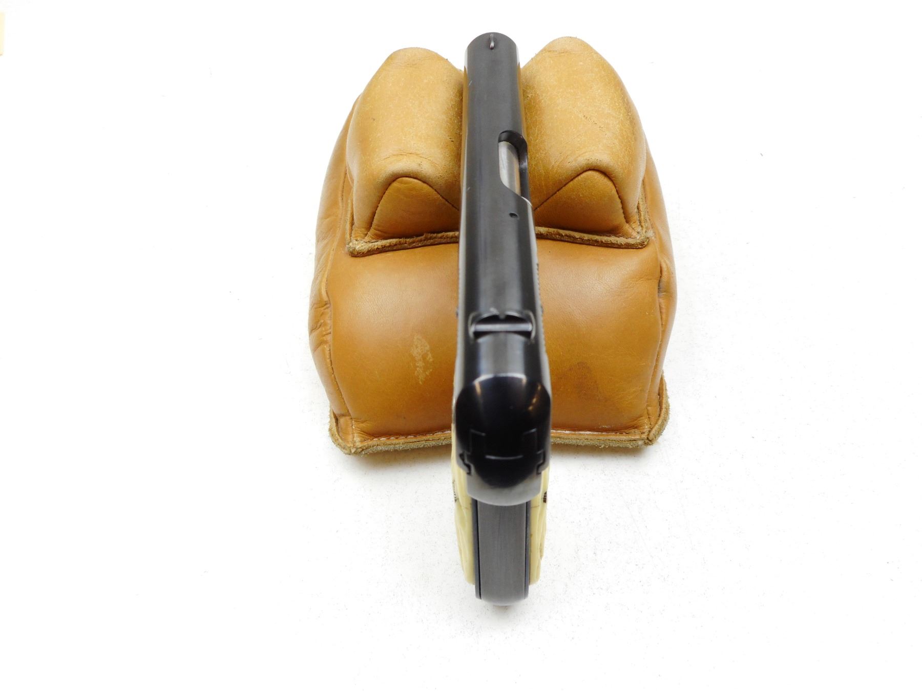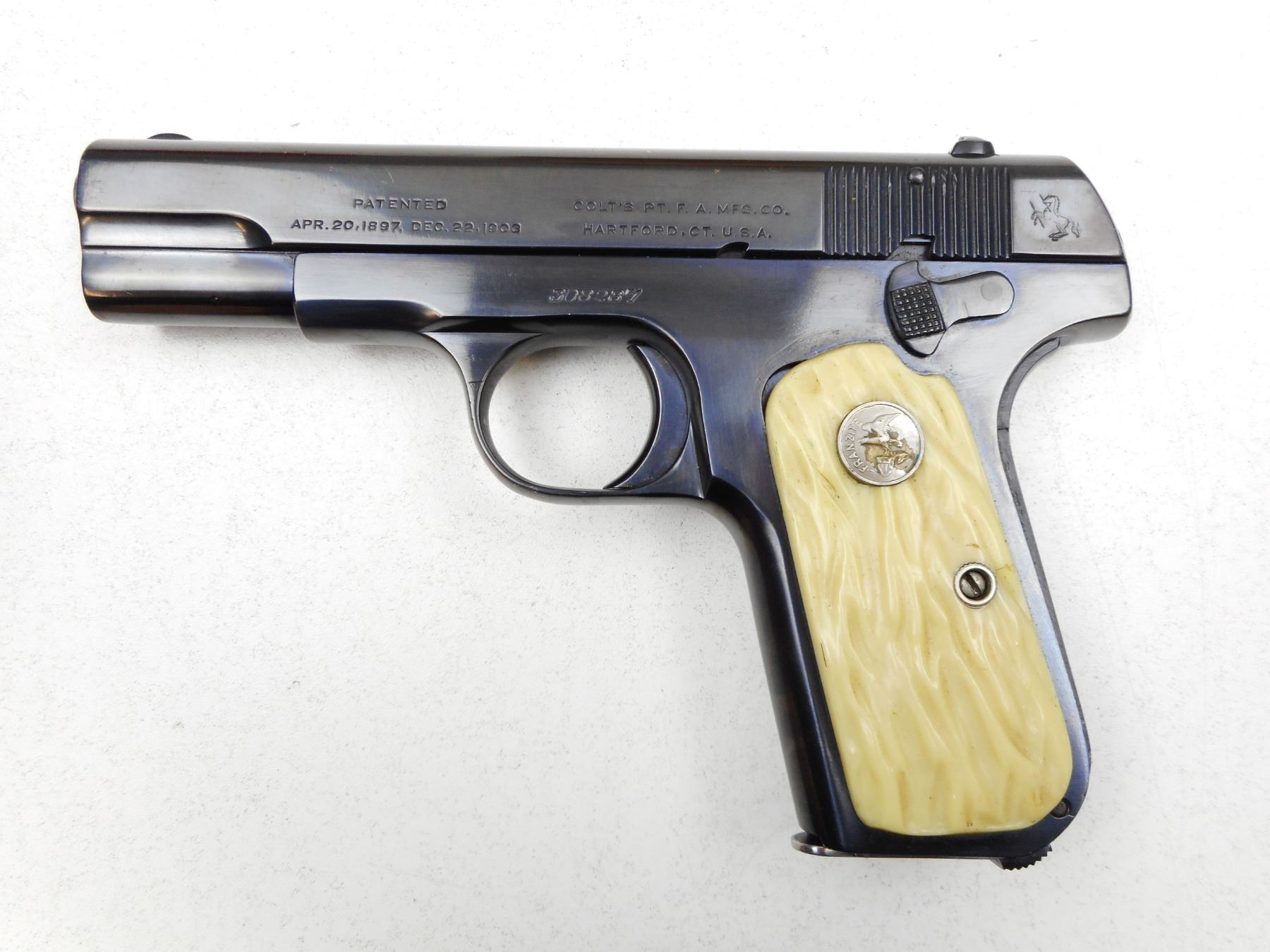 COLT , MODEL: 1903 POCKET HAMMERLESS , CALIBER: 32ACP , COMES WITH MAGAZINE, NOTCH & BLADE SIGHTS, REPLACEMENT PLASTIC GRIPS, REBLUED WITH HIGH POLISH, GOOD BORE, GRIP SAFETY , SERIAL # 308287 , ACTION: SEMI-AUTOMATIC , BARREL LENGTH: 95MM , CONDITION: 7/10 , STOCK # 2241 , CLASS: CANADIAN PROHIBITED CLASS