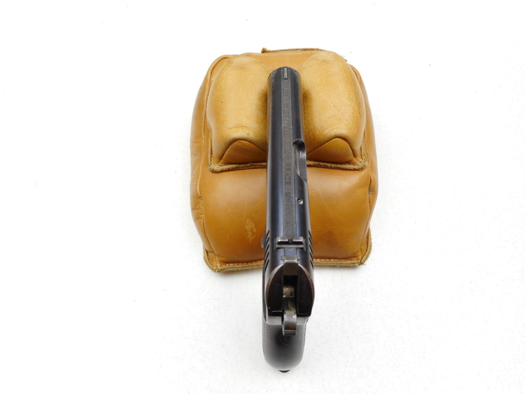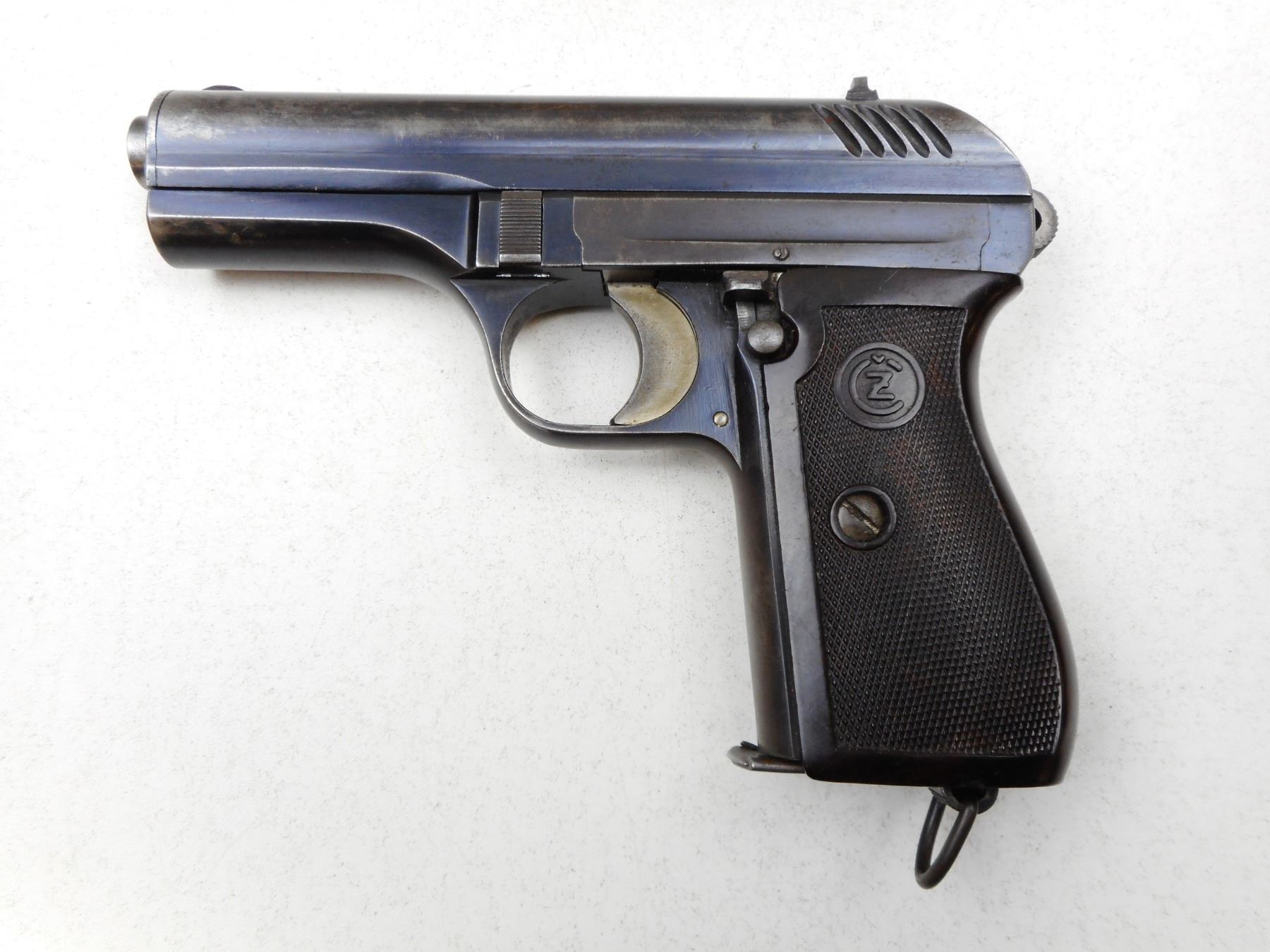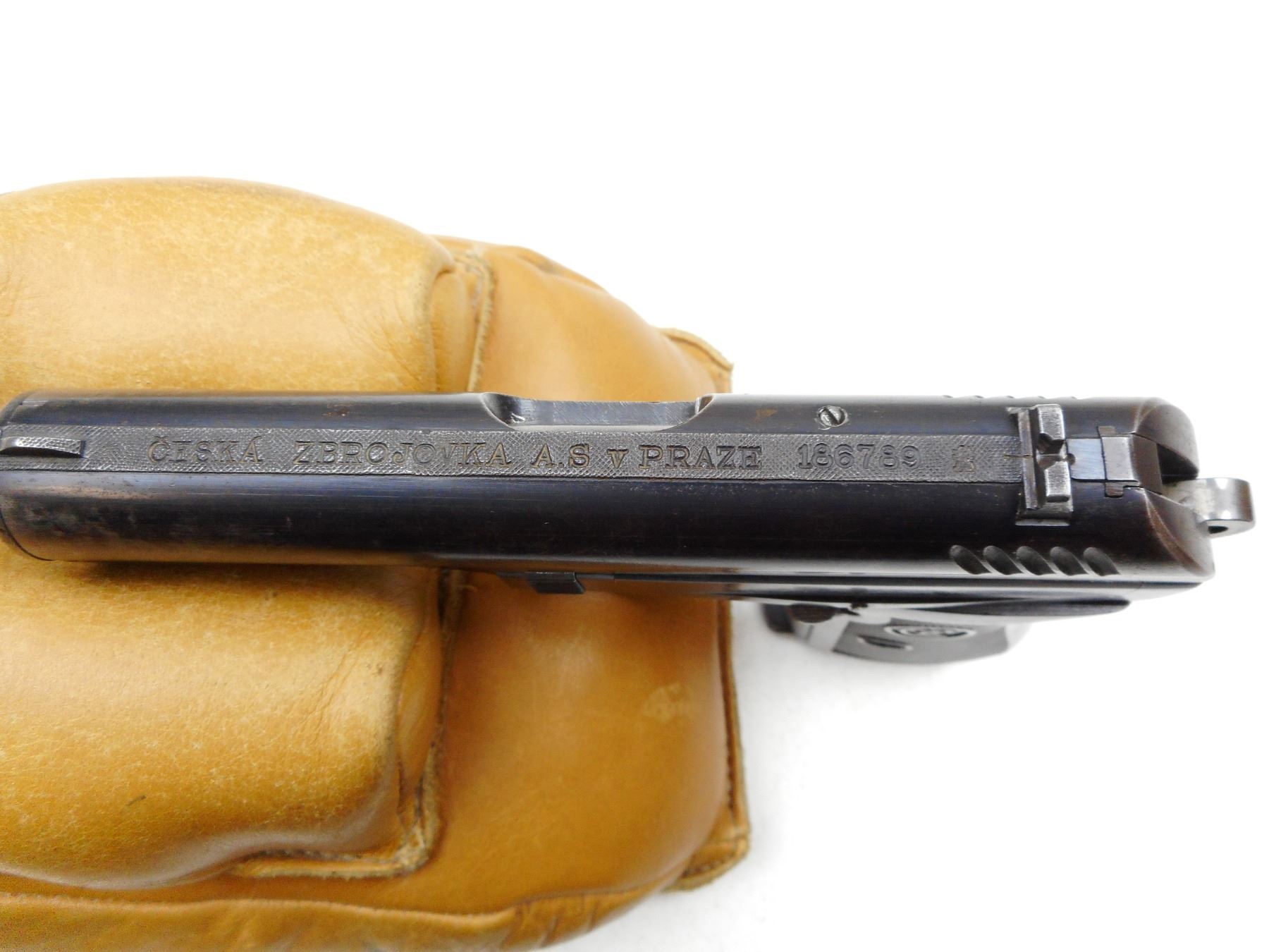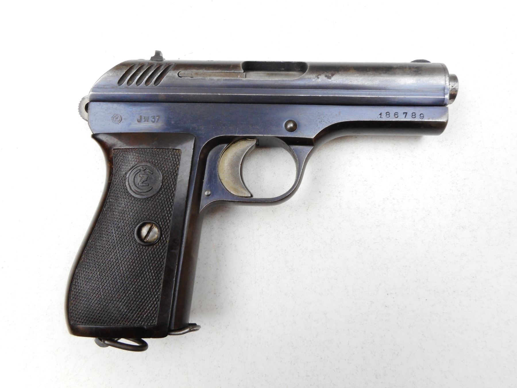 CZ , MODEL: MODEL 24 , CALIBER: 9MM BROWNING COURT , COMES WITH MAGAZINE, NOTCH & BLADE SIGHTS, WRAP AROUND HARD RUBBER CHECKERED GRIP, LANYARD RING, BLUE FINISH SHOWING HOLSTER WEAR TO GREY ON FRONT OF SLIDE, GOOD BORE , SERIAL # 186789 , ACTION: SEMI-AUTOMATIC , BARREL LENGTH: 90MM , CONDITION: 6/10 , STOCK # 2242 , CLASS: CANADIAN PROHIBITED CLASS