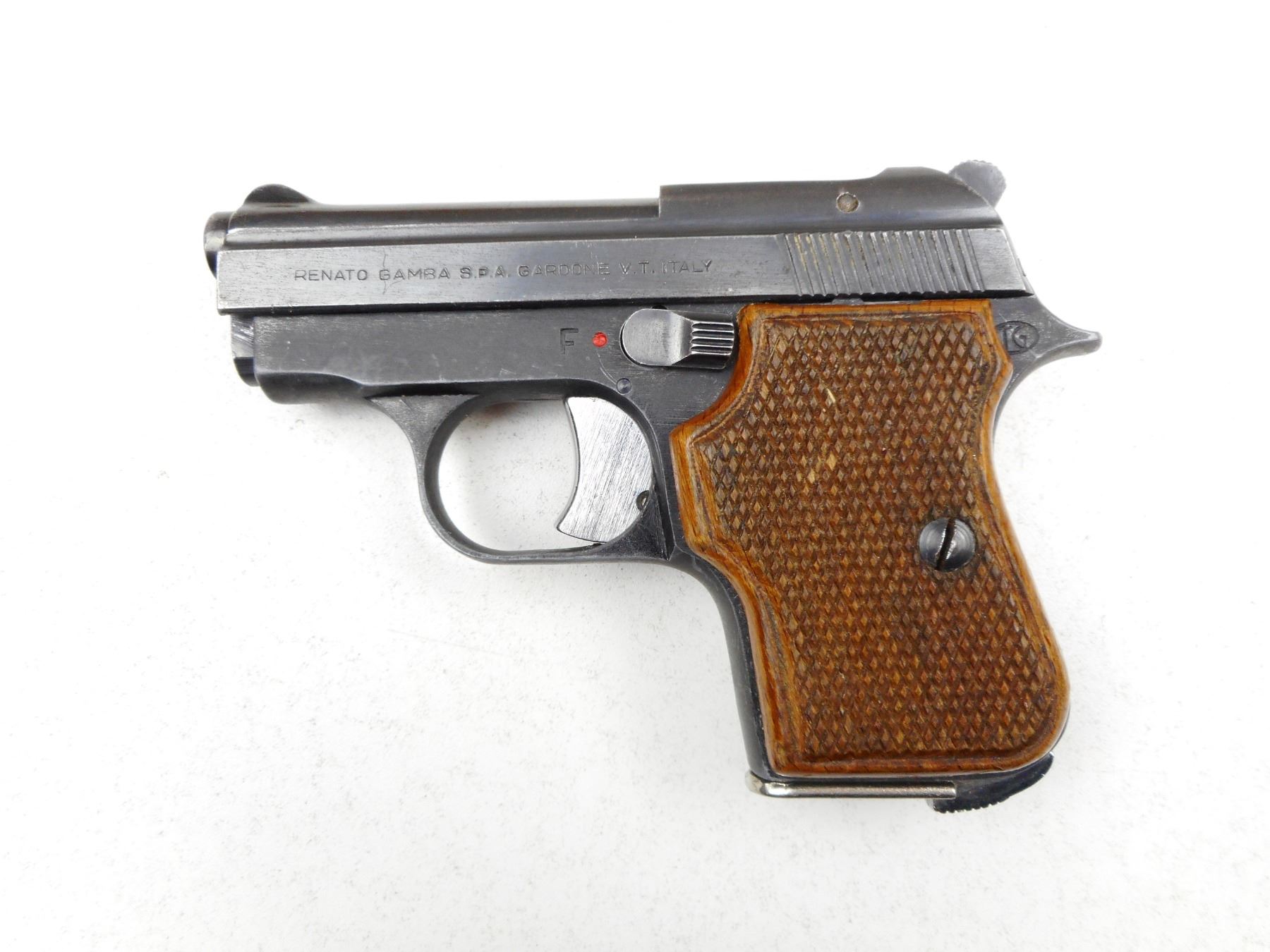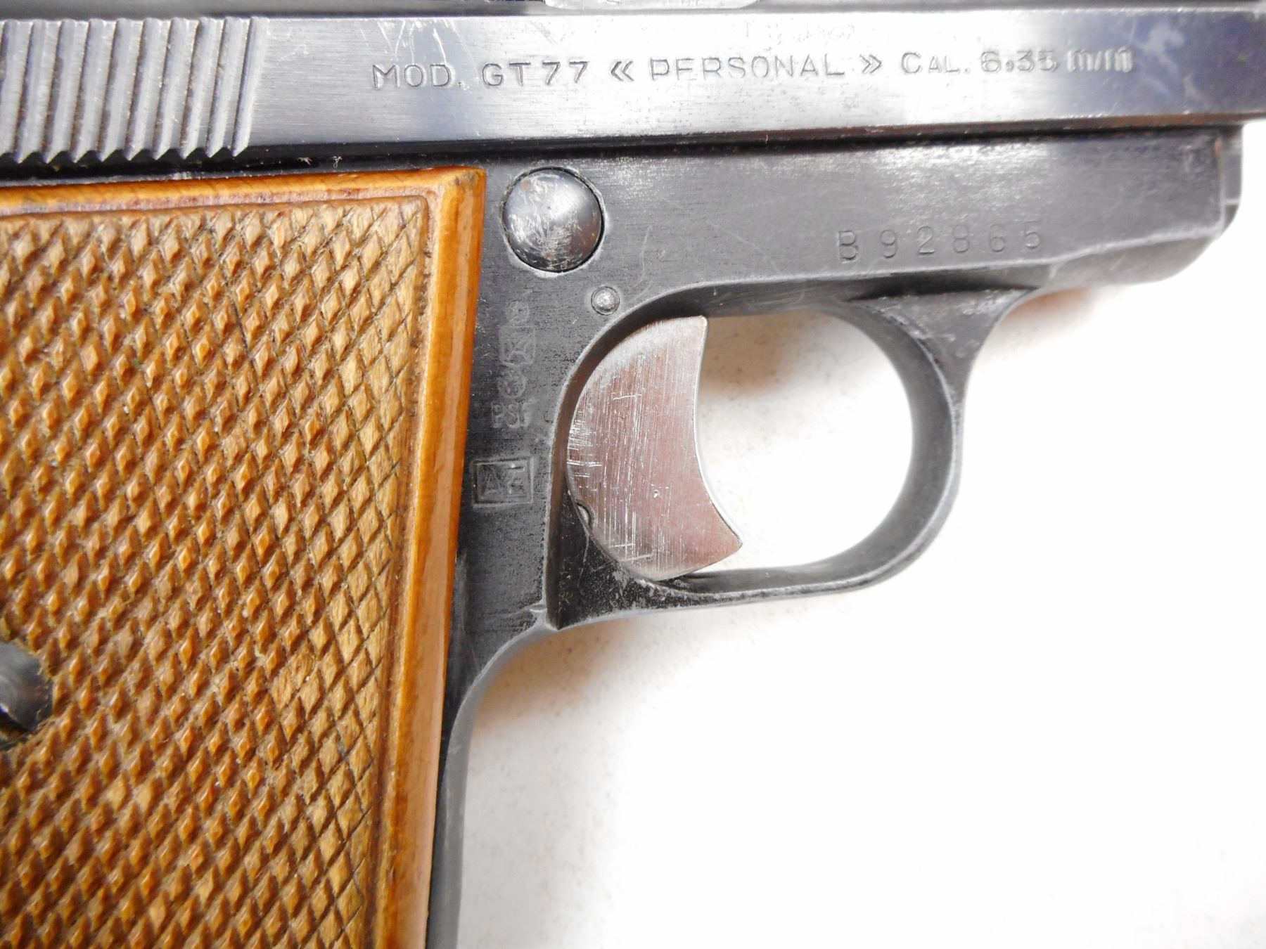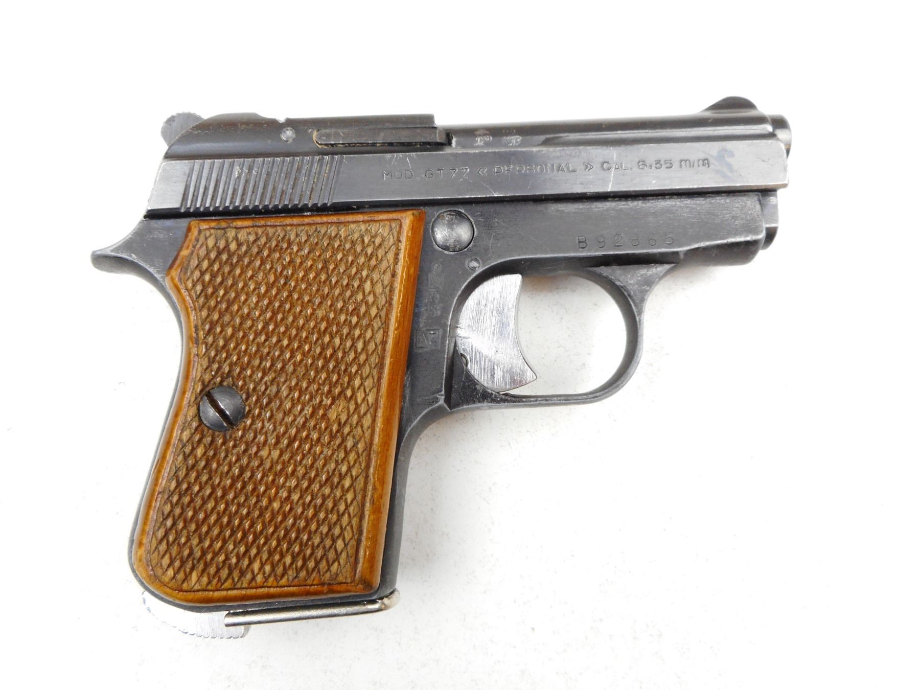 GAMBA , MODEL: GT77 PERSONAL , CALIBER: 6.35MM , COMES WITH MAGAZINE, NOTCH & BLADE SIGHT, CHECKERED WOOD GRIP, GOOD BORE, BLUE FINISH WITH MINOR WEAR. , SERIAL # B92865 , ACTION: SEMI-AUTOMATIC , BARREL LENGTH: 62MM , CONDITION: 7/10 , STOCK # 2244 , CLASS: CANADIAN PROHIBITED CLASS