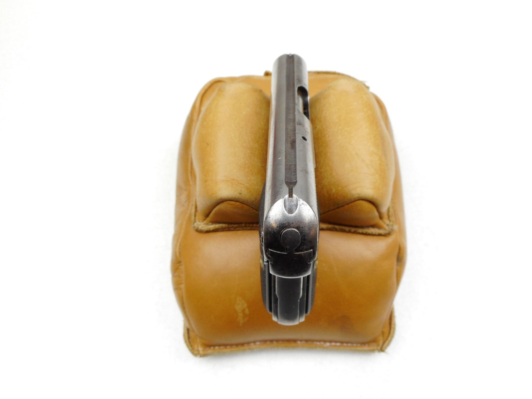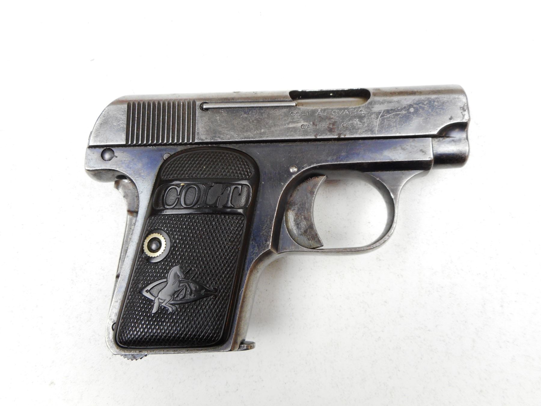 COLT , MODEL: 1908 VEST POCKET HAMMERLESS , CALIBER: 25ACP , COMES WITH MAGAZINE, NOTCH & BLADE SIGHT, CHECKERED HARD RUBBER GRIPS, GOOD BORE, BLUE FINISH SHOWING WEAR TO GREY, GRIP SAFETY , SERIAL # 98550 , ACTION: SEMI-AUTOMATIC , BARREL LENGTH: 51MM , CONDITION: 5/10 , STOCK # 2246 , CLASS: CANADIAN PROHIBITED CLASS