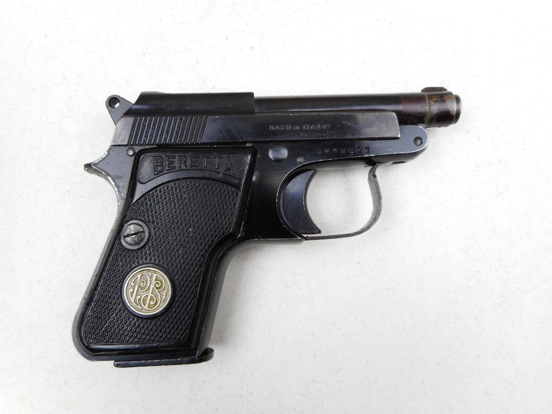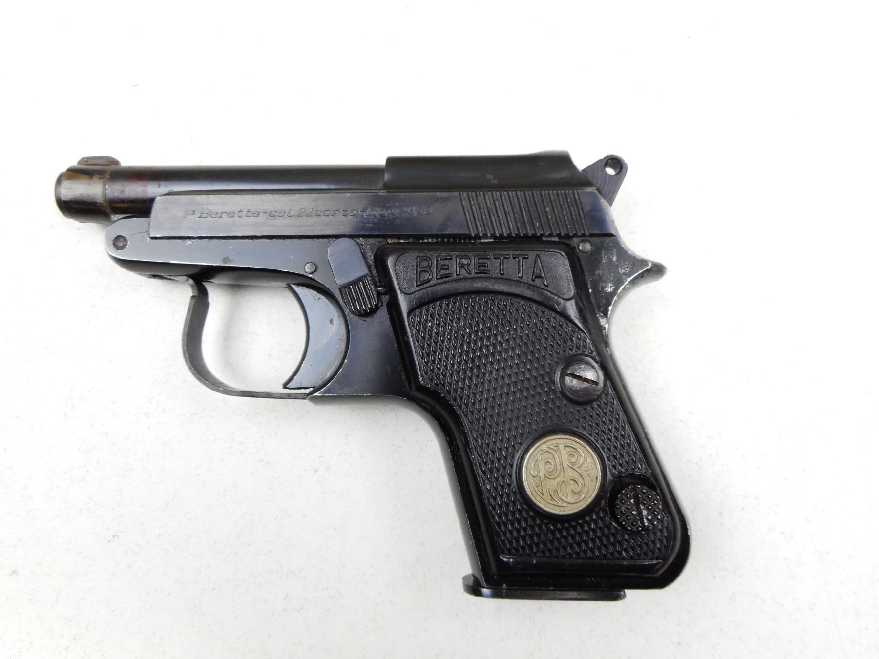BERETTA , MODEL: 950 , CALIBER: 22 SHORT , COMES WITH MAGAZINE, NOTCH & BLADE SIGHT, HARD RUBBER CHECKERED GRIPS, GOOD BORE, BLUE FINISH WITH WEAR APPROPRIATE , SERIAL # 60934CC , ACTION: SEMI-AUTOMATIC , BARREL LENGTH: 60MM , CONDITION: 7/10 , STOCK # 2247 , CLASS: CANADIAN PROHIBITED CLASS