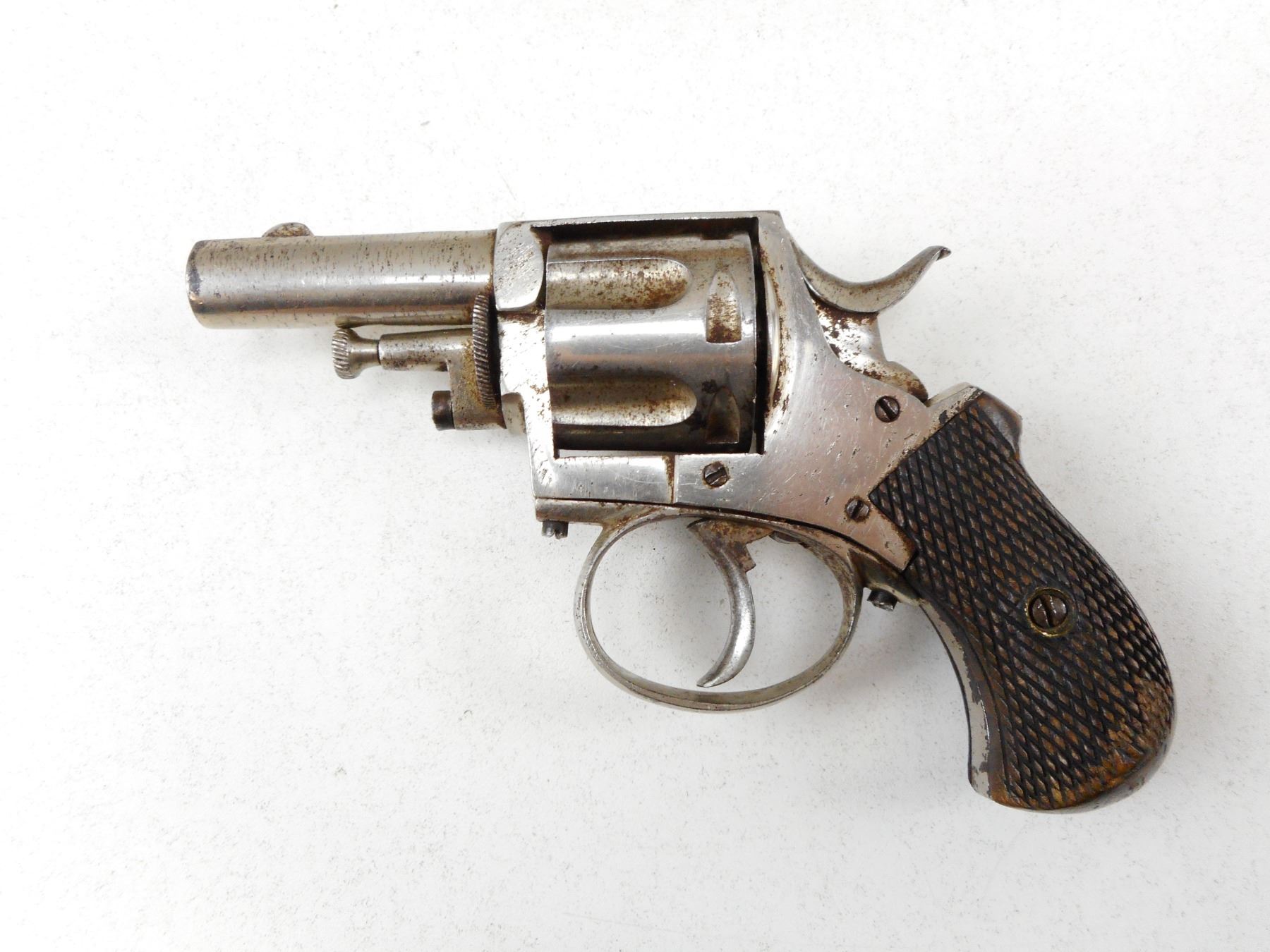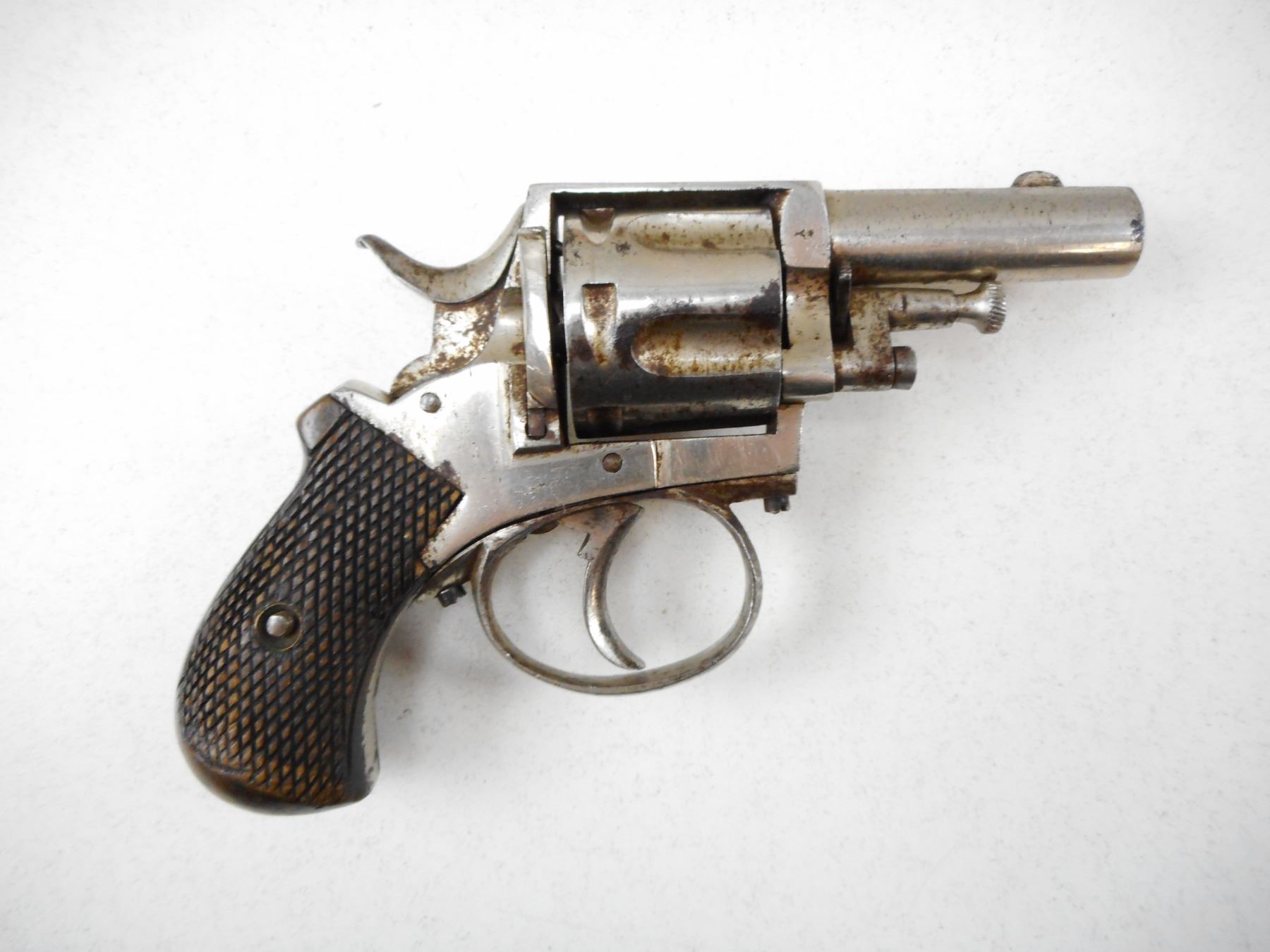BRITISH BULLDOG , MODEL: BRITISH BULL DOG , CALIBER: 32 S&W , UNKNOWN BELGIAN MFG. CHECKERED WOODEN BIRDS HEAD GRIPS, NOTCH & BLADE FIXED SIGHTS, DOUBLE ACTION, TRIGGER RETURN SPRING NOT FUNCTIONAL, NICKEL FINISH HAS SOME RUST AND PITTING , SERIAL # 18595S , ACTION: REVOLVER , BARREL LENGTH: 52MM , CONDITION: 3/10 , STOCK # 2253 , CLASS: CANADIAN PROHIBITED CLASS