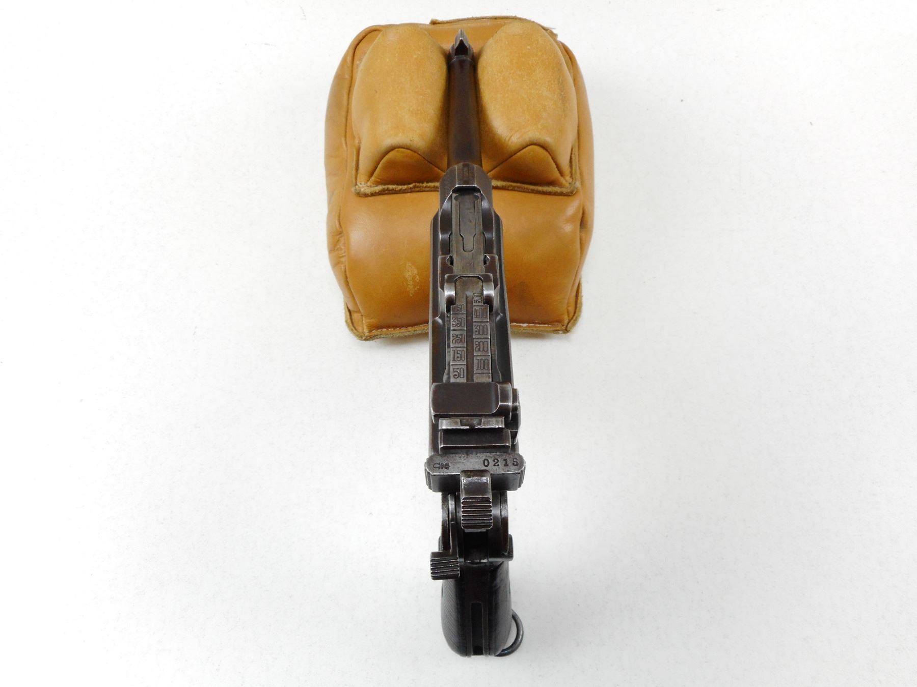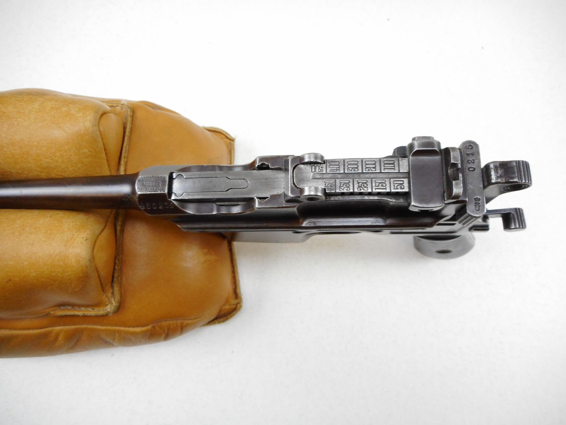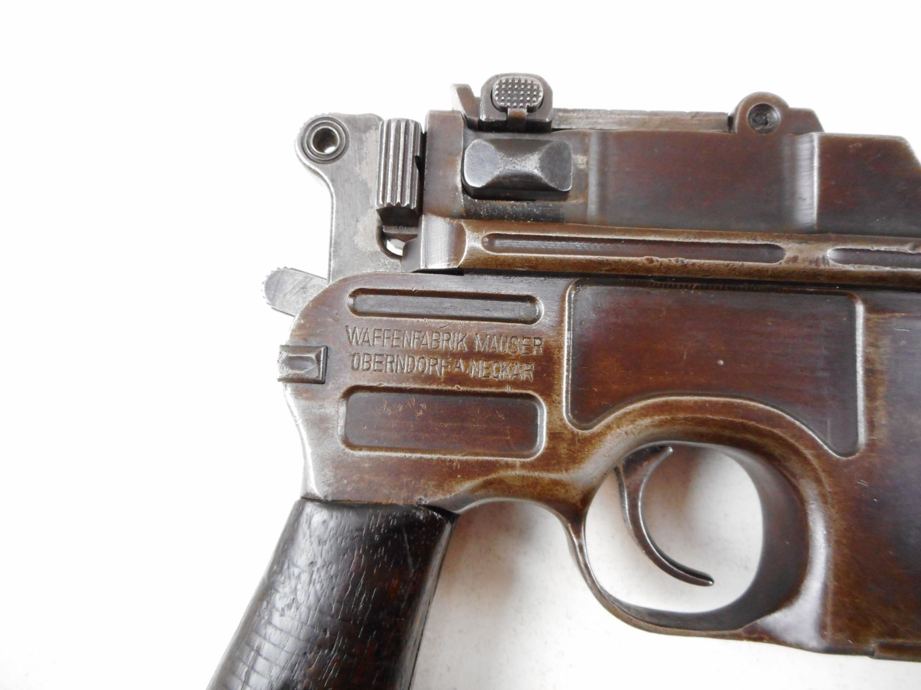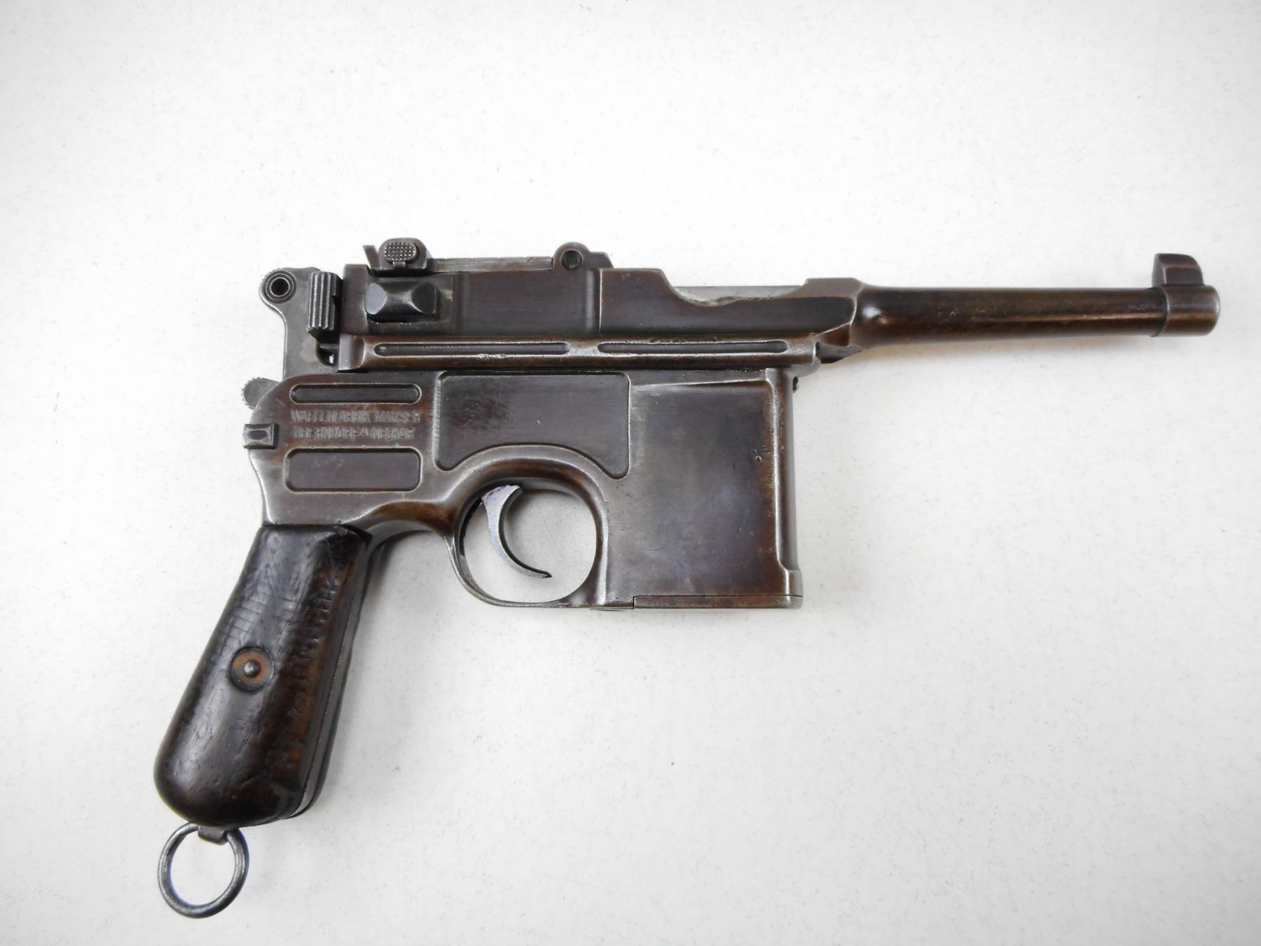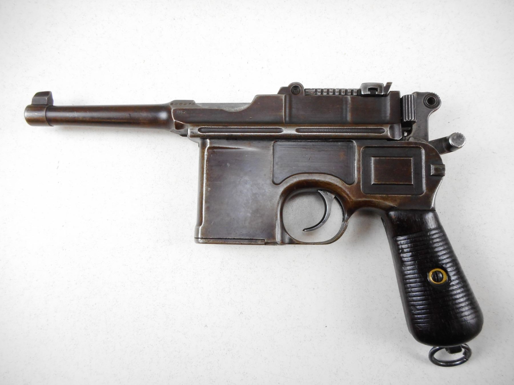 MAUSER , MODEL: C96 BROOMHANDLE BOLO , CALIBER: 7.63MM MAUSER , BOLO MODEL WITH SMALL RING HAMMER AND "NS" SAFETY, GRADUATED 50 - 1000 METER LADDER SIGHTS, LANYARD RING, WOODEN RINGED GRIPS, PITTED BORE WITH VISIBLY WORN RIFLING, BROWN PATINA WITH WEAR APPROPRIATE TO AGE MATCHING NUMBERS , SERIAL # 450215 , ACTION: SEMI-AUTOMATIC , BARREL LENGTH: 99MM , CONDITION: 4/10 , STOCK # 2260 , CLASS: CANADIAN PROHIBITED CLASS