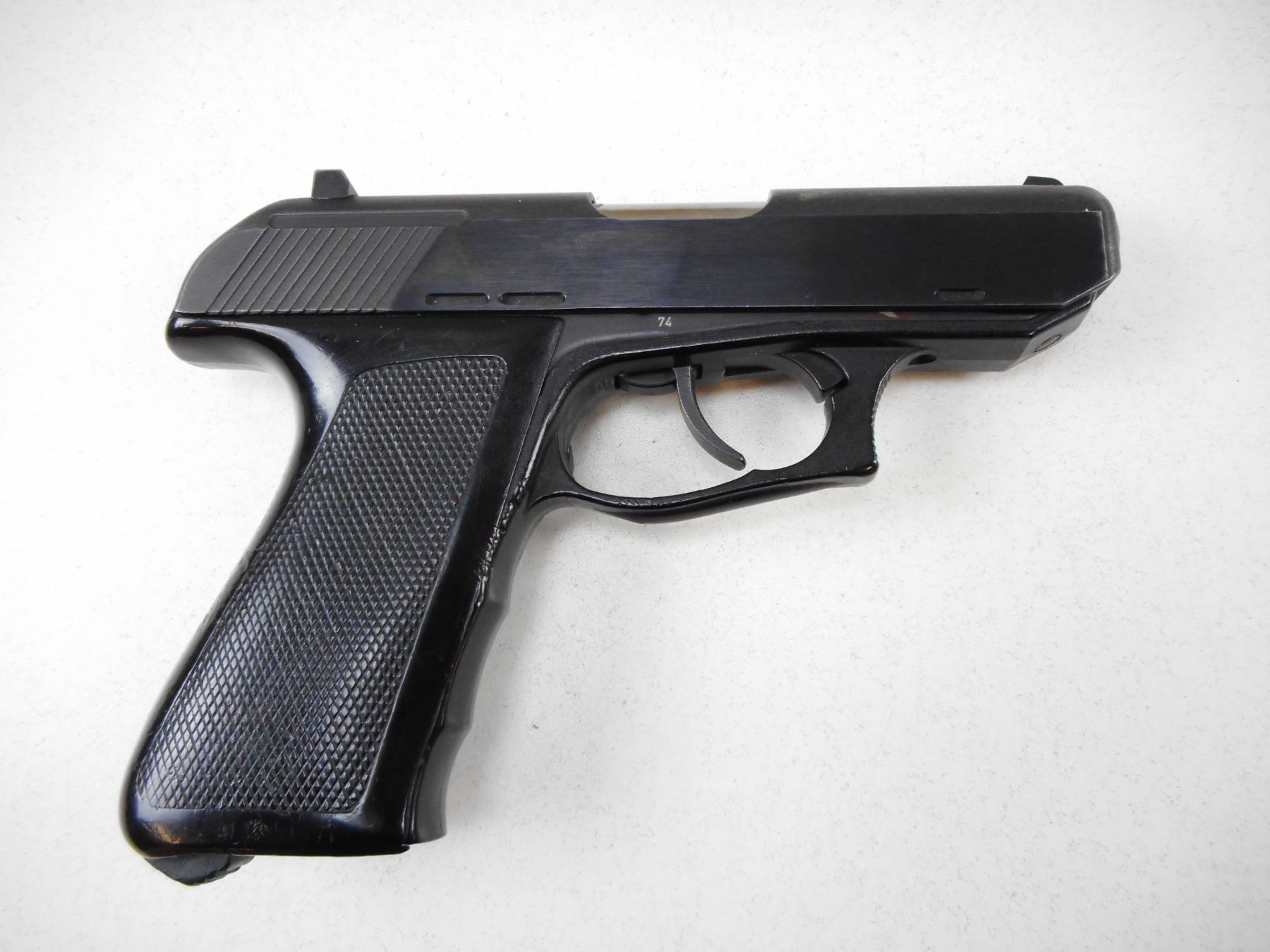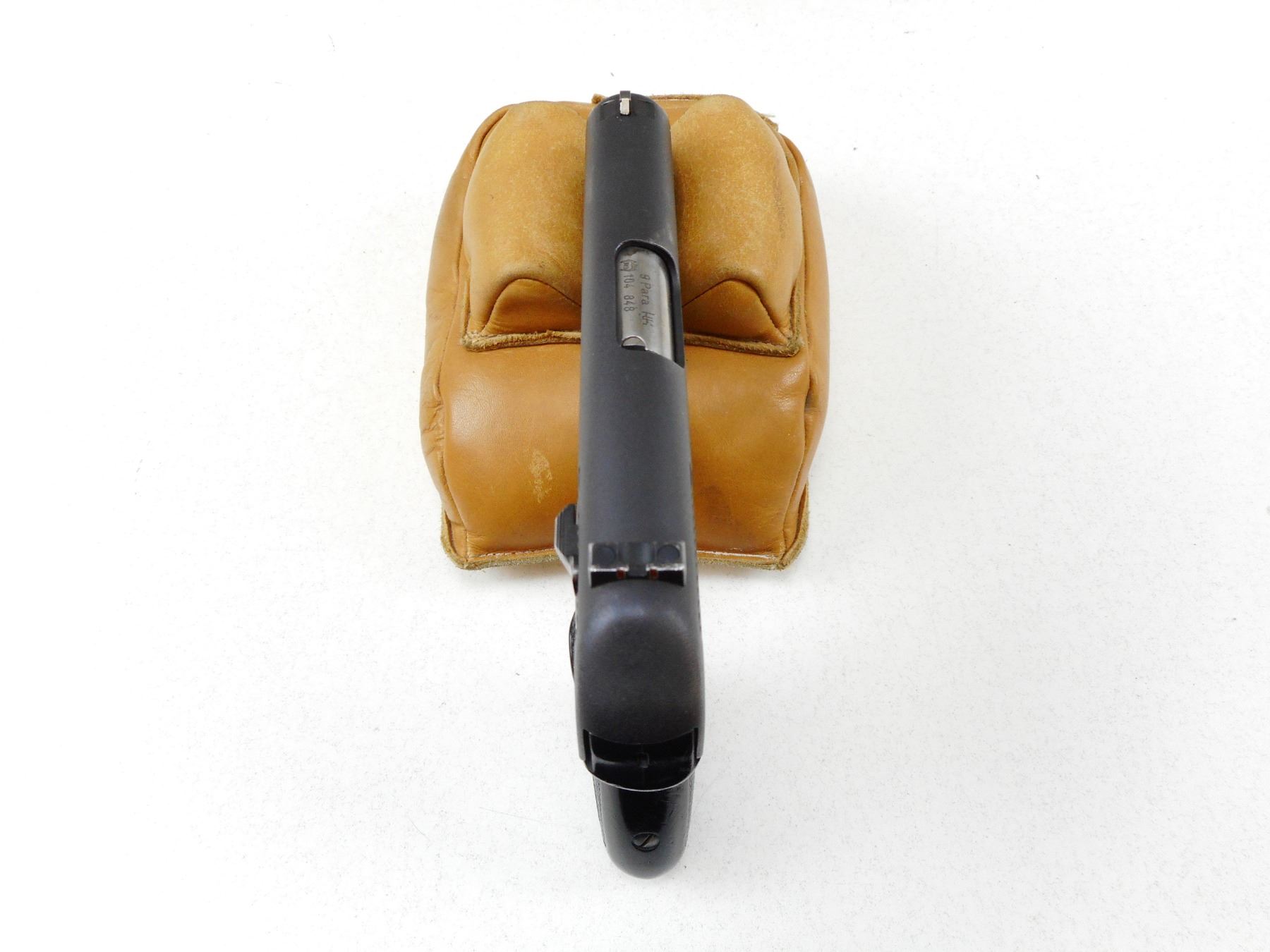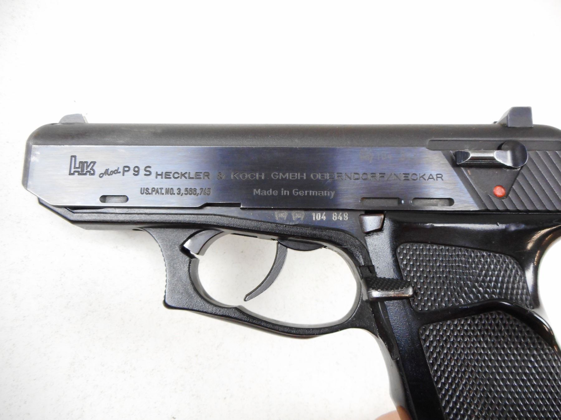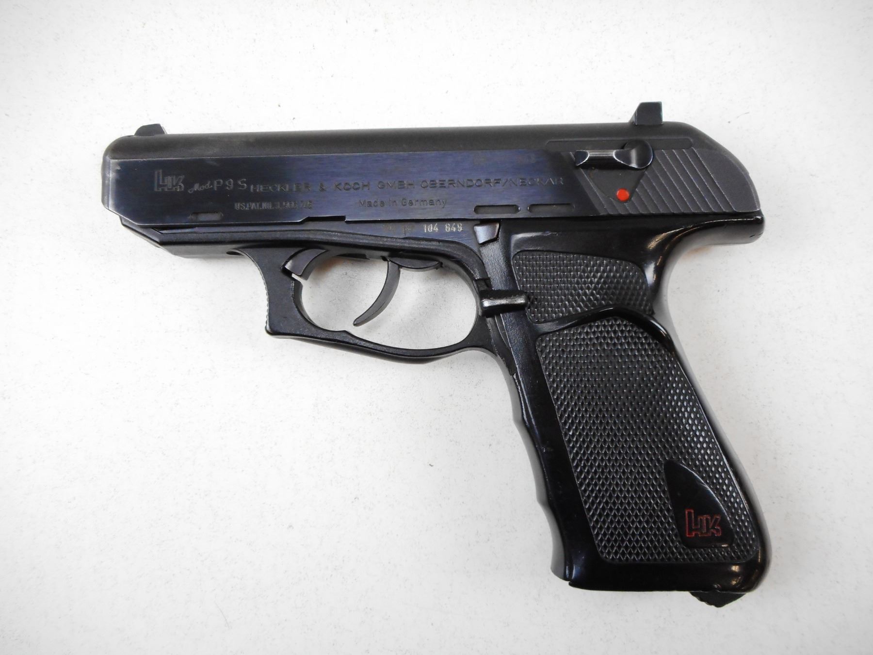 HECKLER & KOCH , MODEL: P9S , CALIBER: 9MM LUGER , NO MAGAZINE, FIXED NOTCH & BLADE SIGHTS, CHECKERED BLACK PLASTIC WRAP AROUND GRIPS, GOOD BORE, COCKING IDICATOR, WEAR APPROPRIATE TO AGE. , SERIAL # 104848 , ACTION: SEMI-AUTOMATIC , BARREL LENGTH: 102MM , CONDITION: 6/10 , STOCK # 2262 , CLASS: CANADIAN PROHIBITED CLASS