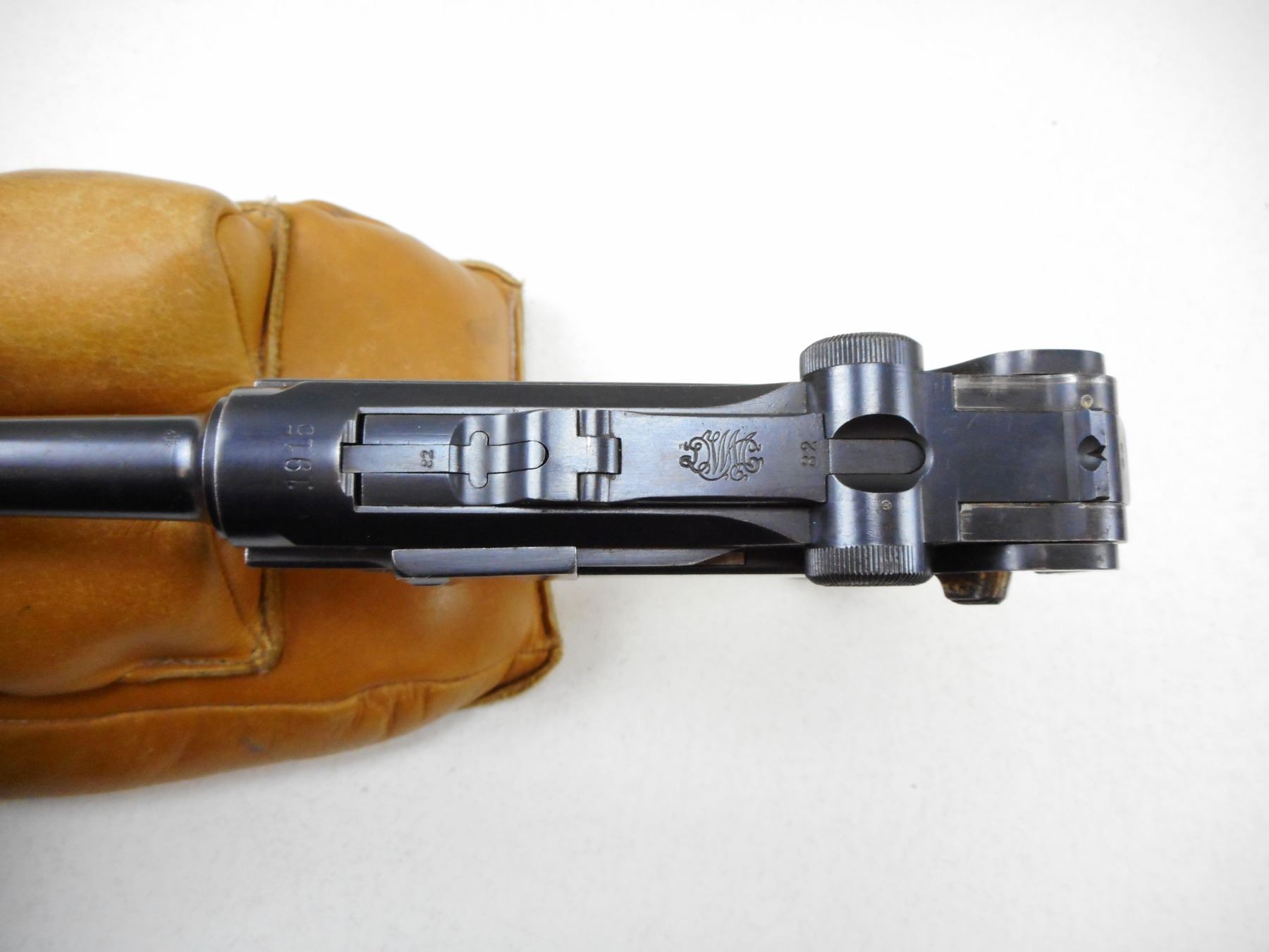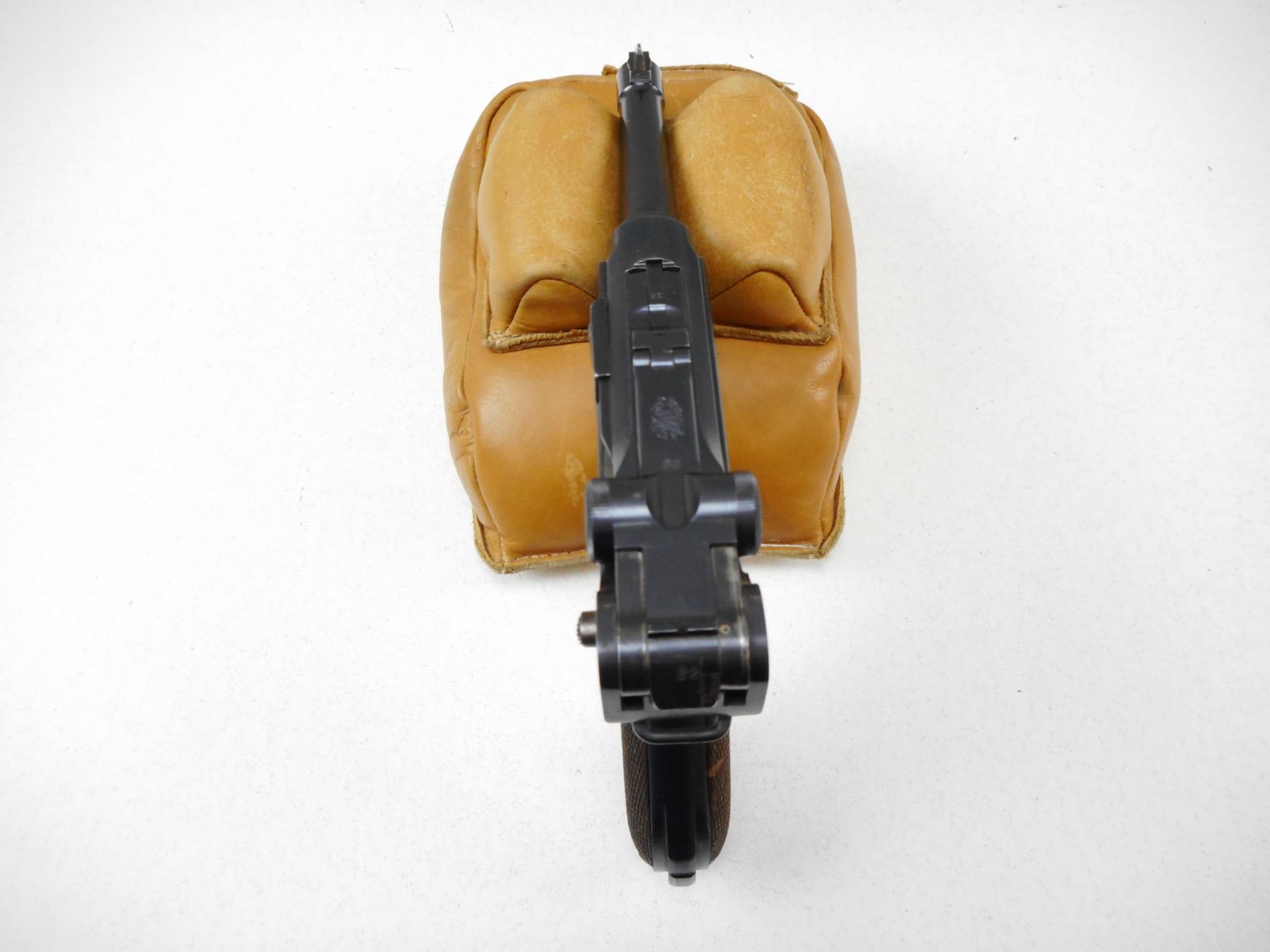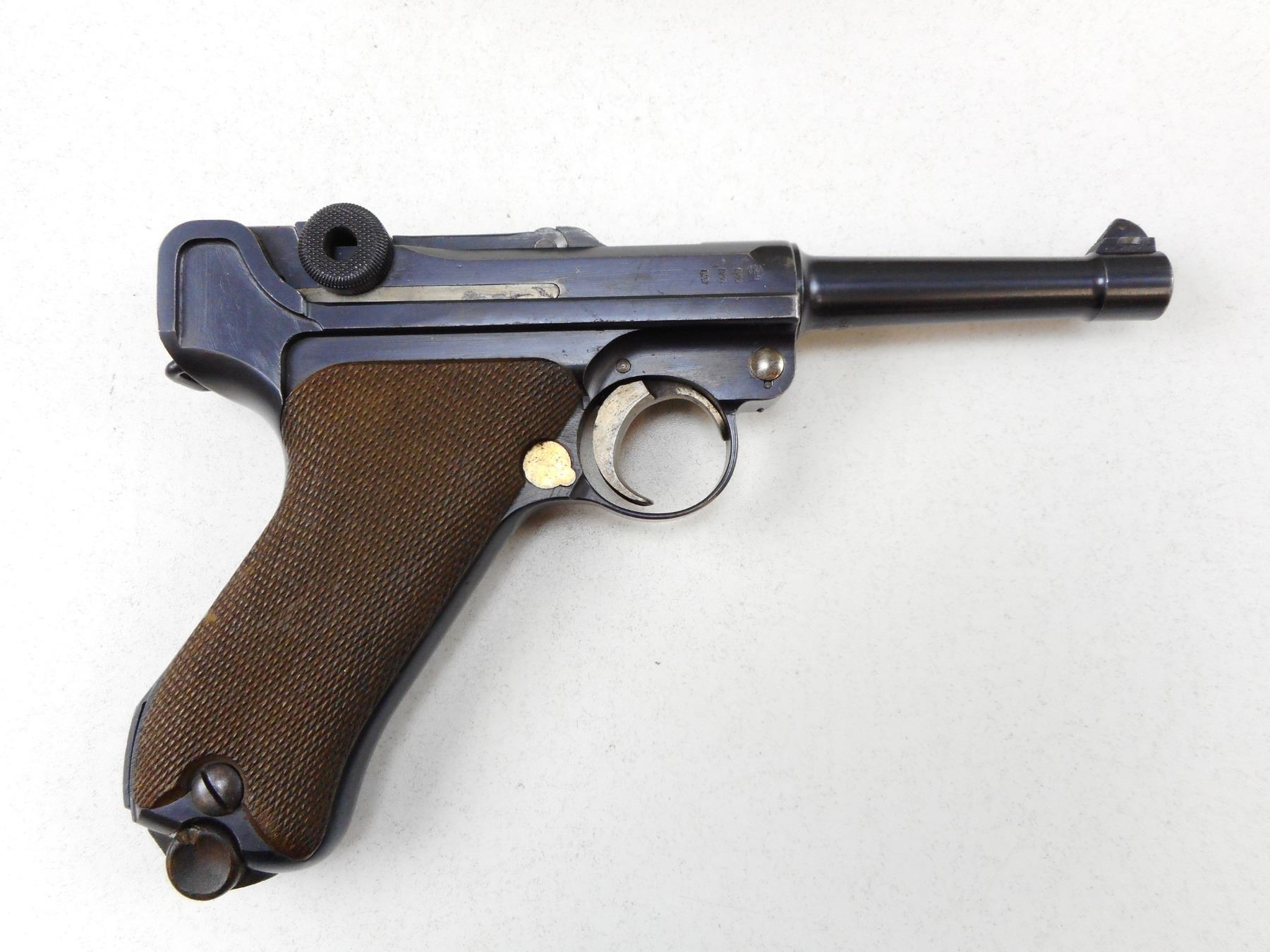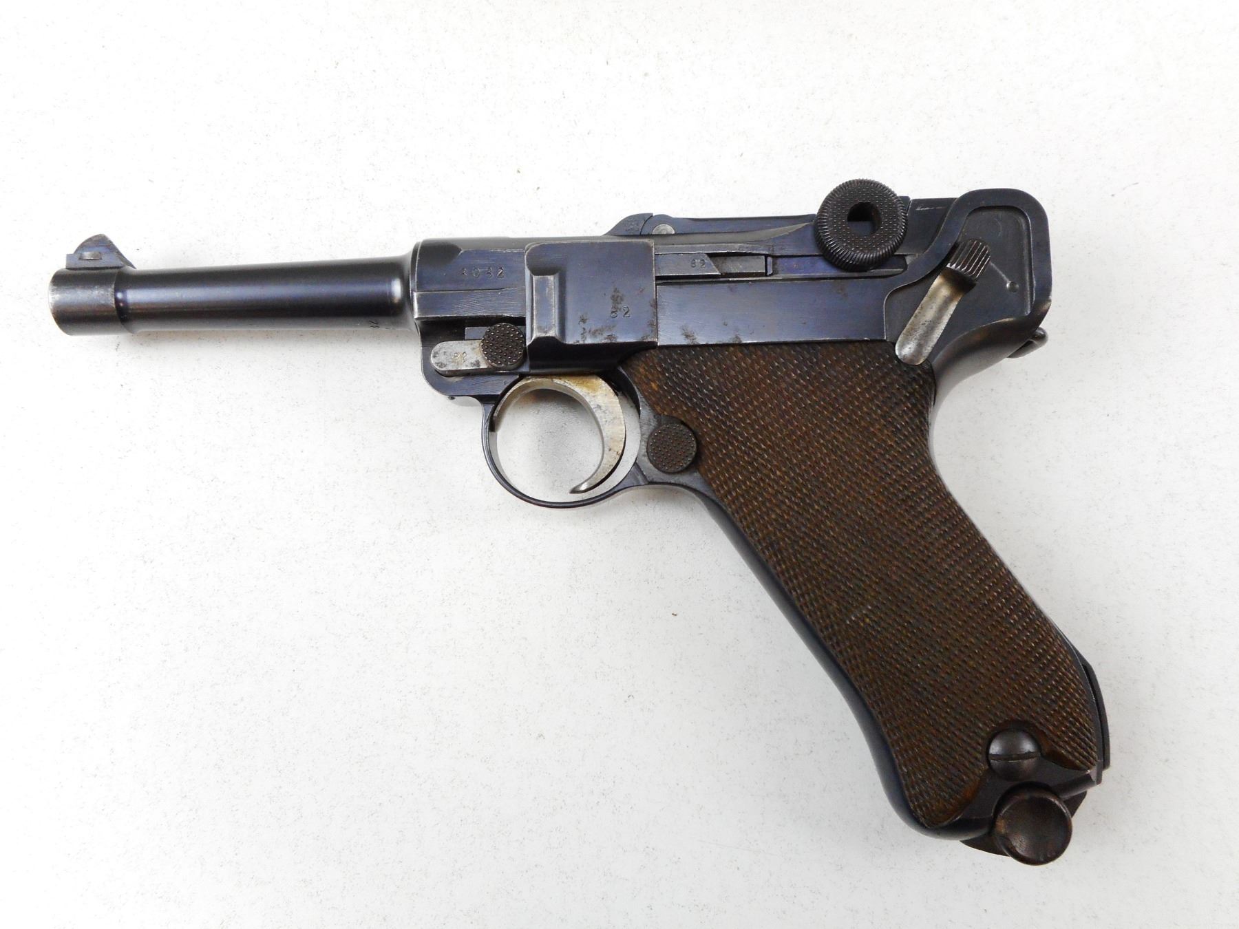LUGER , MODEL: P08 , CALIBER: 9MM , COMES WITH MAGAZINE, DWM FACTORY, DATED 1915, WAFFEN MARKED, ALL #'S WITH EXCEPTION OF MAGAZINE. MATCH, BORE HAS MINOR PITTING, MINOR PITTING ON LEFT SIDE RECEIVER, , SERIAL # 8082E , ACTION: SEMI-AUTOMATIC , BARREL LENGTH: 102MM , CONDITION: 7/10 , STOCK # 2264 , CLASS: CANADIAN PROHIBITED CLASS