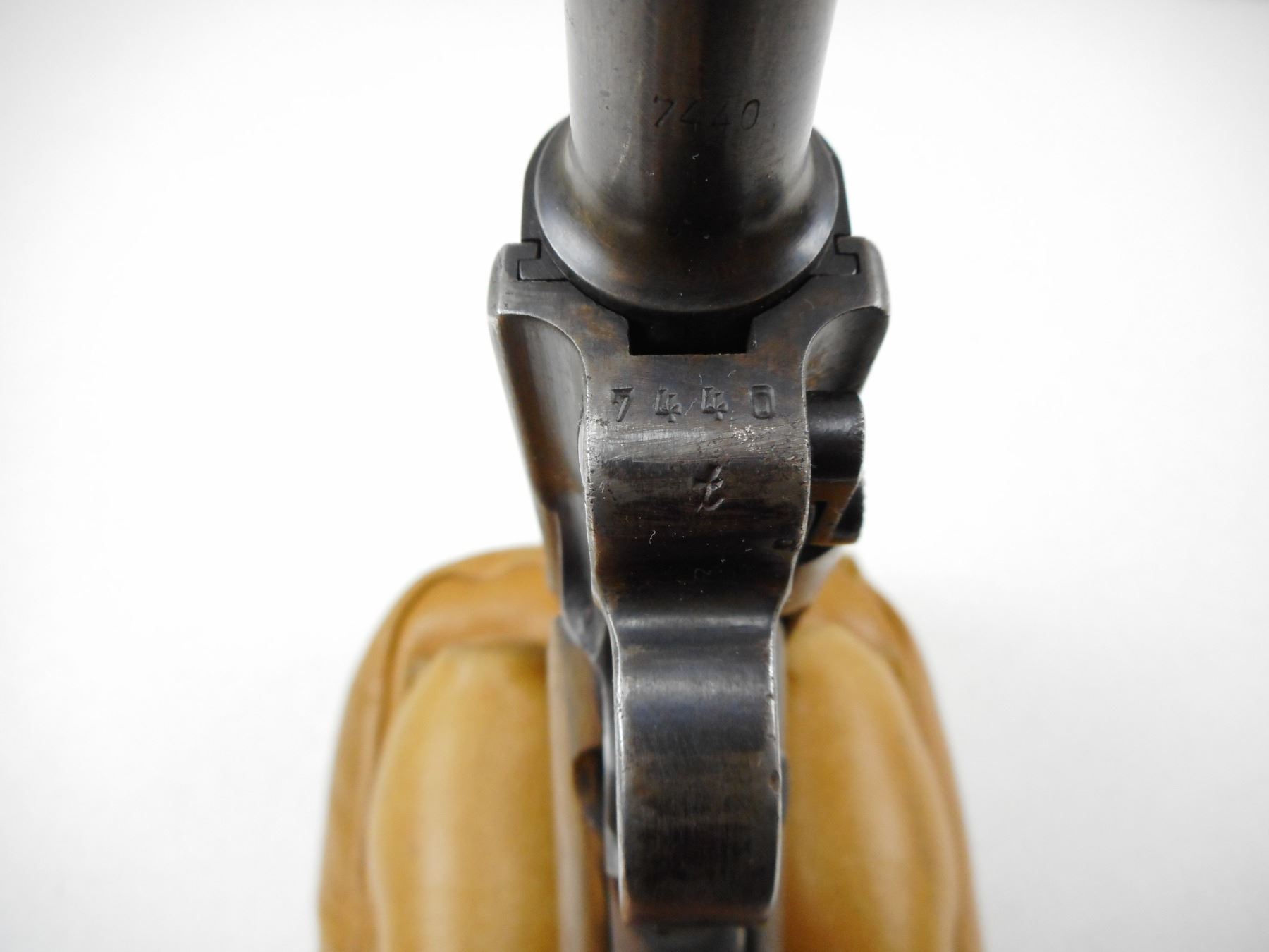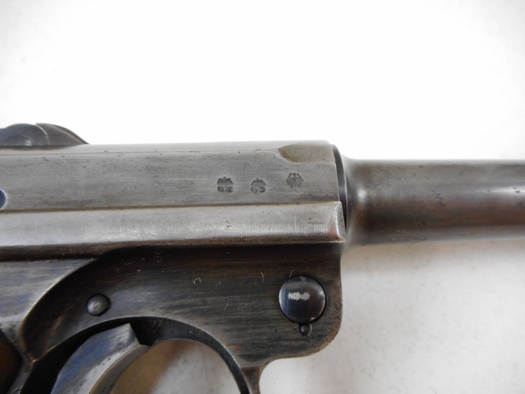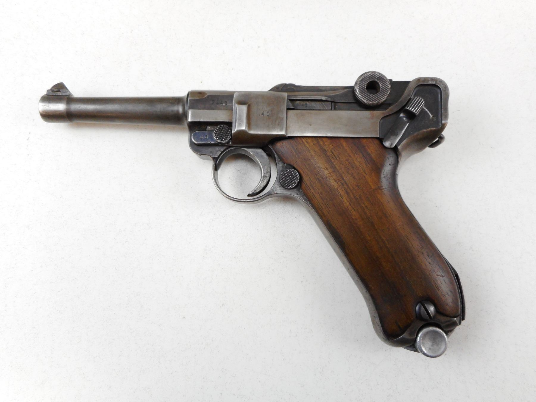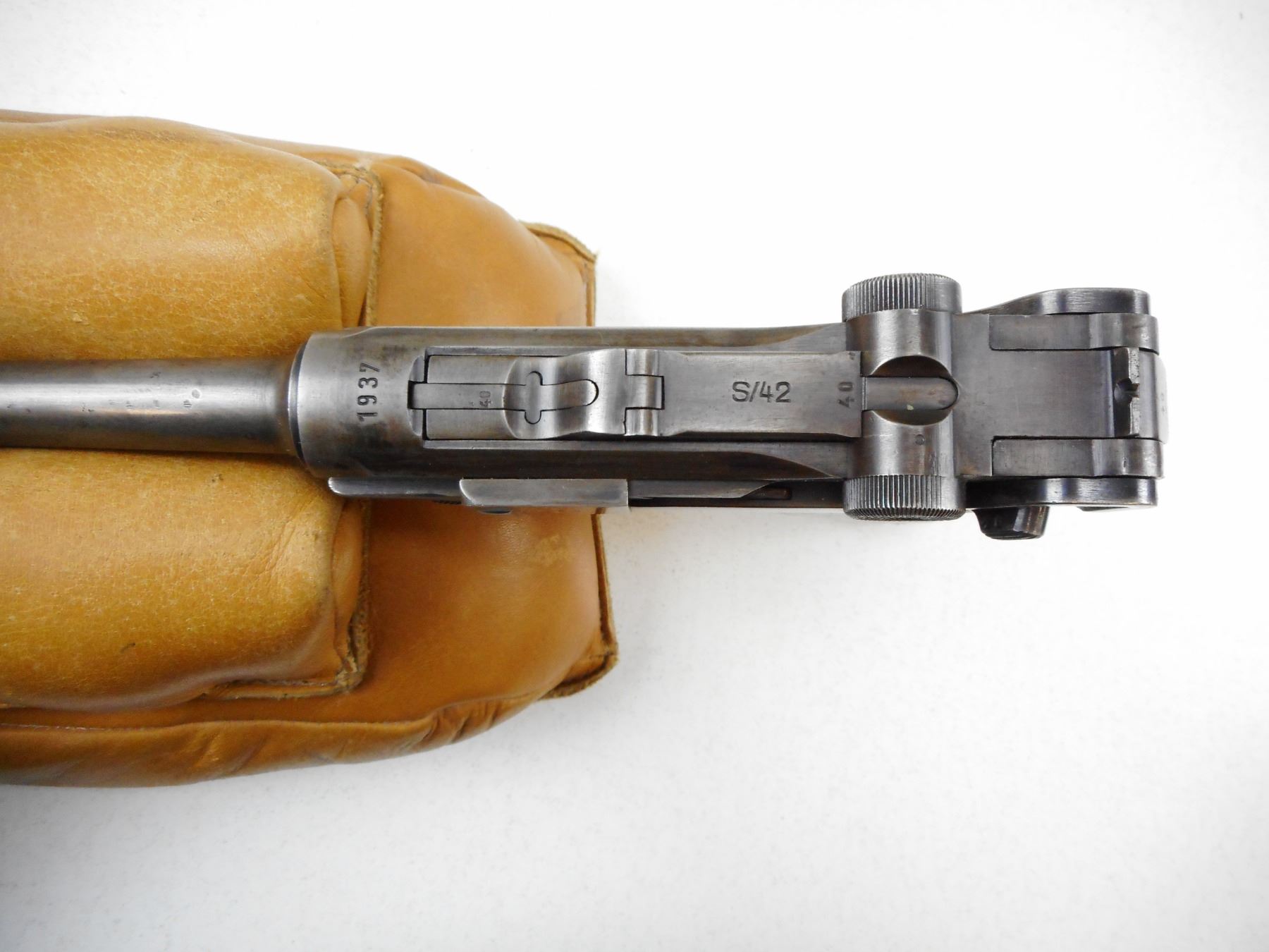 LUGER , MODEL: P08 , CALIBER: 9MM LUGER , COMES WITH MAGAZINE, MAUSER S 42 FACTORY, DATED 1937, WAFFEN MARKED, ALL #'S MATCH INCLUDING MAGAZINE, GOOD BORE , OVERALL GREY PATINA, SMOOTH WOODEN REPLACEMENT GRIPS , SERIAL # 7440T , ACTION: SEMI-AUTOMATIC , BARREL LENGTH: 102MM , CONDITION: 6/10 , STOCK # 2265 , CLASS: CANADIAN PROHIBITED CLASS
