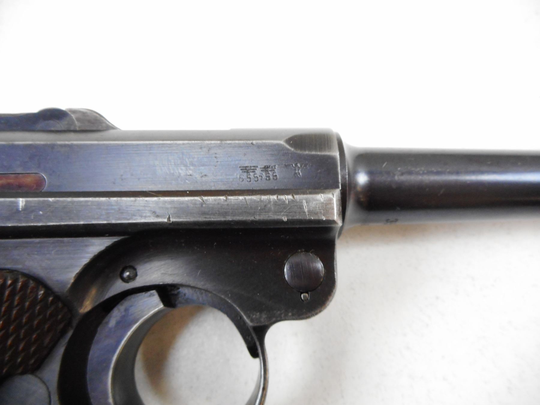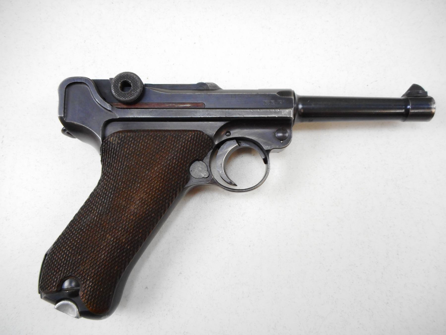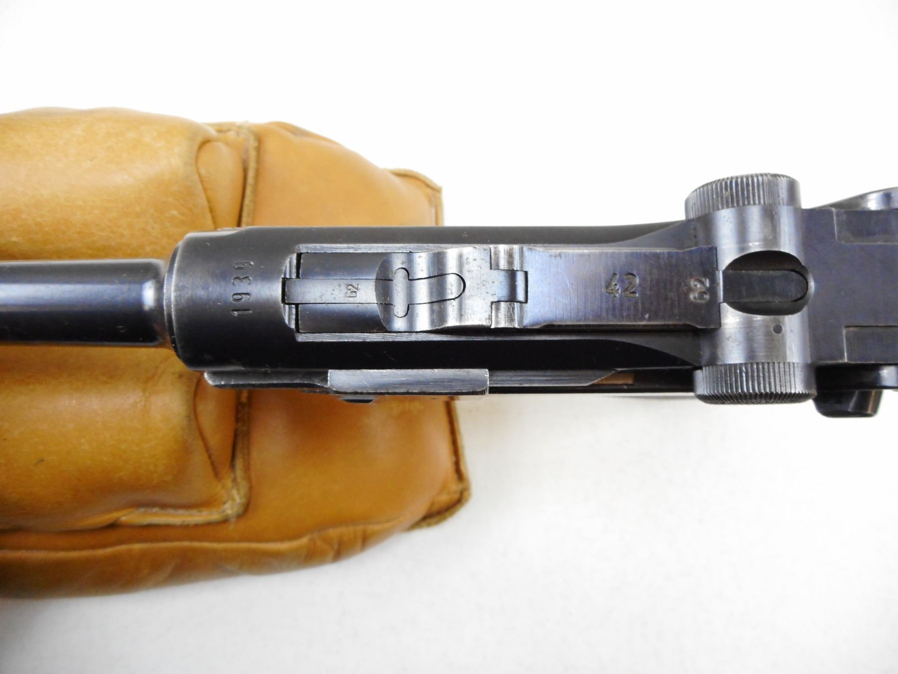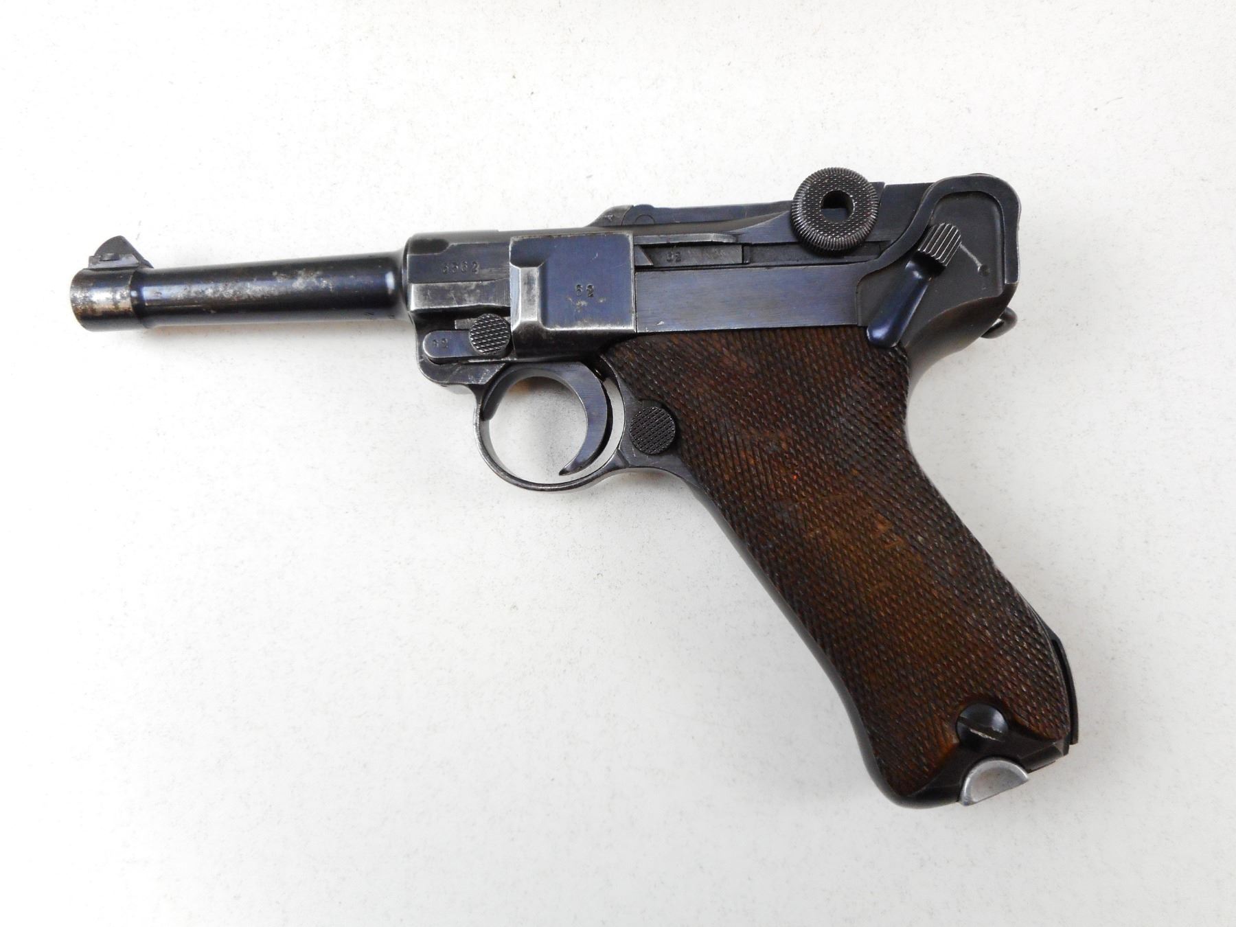 LUGER , MODEL: P08 , CALIBER: 9MM LUGER , COMES WITH MAGAZINE. BASE HAS BEEN GROUND FLAT, MAUSER FACTORY 42, DATED 1939, ALL #'S MATCH EXCEPT MAGAZINE, PITTING ON LEFT EXTERIOR OF BARREL, HOLSTER WEAR, EXCELLENT BORE. , SERIAL # 3562Z , ACTION: SEMI-AUTOMATIC , BARREL LENGTH: 102MM , CONDITION: 6/10 , STOCK # 2266 , CLASS: CANADIAN PROHIBITED CLASS