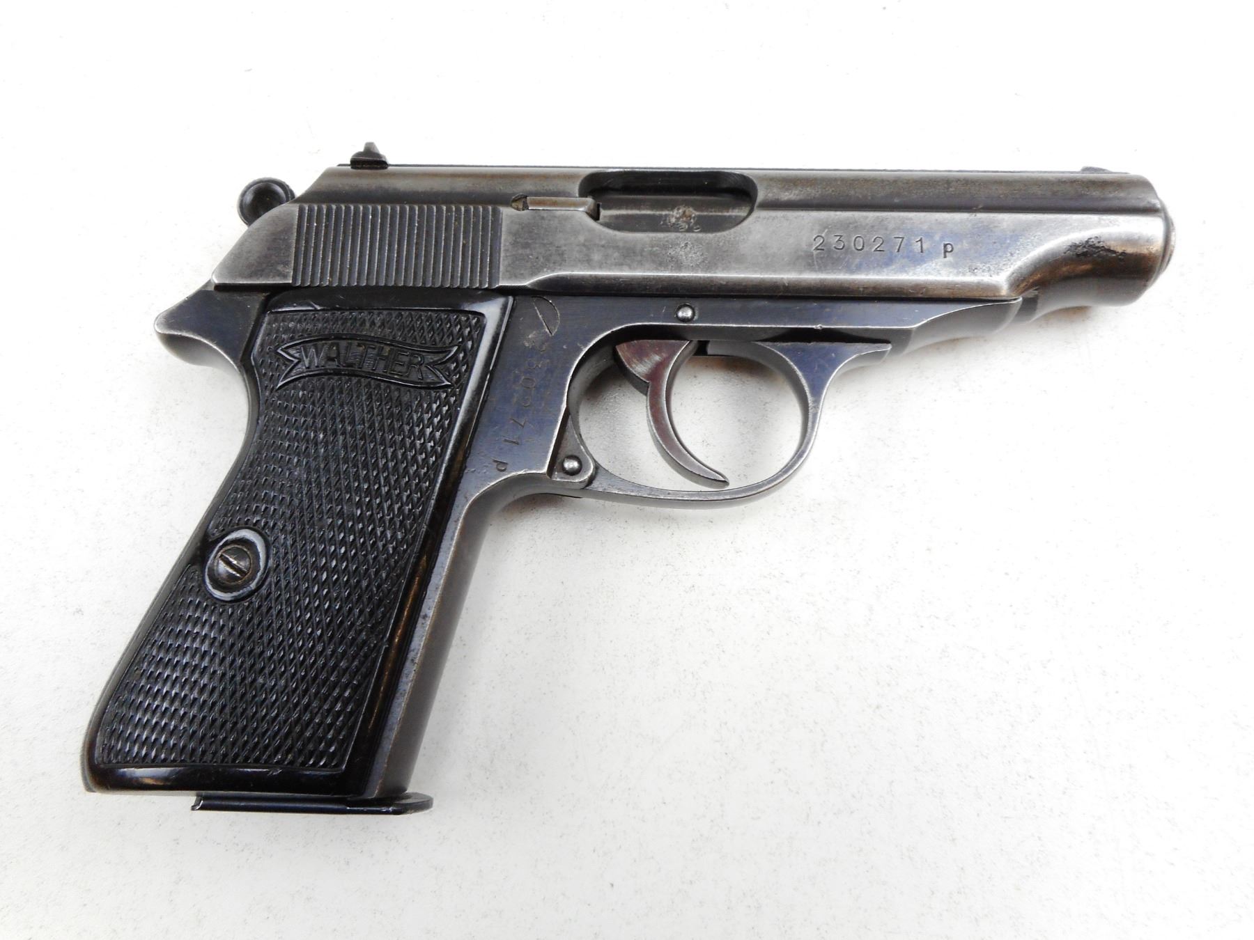 WALTHER , MODEL: PP , CALIBER: 7.65MM , COMES WITH MAGAZINE, FIXED NOTCH & BLADE SIGHTS, HARD RUBBER CHECKERED GRIPS, SLIGHT WEAR ON GRIP STRAPS AND FRAME, BLUE TO GREY PATINA, WAFFEN MARKED, GOOD BORE. , SERIAL # 230271P , ACTION: SEMI-AUTOMATIC , BARREL LENGTH: 98MM , CONDITION: 6/10 , STOCK # 2267 , CLASS: CANADIAN PROHIBITED CLASS