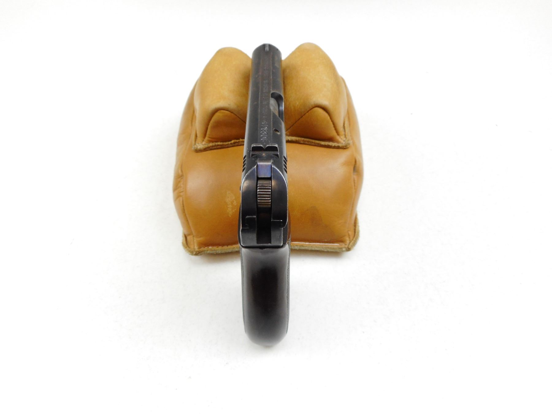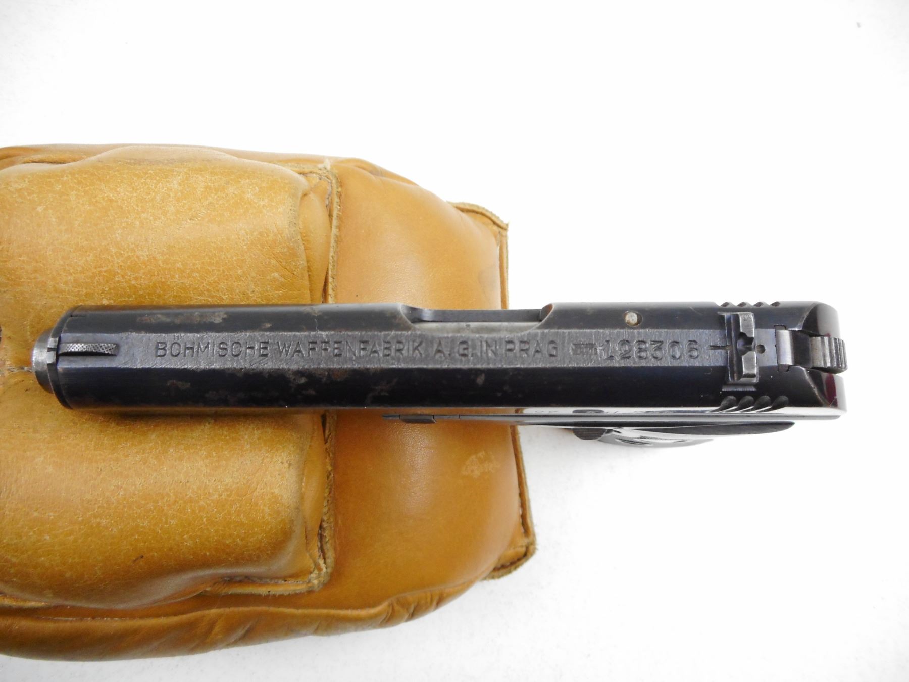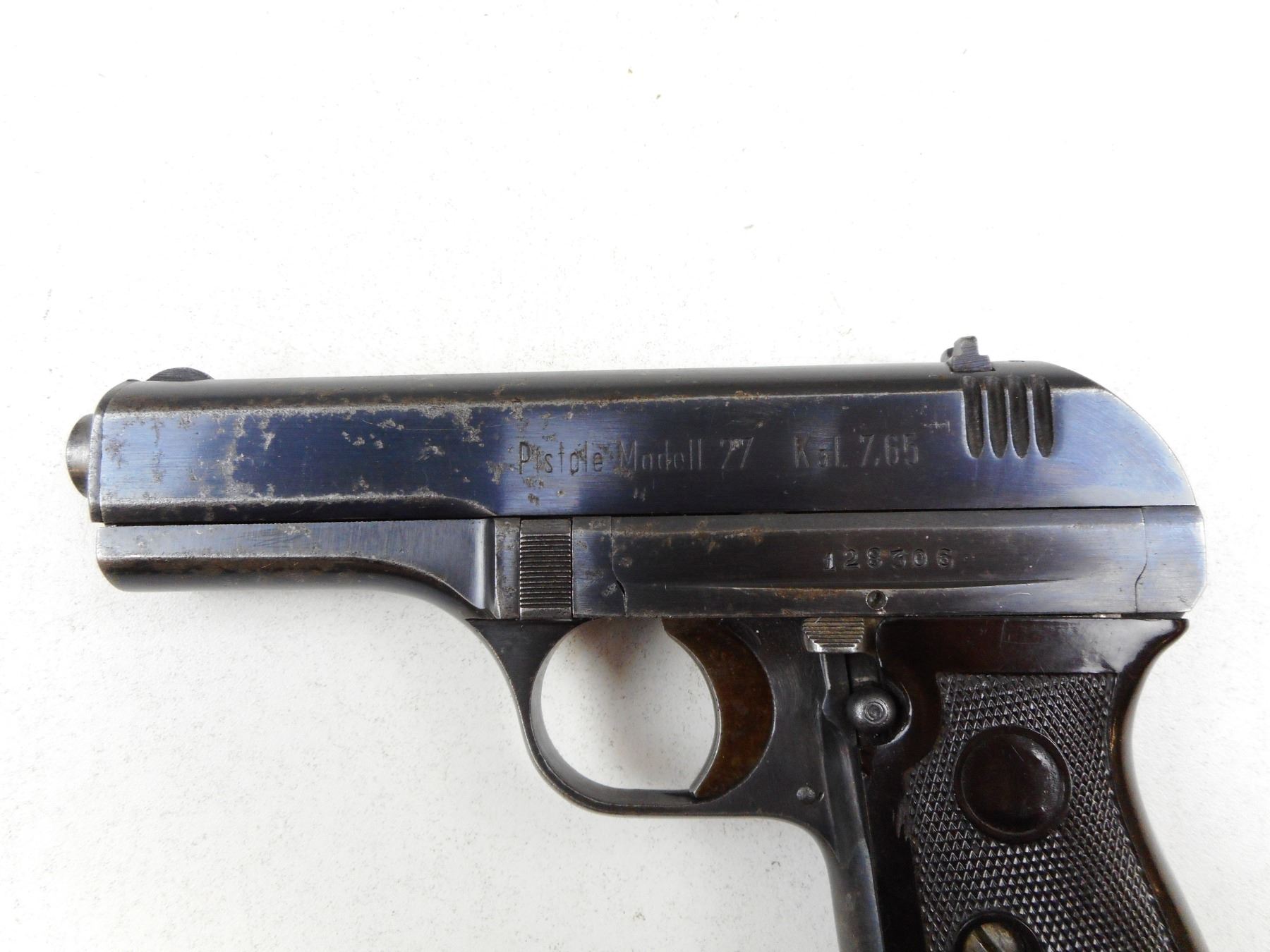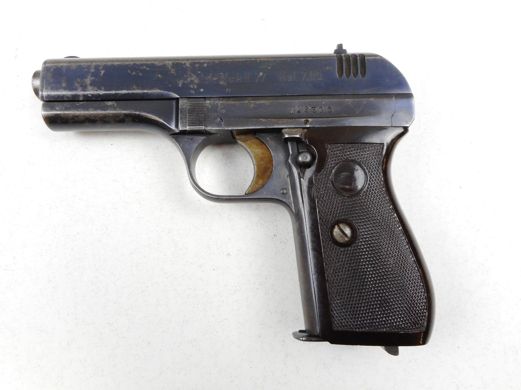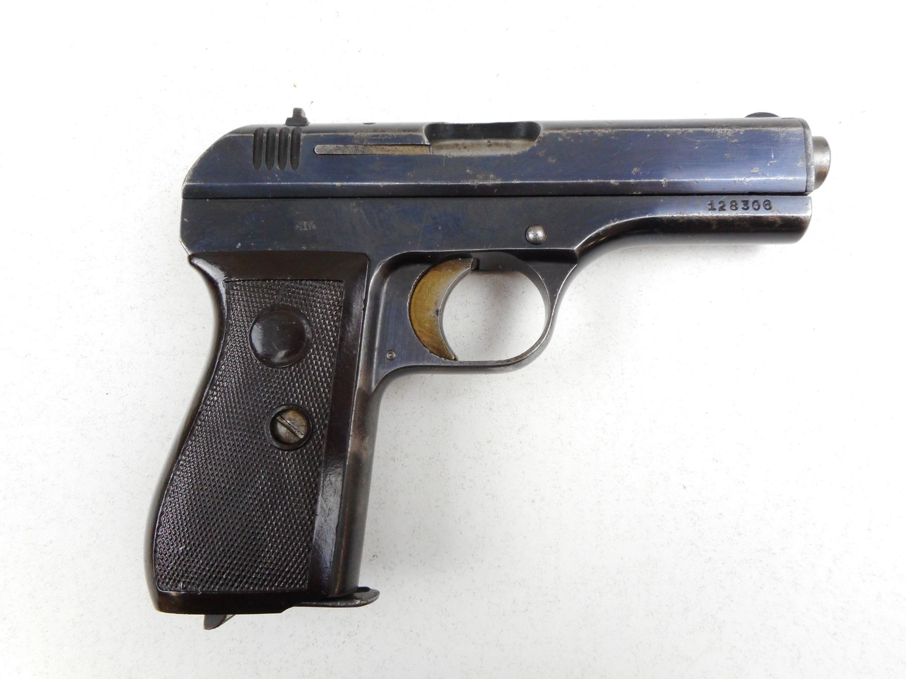 BOHMISCHE WAFFENFABRIK , MODEL: 27 , CALIBER: 7.65MM , COMES WITH MAGAZINE, FIXED NOTCH & BLADE SIGHTS, WRAP AROUND BROWN CHECKERED BAKELITE GRIPS, EXCELLENT BORE, BLUE FINISH WITH SOME PITTING, WAFFEN MARKED , SERIAL # 128306 , ACTION: SEMI-AUTOMATIC , BARREL LENGTH: 98MM , CONDITION: 7/10 , STOCK # 2269 , CLASS: CANADIAN PROHIBITED CLASS