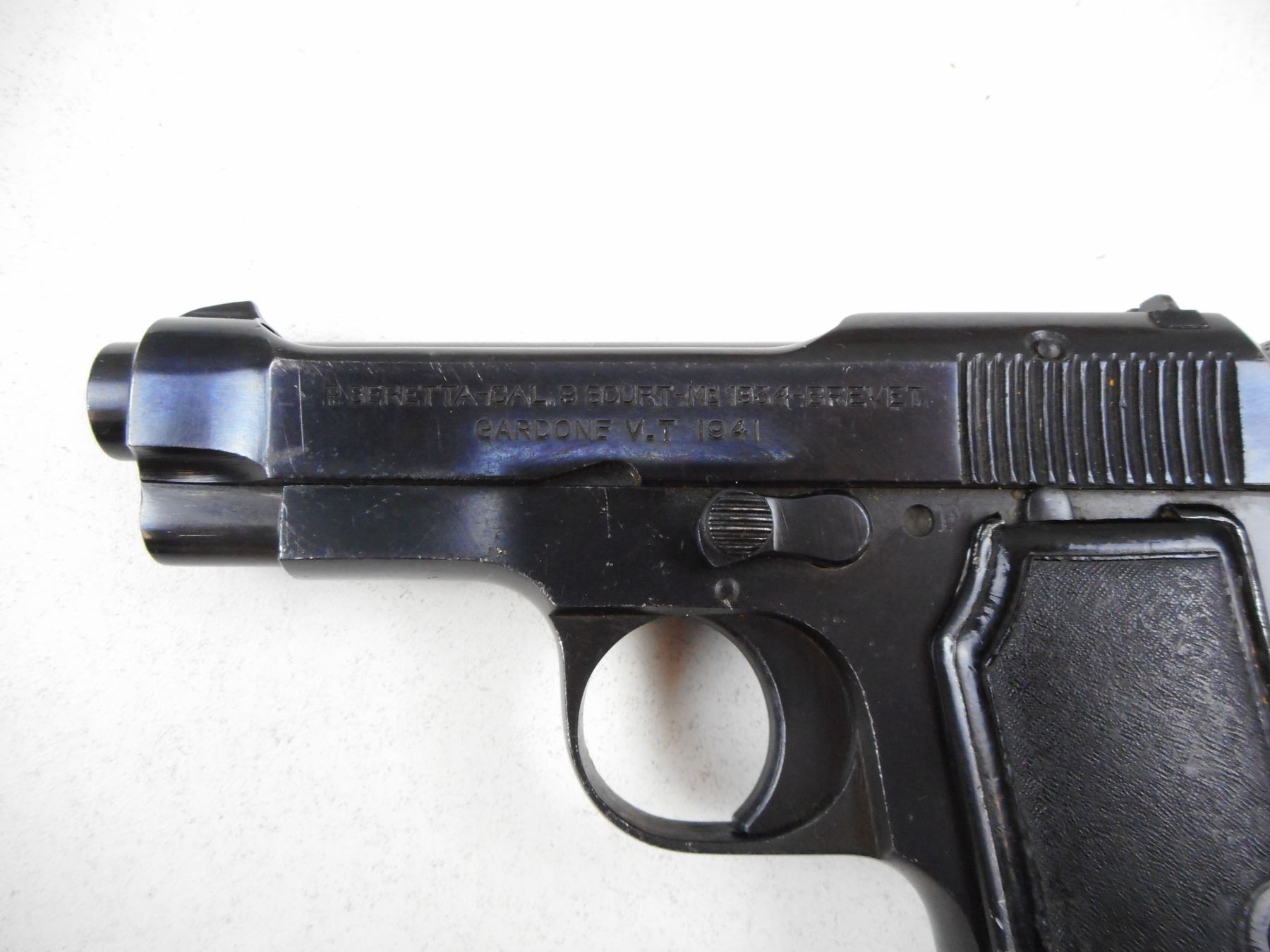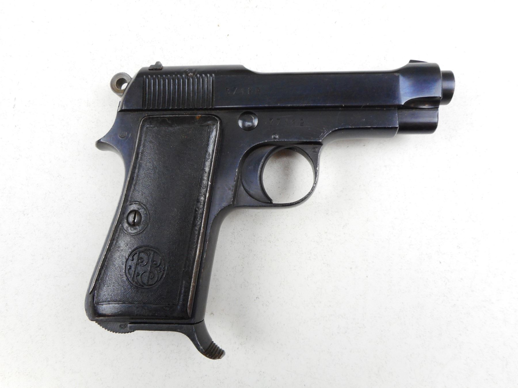 BERETTA , MODEL: 1934 , CALIBER: 9MM BROWNING COURT , COMES WITH MAGAZINE, FIXED NOTCH & BLADE SIGHTS, TEXTURED HARD RUBBER GRIPS, LANYARD LOOP, BORE SHOWS MINOR SCATTERED PITTING, BRIGHT BLUE FINISH, WEAR APPROPRIATE , SERIAL # 37162 , ACTION: SEMI-AUTOMATIC , BARREL LENGTH: 86MM , CONDITION: 7/10 , STOCK # 2270 , CLASS: CANADIAN PROHIBITED CLASS