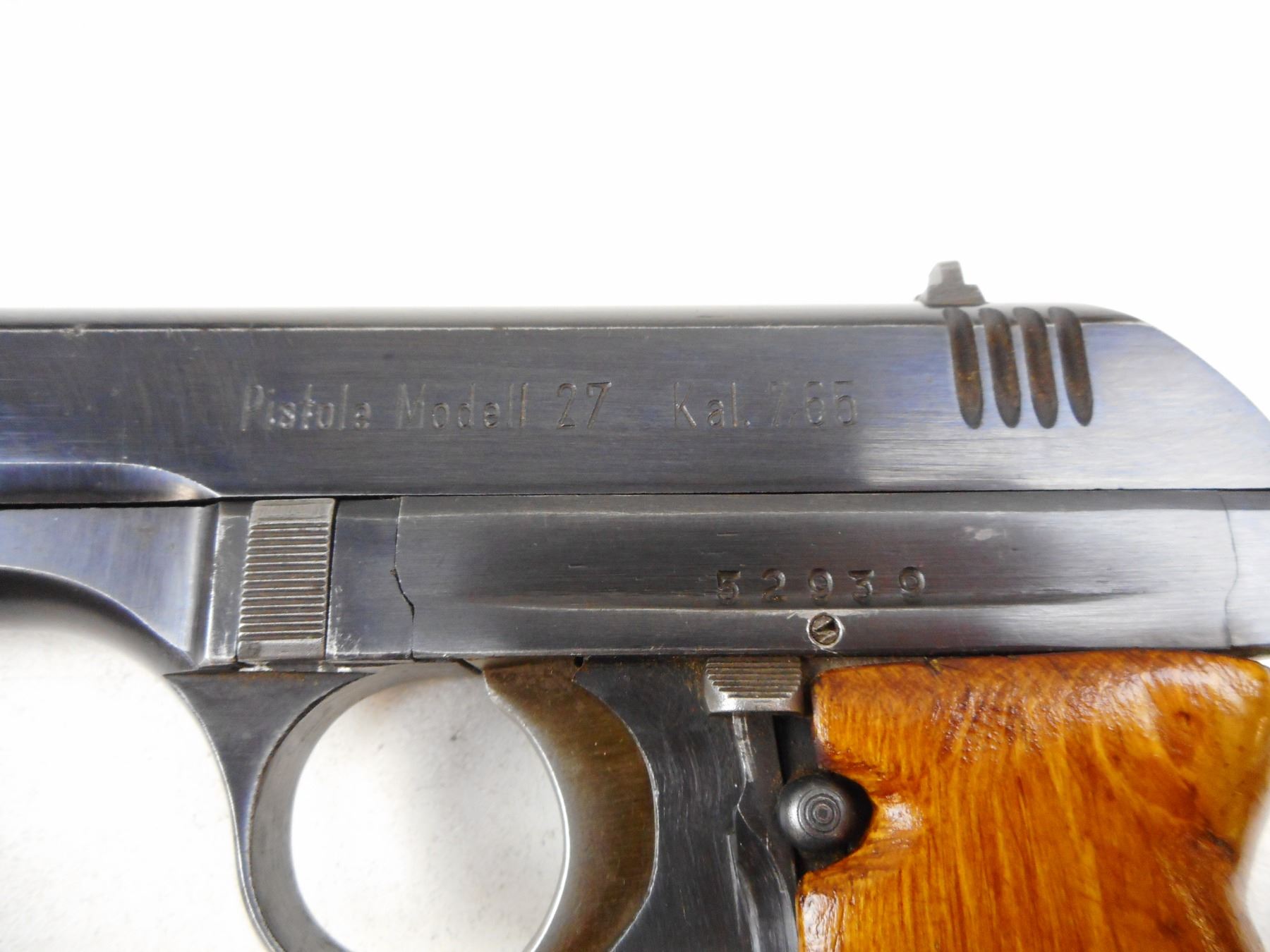 BOHMISCHE WAFFENFABRIK , MODEL: MODELL 27 , CALIBER: 7.65MM , COMES WITH MAGAZINE, NOTCH & BLADE SIGHT, WRAP AROUND WOOD GRIP, BRIGHT BLUE FINISH, GOOD BORE, WEAR WEAR RIGHT SIDE OF FRAME AND SLIDE, MINOR PITTING. , SERIAL # 52939 , ACTION: SEMI-AUTOMATIC , BARREL LENGTH: 98MM , CONDITION: 7/10 , STOCK # 2276 , CLASS: CANADIAN PROHIBITED CLASS