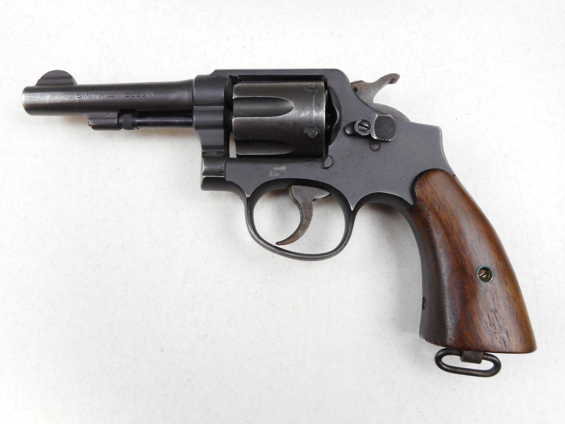 SMITH & WESSON , MODEL: H.E. 38 M&P VICTORY MODEL , CALIBER: 38 S&W SPECIAL , NOTCH & BLADE SIGHT, SMOOTH WOODEN GRIPS, PARKERIZED RE-FINISH, TIGHT LOCK UP AND INDEXES WELL, LANYARD LOOP , SERIAL # V142657 , ACTION: REVOLVER , BARREL LENGTH: 102MM , CONDITION: 7/10 , STOCK # 2277 , CLASS: CANADIAN PROHIBITED CLASS
