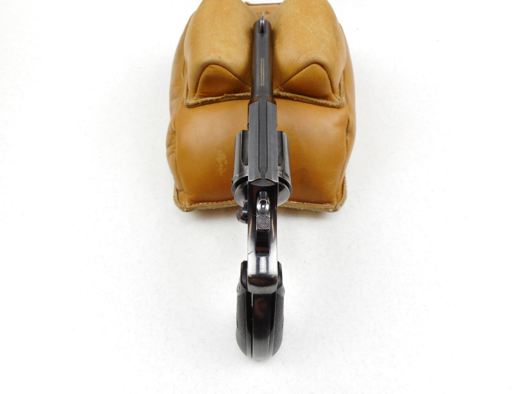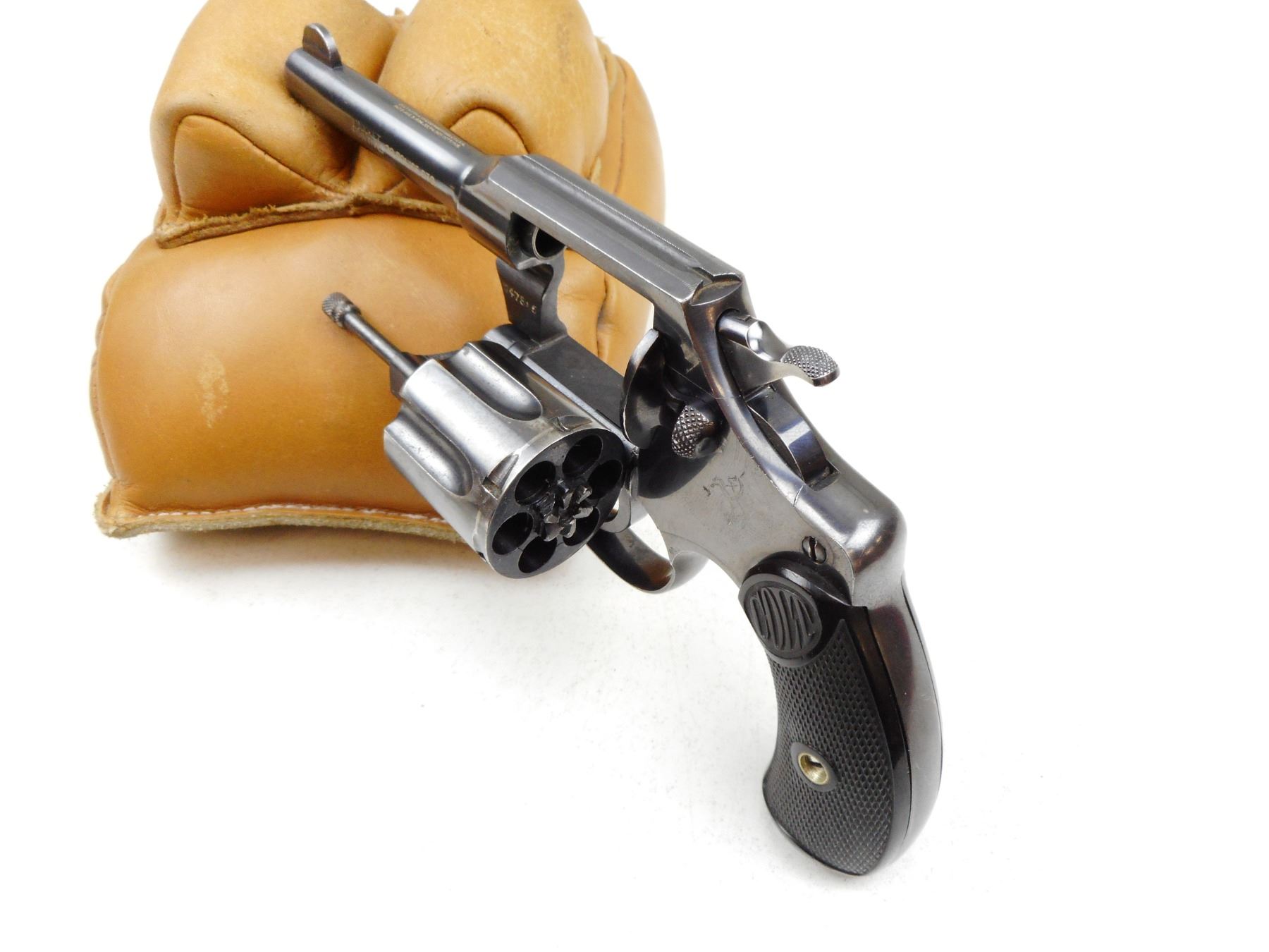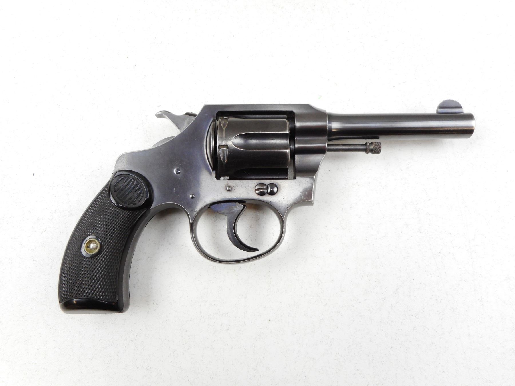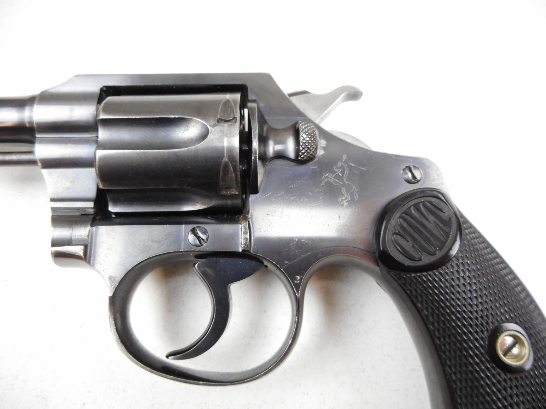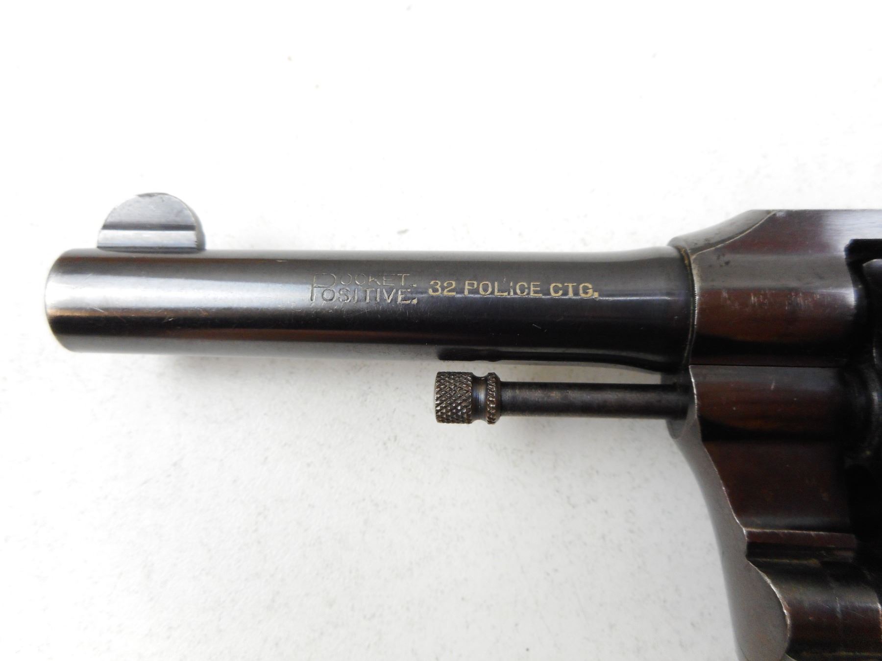 COLT , MODEL: POLICE POSITIVE 32 , CALIBER: 32 S&W LONG , NOTCH & BLADE SIGHTS, CHECKERED GRIPS SMALL CHIP LEFT FRONT AT BUTT, BRIGHT RE-BLUED FINISH, GOOD BORE, TIGHT LOCKUP AND INDEXES WELL. , SERIAL # 147895 , ACTION: REVOLVER , BARREL LENGTH: 86MM , CONDITION: 8/10 , STOCK # 2279 , CLASS: CANADIAN PROHIBITED CLASS
