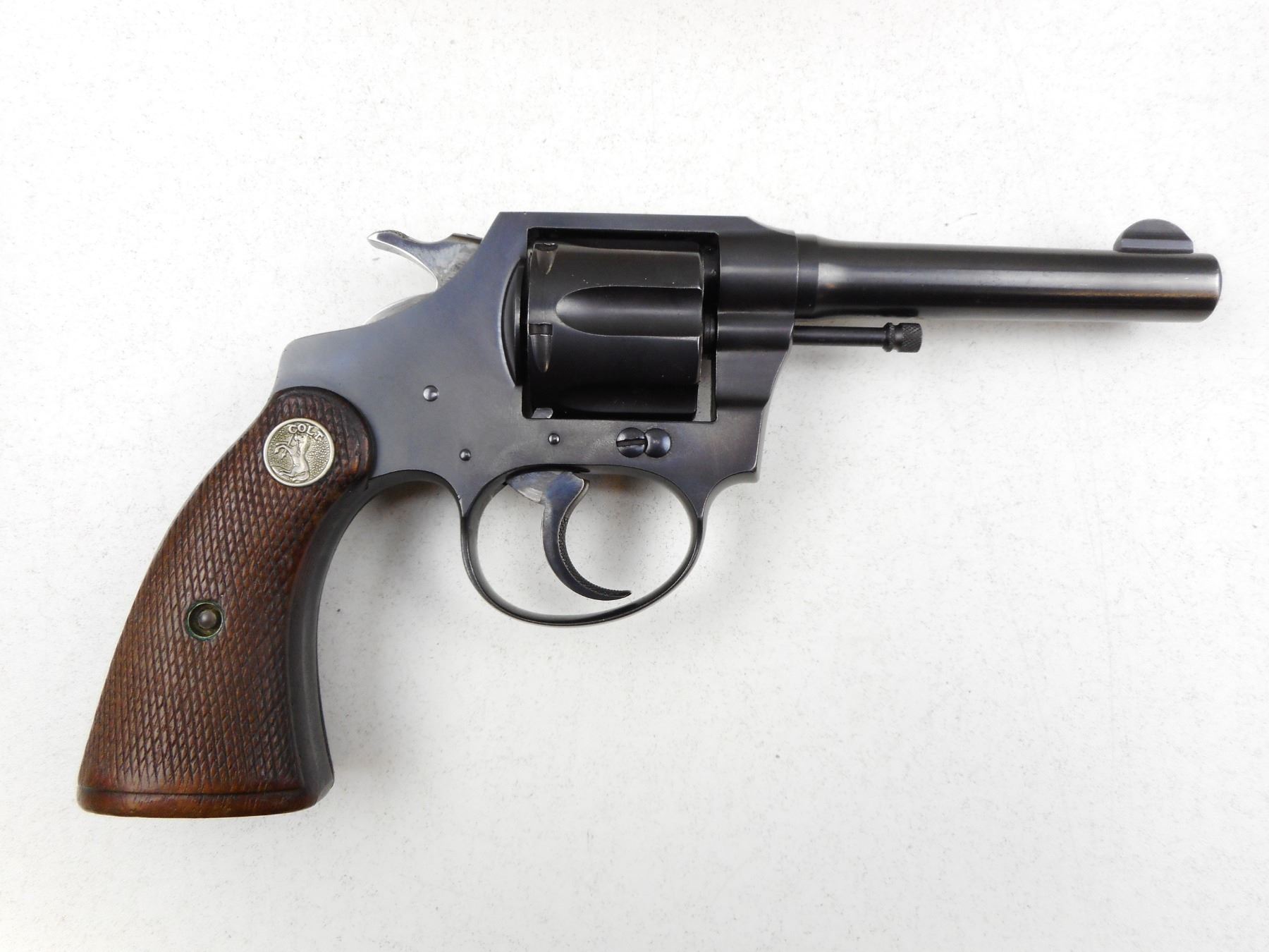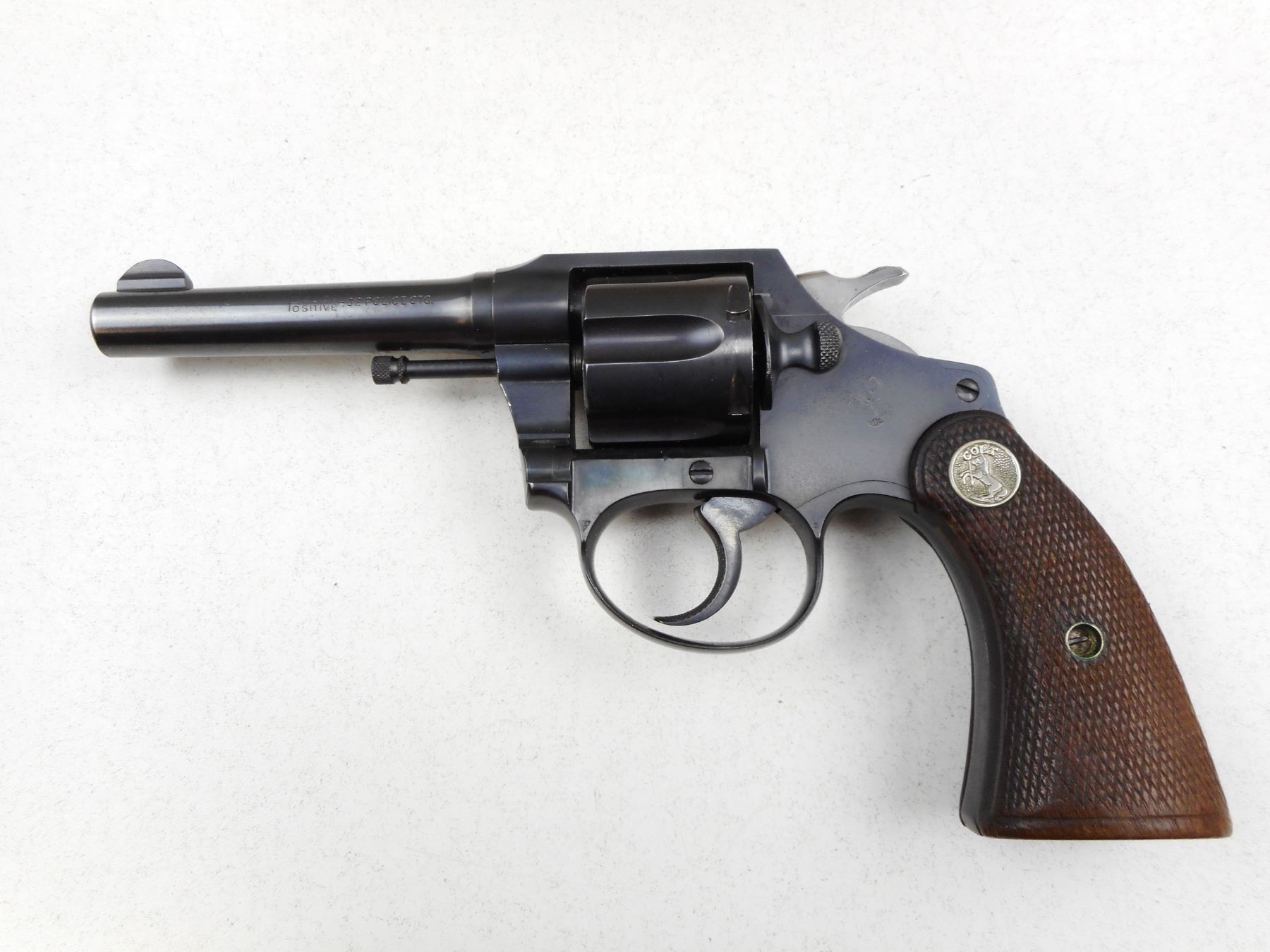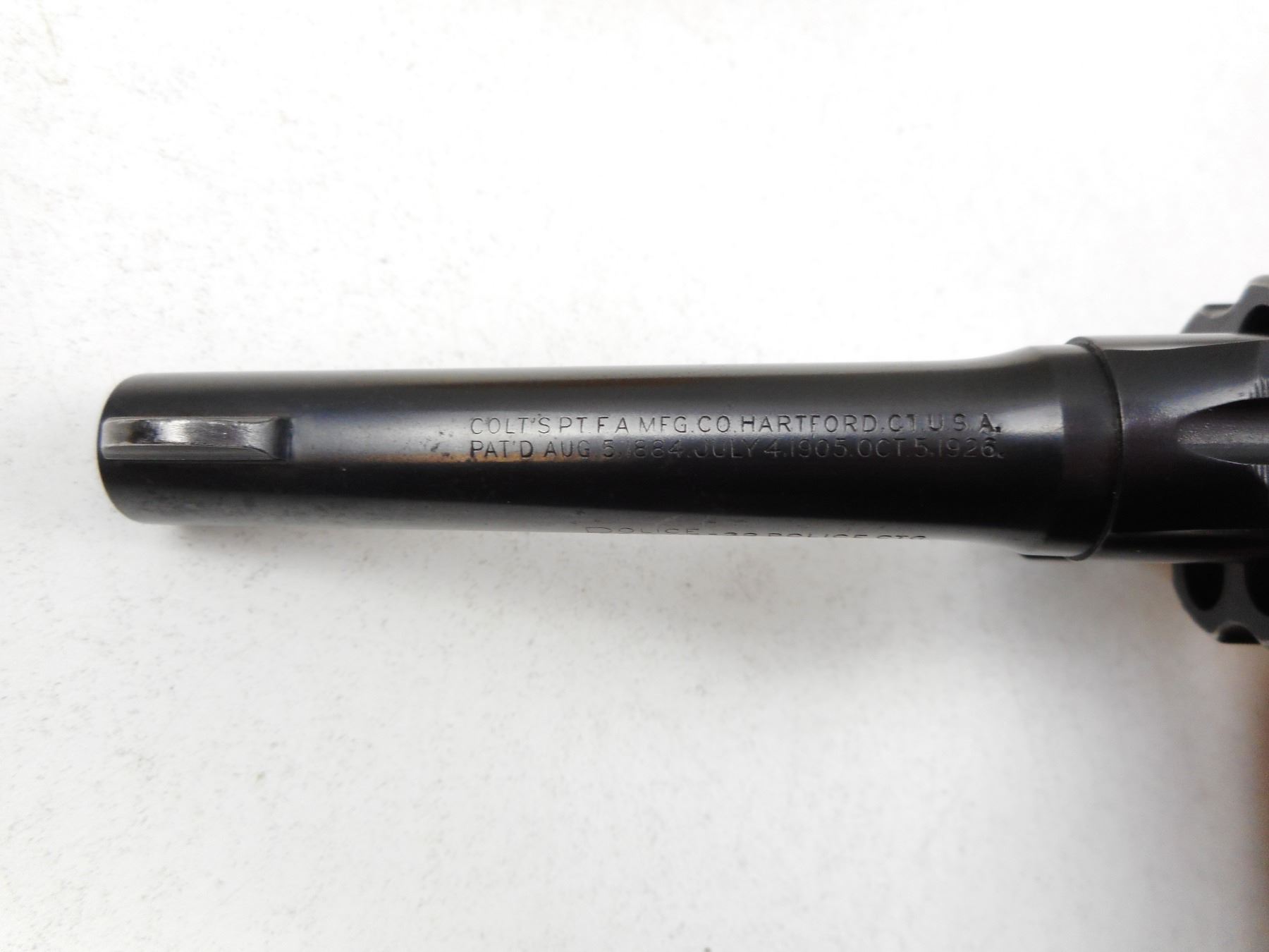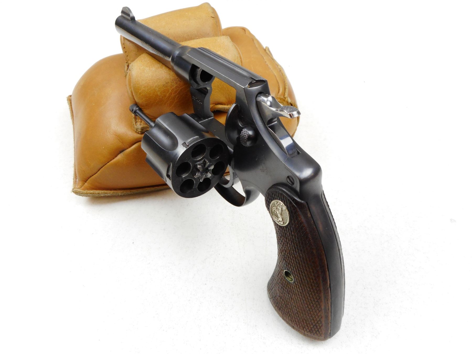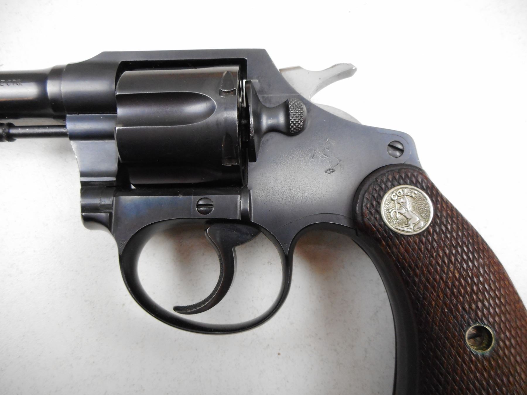COLT , MODEL: POLICE POSITIVE 32 , CALIBER: 32 S&W LONG , NOTCH & BLADE SIGHTS, CHECKERED WOOD GRIPS, BLUE FINISH SHOWING MINOR WEAR, TIGHT LOCKUP AND INDEXES WELL, GOOD BORE , SERIAL # 337424 , ACTION: REVOLVER , BARREL LENGTH: 102MM , CONDITION: 8/10 , STOCK # 2280 , CLASS: CANADIAN PROHIBITED CLASS