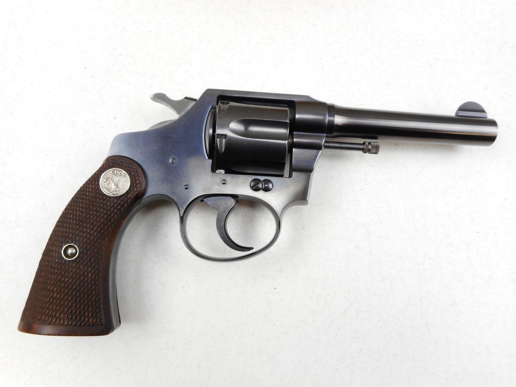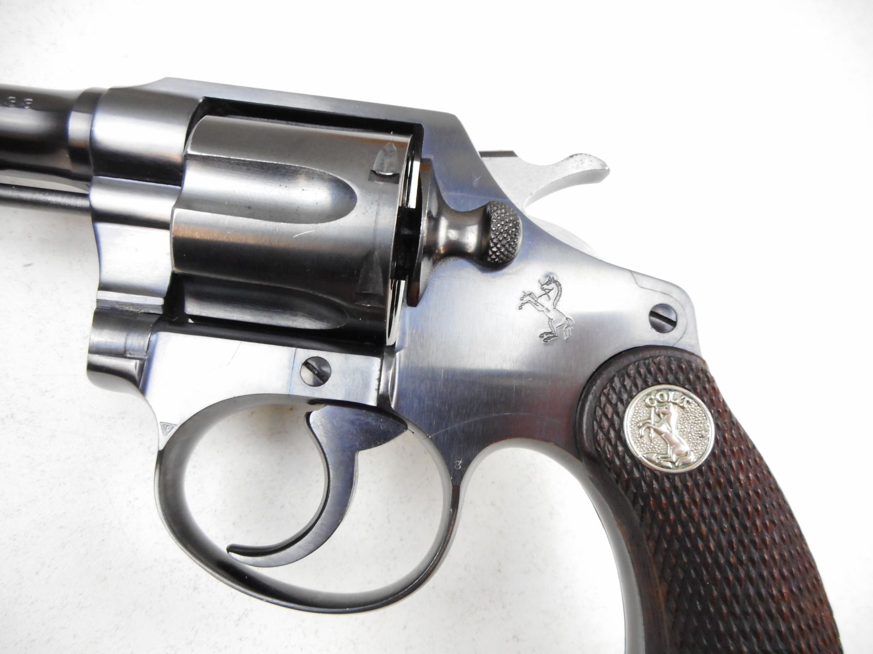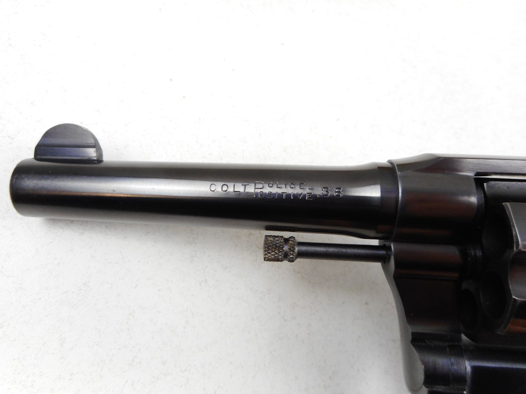 COLT , MODEL: POLICE POSITIVE 38 , CALIBER: 38 S&W SPECIAL , NOTCH & BLADE SIGHTS, CHECKERED WOOD GRIPS, BLUE FINISH SHOWING MINOR WEAR, TIGHT LOCKUP AND INDEXES WELL, GOOD BORE , SERIAL # 174381 , ACTION: REVOLVER , BARREL LENGTH: 102MM , CONDITION: 8/10 , STOCK # 2281 , CLASS: CANADIAN PROHIBITED CLASS
