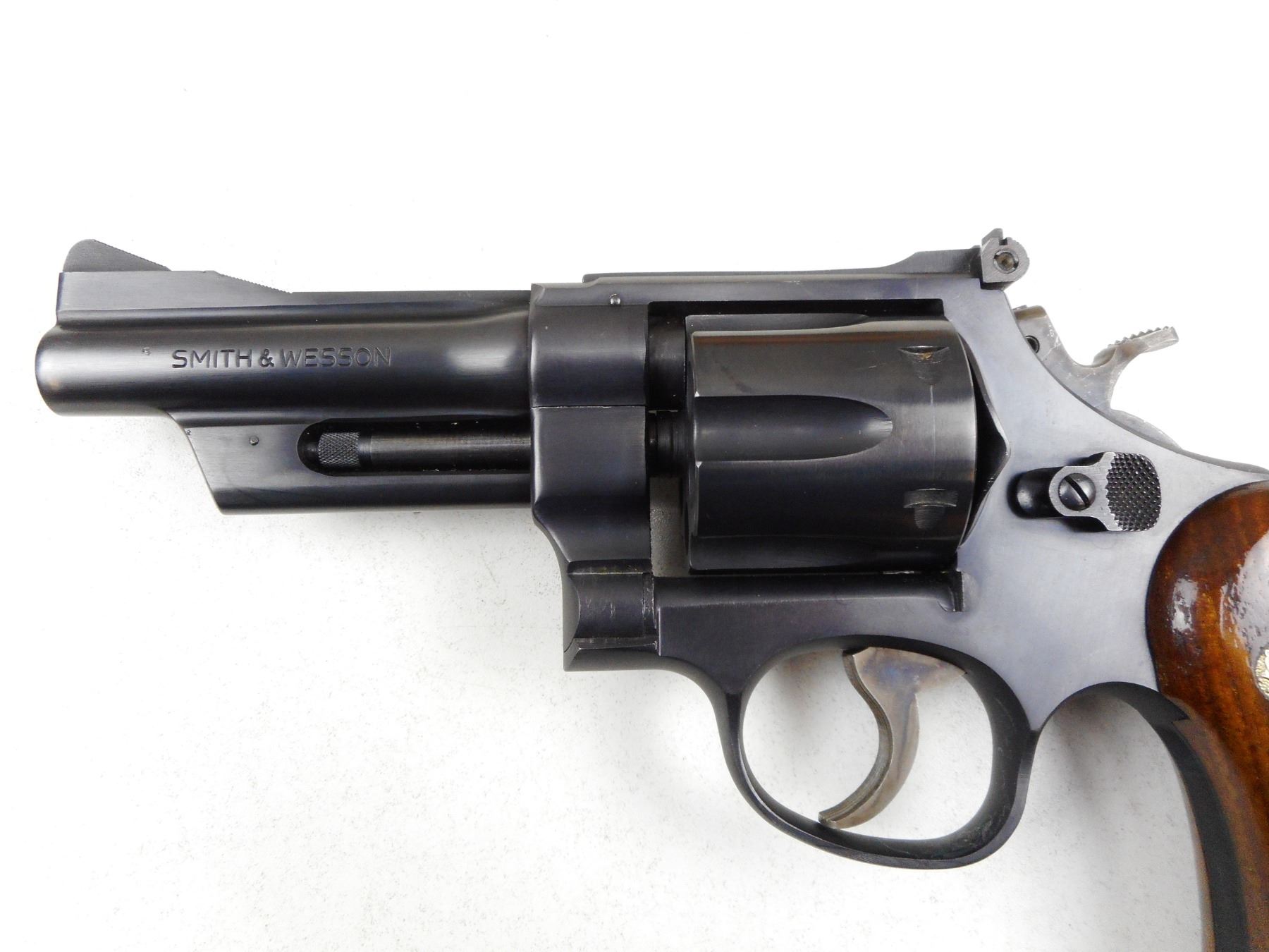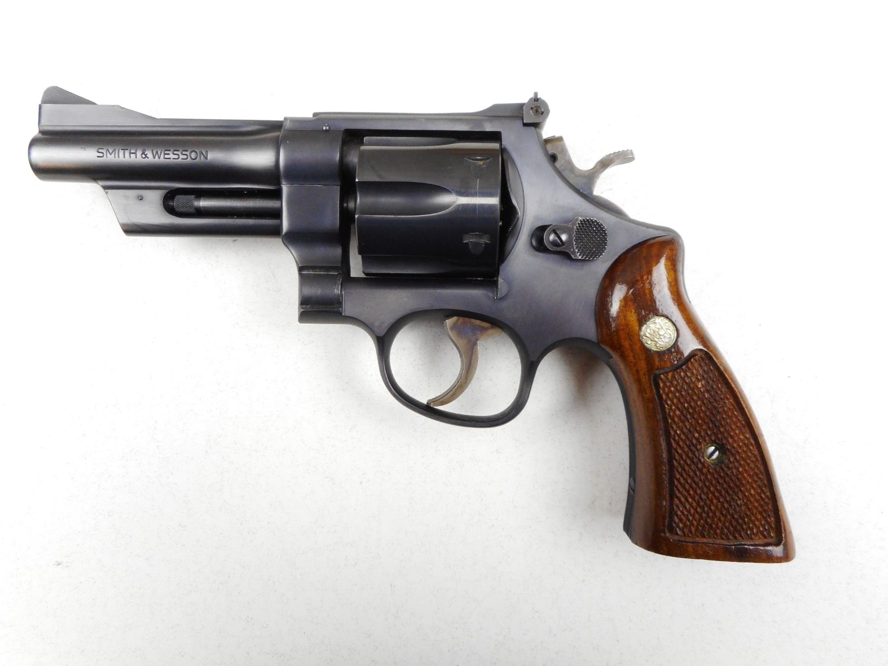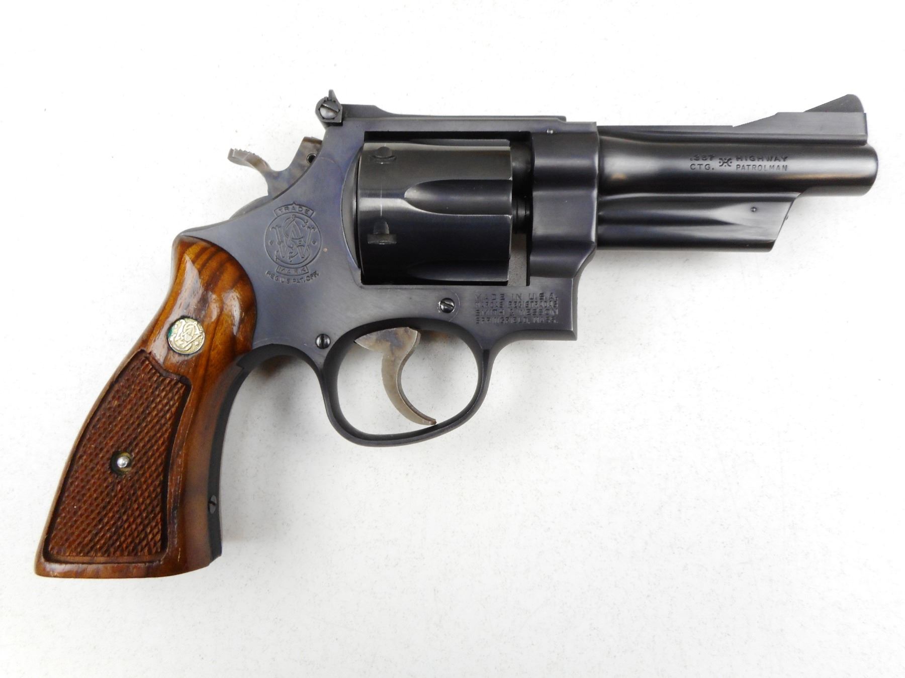 SMITH & WESSON , MODEL: 28-2 HIGHWAY PRATROLMAN , CALIBER: 357 MAG. , ADJUSTABLE NOTCH & BLADE SIGHTS, CHECKERED WOODEN GRIPS, BRIGHT BLUE FINISH, EXCELLENT BORE, LOCKUP AND INDEXES WELL, CASE COLOURED SPUR HAMMER AND TRIGGER , SERIAL # N537624 , ACTION: REVOLVER , BARREL LENGTH: 102MM , CONDITION: 8/10 , STOCK # 2293 , CLASS: CANADIAN PROHIBITED CLASS