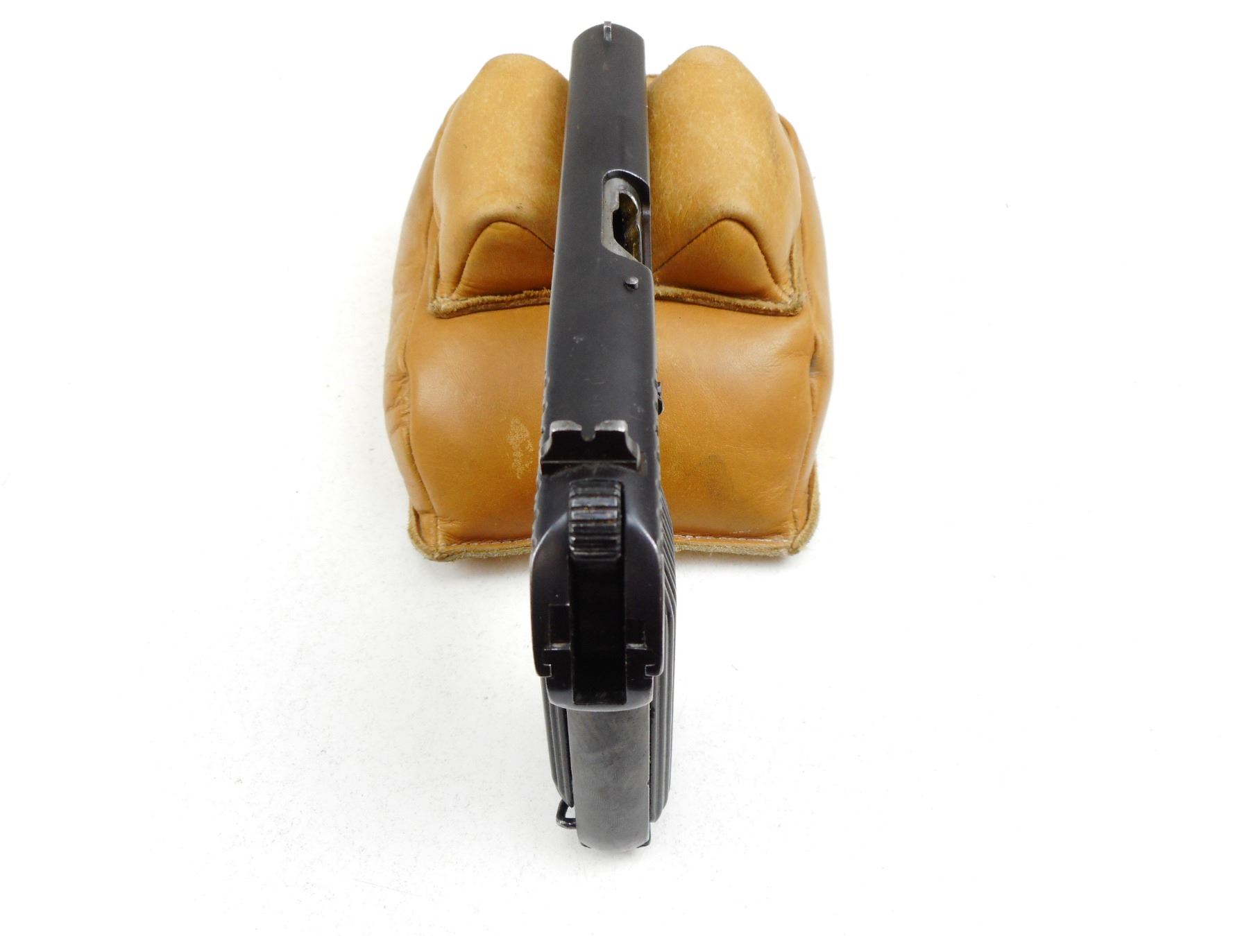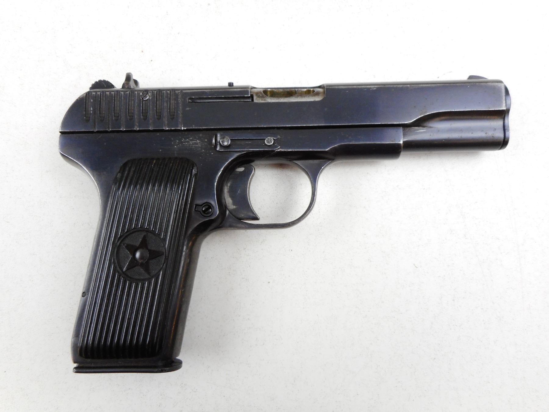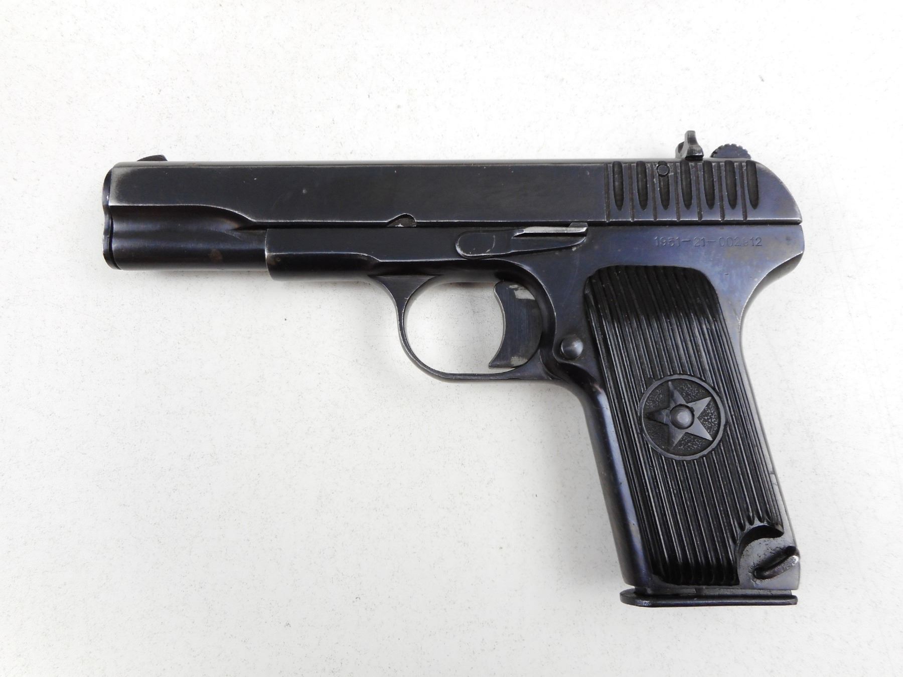 TOKAREV , MODEL: TT33 , CALIBER: 7.62MM TOKAREV , COMES WITH MAGAZINE, DATED 1951, VERY GOOD BORE, BLADE FRONT AND FIXED REAR SIGHTS, PLASTIC GRIPS, SHOWS SOME HANDLING MARKS , SERIAL # 002912 , ACTION: SEMI-AUTOMATIC HANDGUN , BARREL LENGTH: 115MM , CONDITION: 7/10 , STOCK # 2751 , CLASS: CANADIAN RESTRICTED CLASS