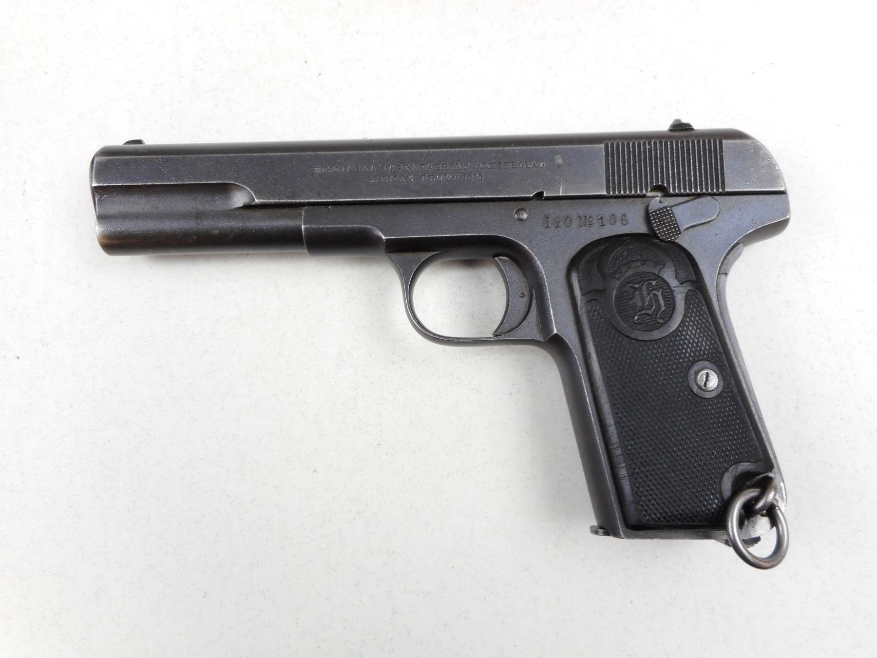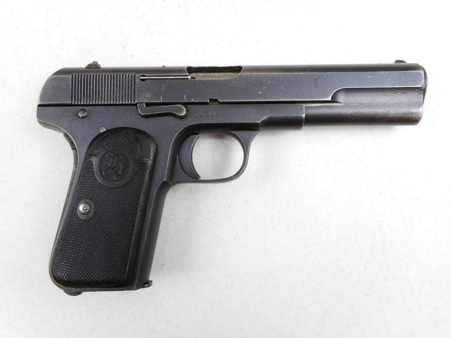 BROWNING , MODEL: 1903 M07 , CALIBER: 9MM BROWNING LONG , COMES WITH MAGAZINE, MANUFACTURED BY HUSQVARNA, BLADE FRONT SIGHT AND FIXED REAR SIGHTS, PLASTIC CHECKERED GRIPS, VERY GOOD BORE , SERIAL # 10306 , ACTION: SEMI-AUTOMATIC HANDGUN , BARREL LENGTH: 127MM , CONDITION: 8/10 , STOCK # 2753 , CLASS: CANADIAN RESTRICTED CLASS