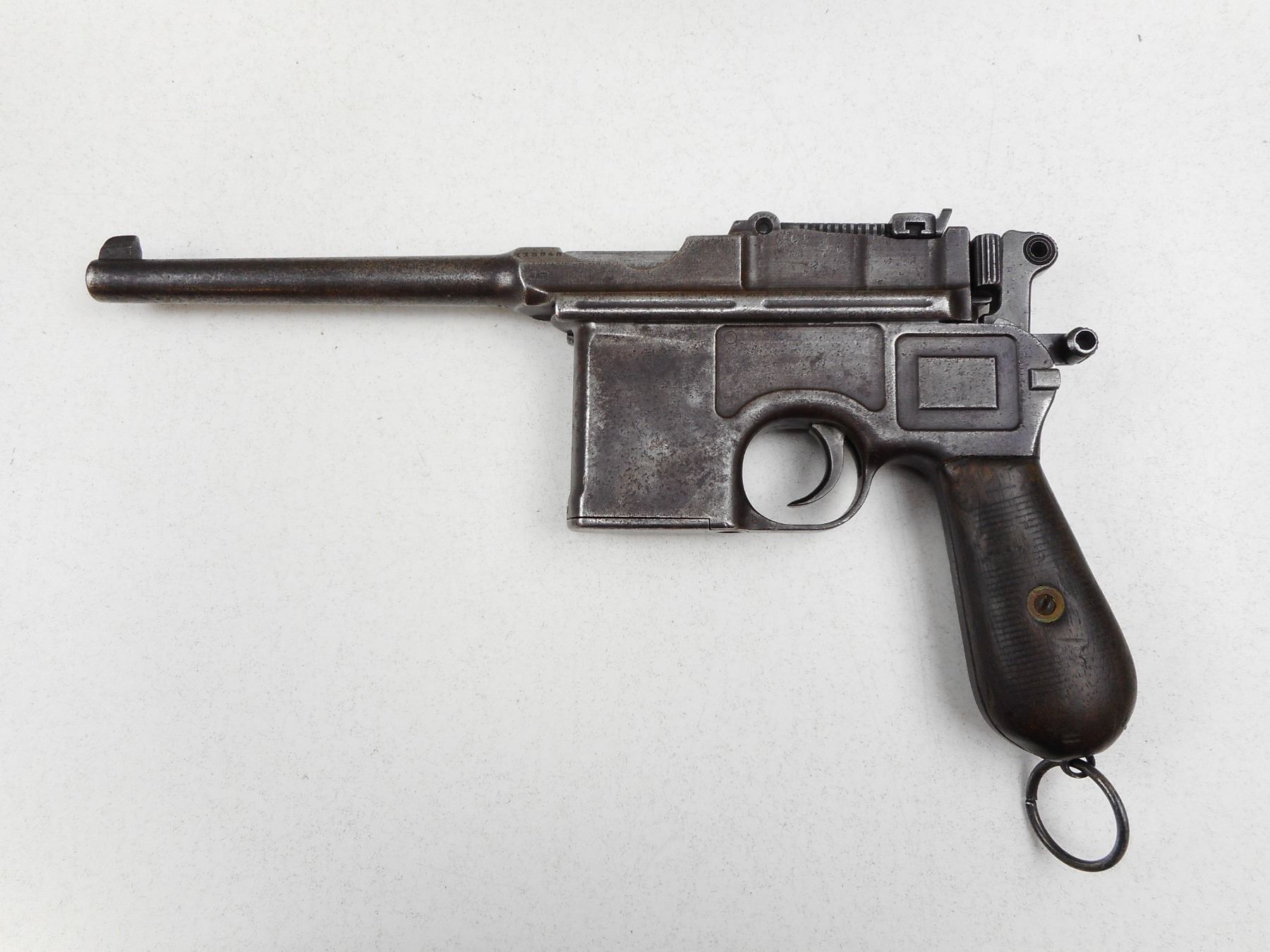 MAUSER , MODEL: C96 BROOMHANDLE , CALIBER: 7.63MM MAUSER , SMALL RING HAMMER, BLADE FRONT AND ADJUSTABLE REAR SIGHT, FROM 50-1000M, NO ORIGINAL BLUEING REMAINING SHOWS SOME SURFACE PITTING, HAS THE LANYARD RING, SHOWS EXTENSIVE HANDLING MARKS, BORE IS GOOD, ALL EXTERNAL COMPONENTS APPEAR TO BE MATCHING , SERIAL # 115948 , ACTION: SEMI-AUTOMATIC HANDGUN , BARREL LENGTH: 140MM , CONDITION: 4/10 , STOCK # 2754 , CLASS: CANADIAN RESTRICTED CLASS