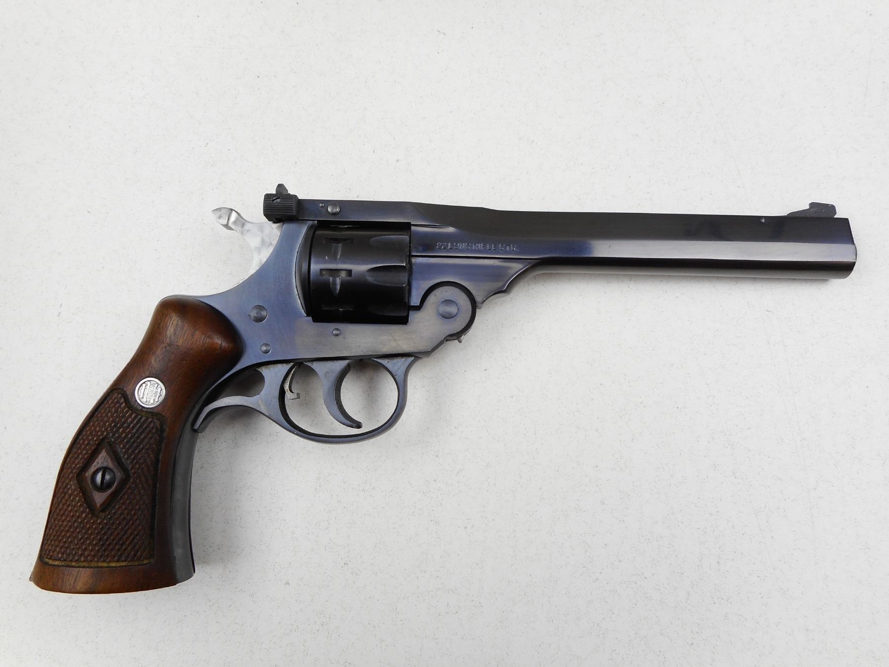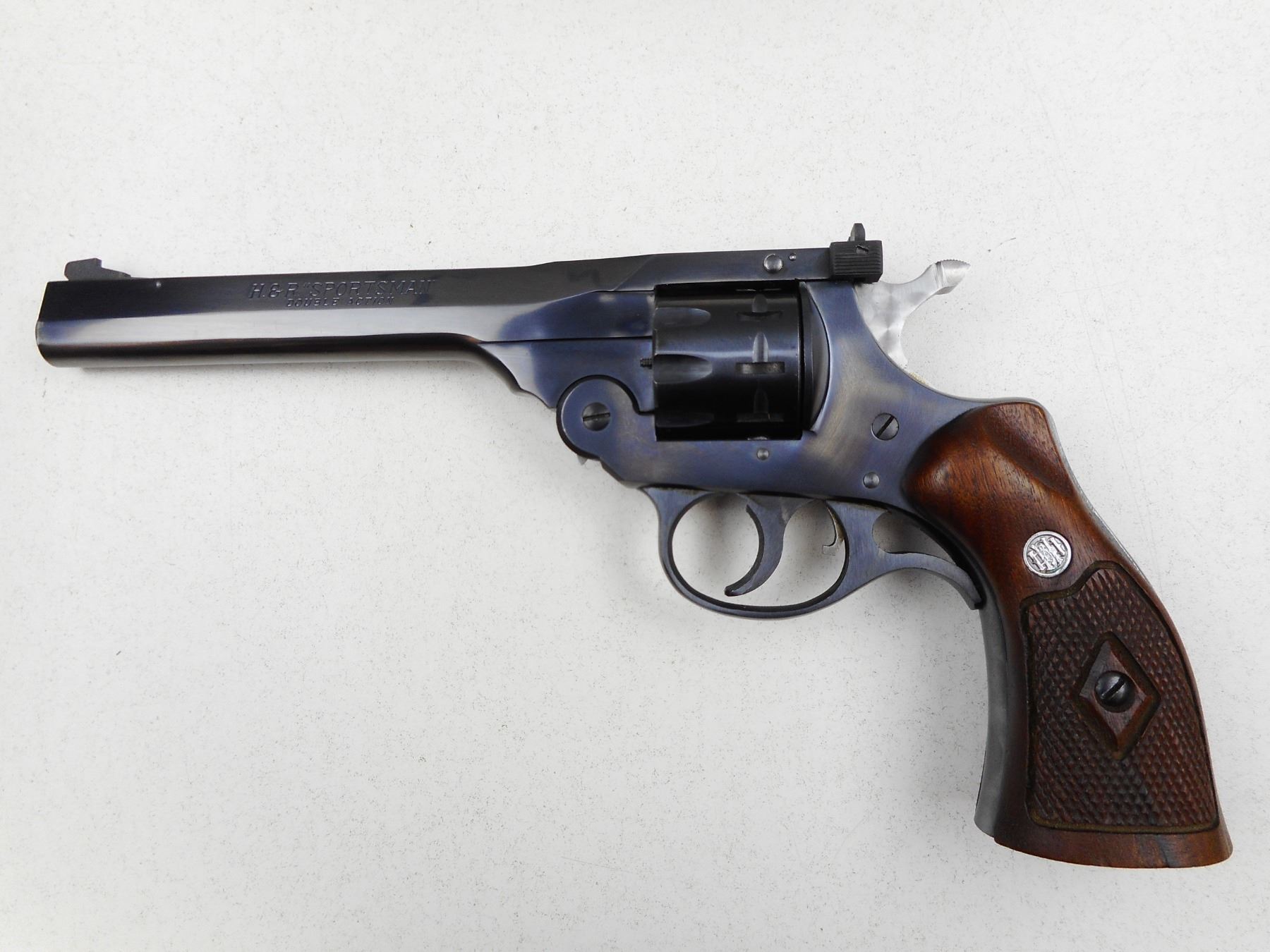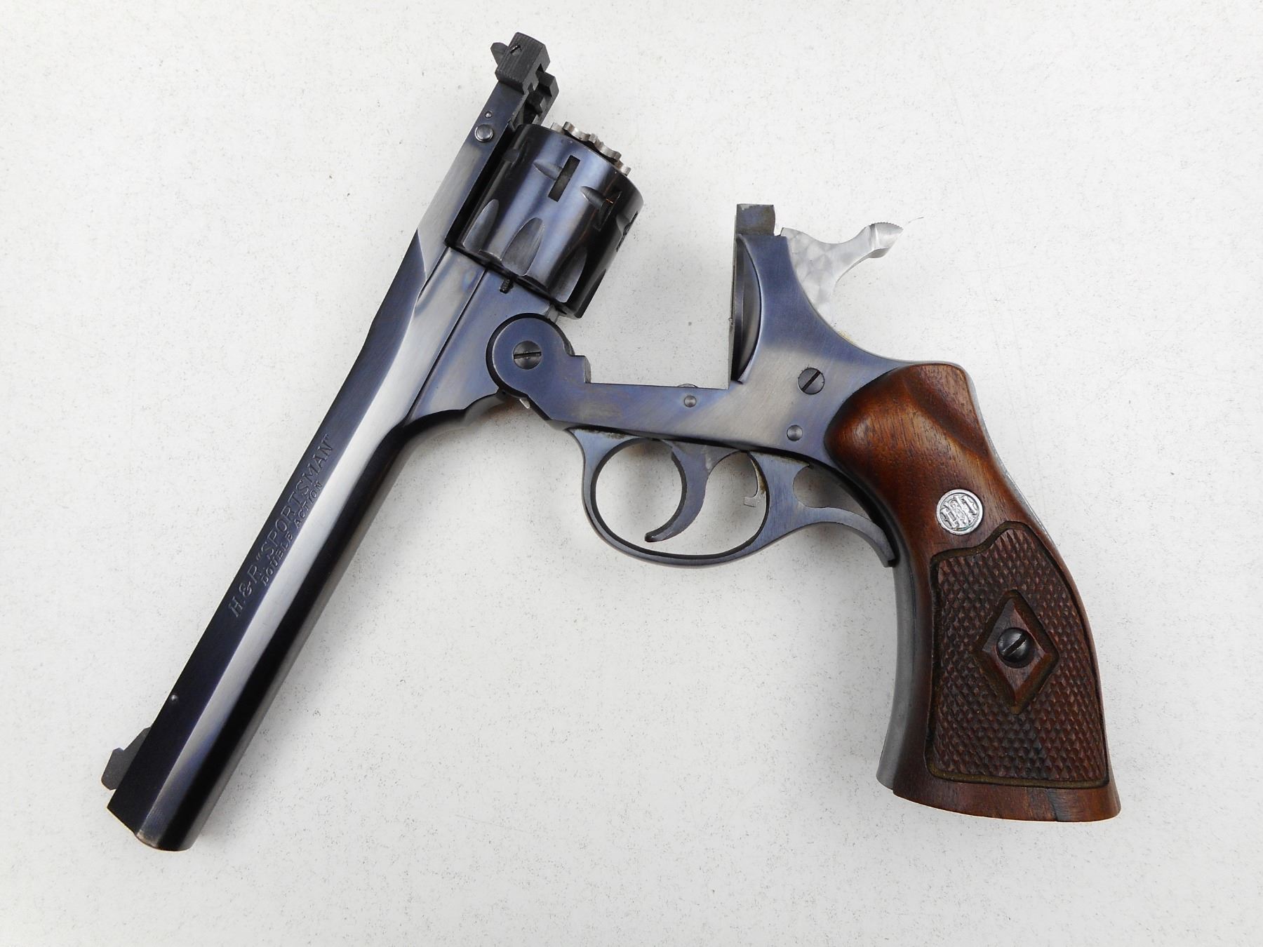 HARRINGTON & RICHARDSON , MODEL: SPORTSMAN , CALIBER: 22 LR , BORE IS VERY GOOD, BLADE FRONT AND ADJUSTABLE REAR SIGHTS, CHECKERED WOOD GRIPS PANELS, SHOWS VERY LITTLE HANDLING MARKS, JEWELLED TRIGGER , SERIAL # S39079 , ACTION: REVOLVER , BARREL LENGTH: 152MM , CONDITION: 8/10 , STOCK # 2774 , CLASS: CANADIAN RESTRICTED CLASS