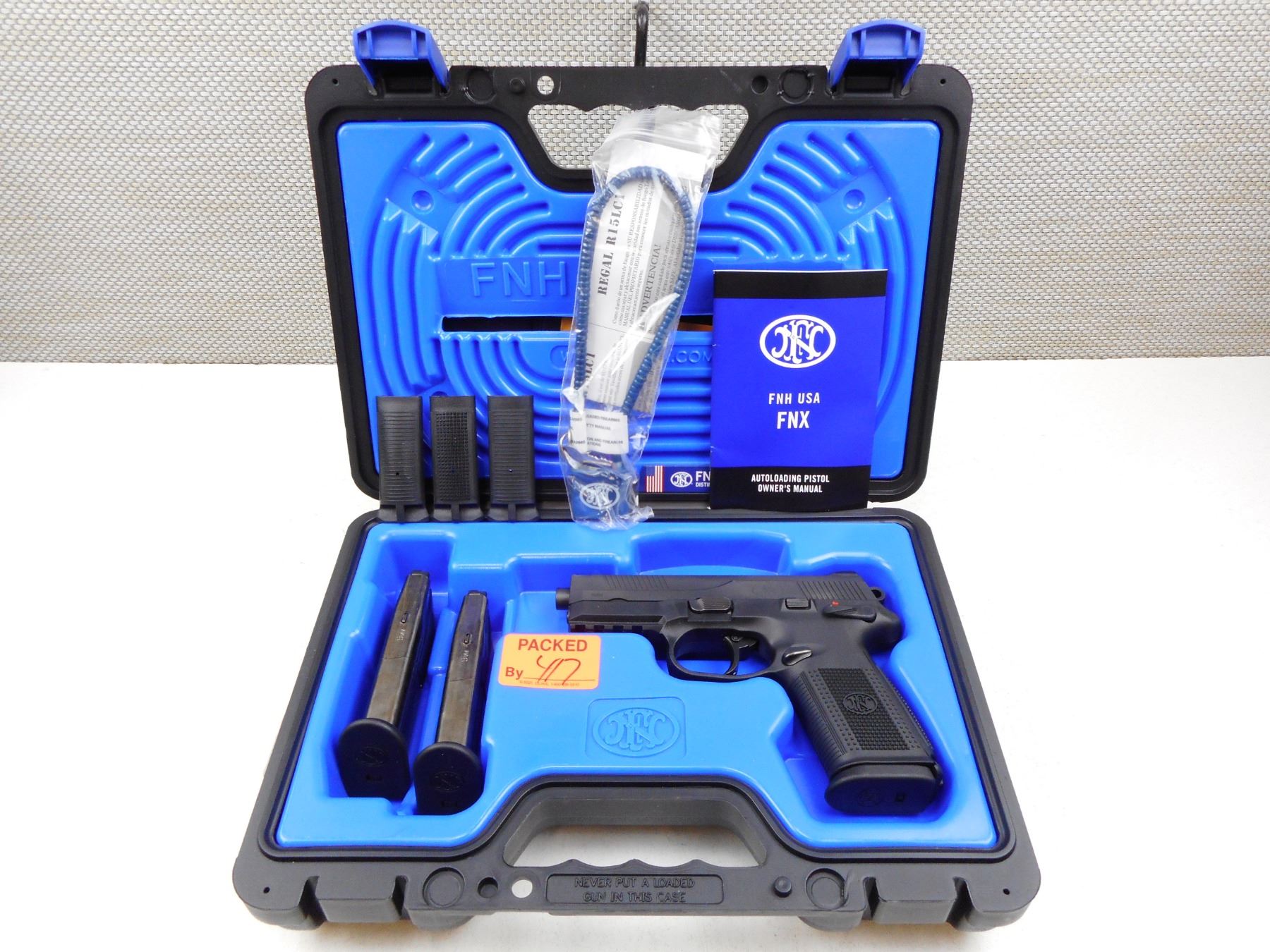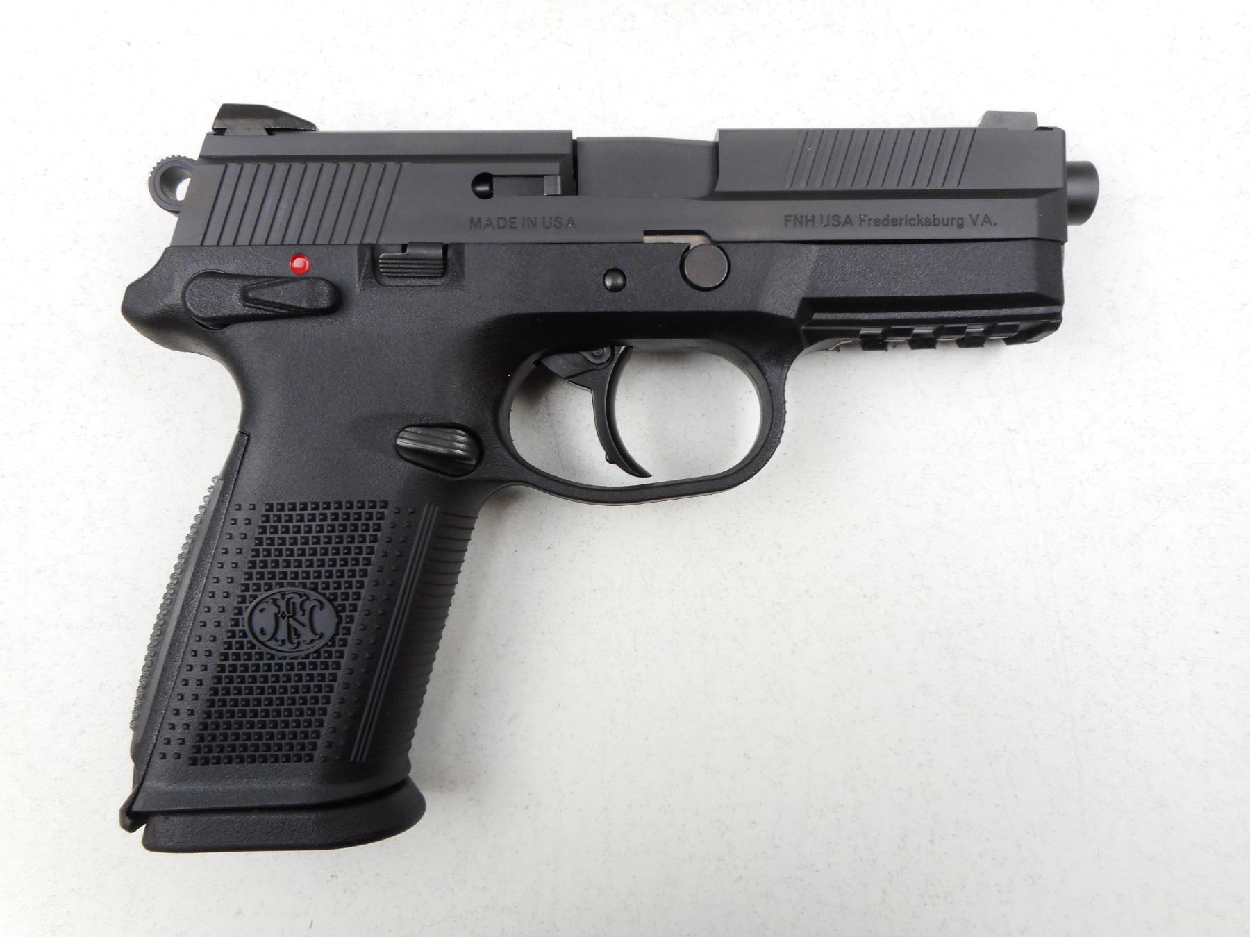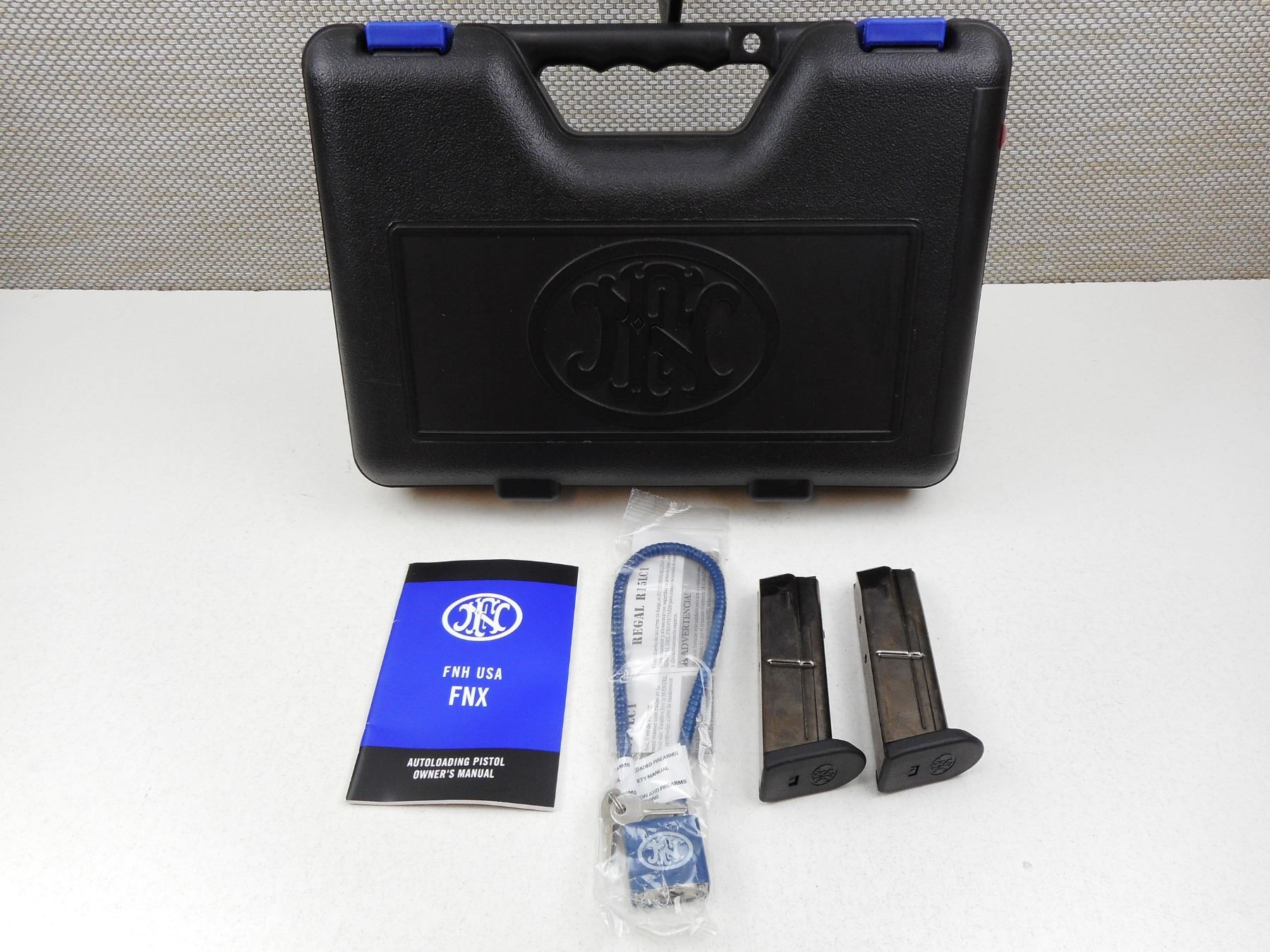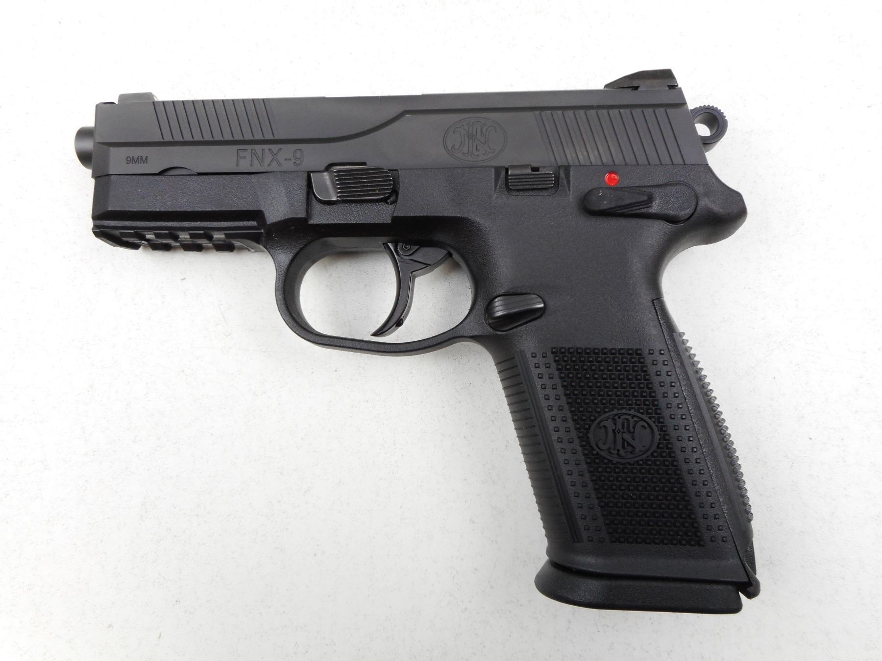 FN , MODEL: FNX9 , CALIBER: 9MM LUGER , COMES WITH CASE, 3 MAGAZINES, MANUAL AND ACCESSORIES, 10 SHOT CAPACITY, EXCELLENT BORE, 3 DOT SIGHT SYSTEM, SYNTHETIC RECEIVER FRAME WITH CHECKERED GRIPS, SHOWS VERY LITTLE HANDLING MARKS , SERIAL # FX1U052191 , ACTION: SEMI-AUTOMATIC HANDGUN , BARREL LENGTH: 106MM , CONDITION: 9/10 , STOCK # 2777 , CLASS: CANADIAN RESTRICTED CLASS