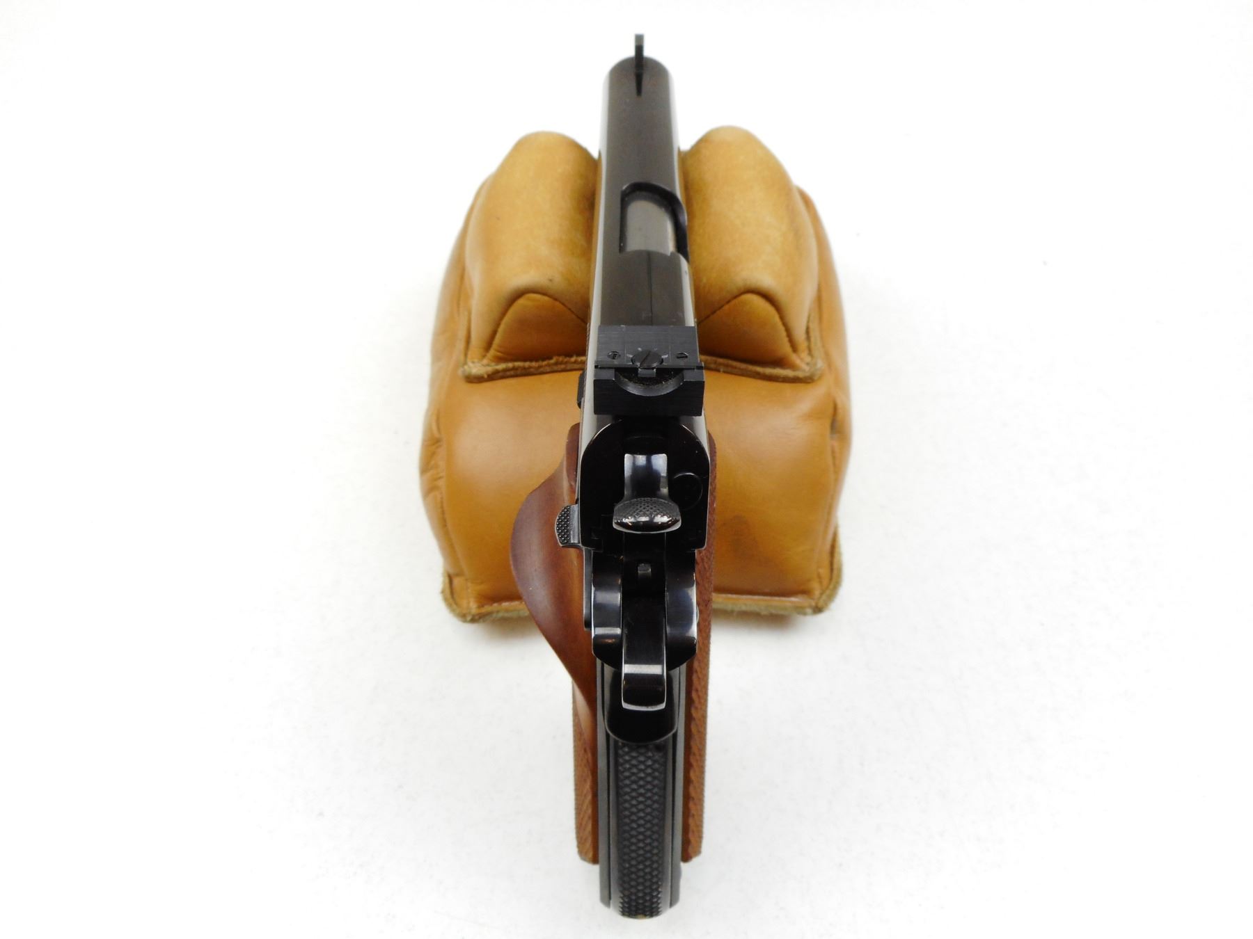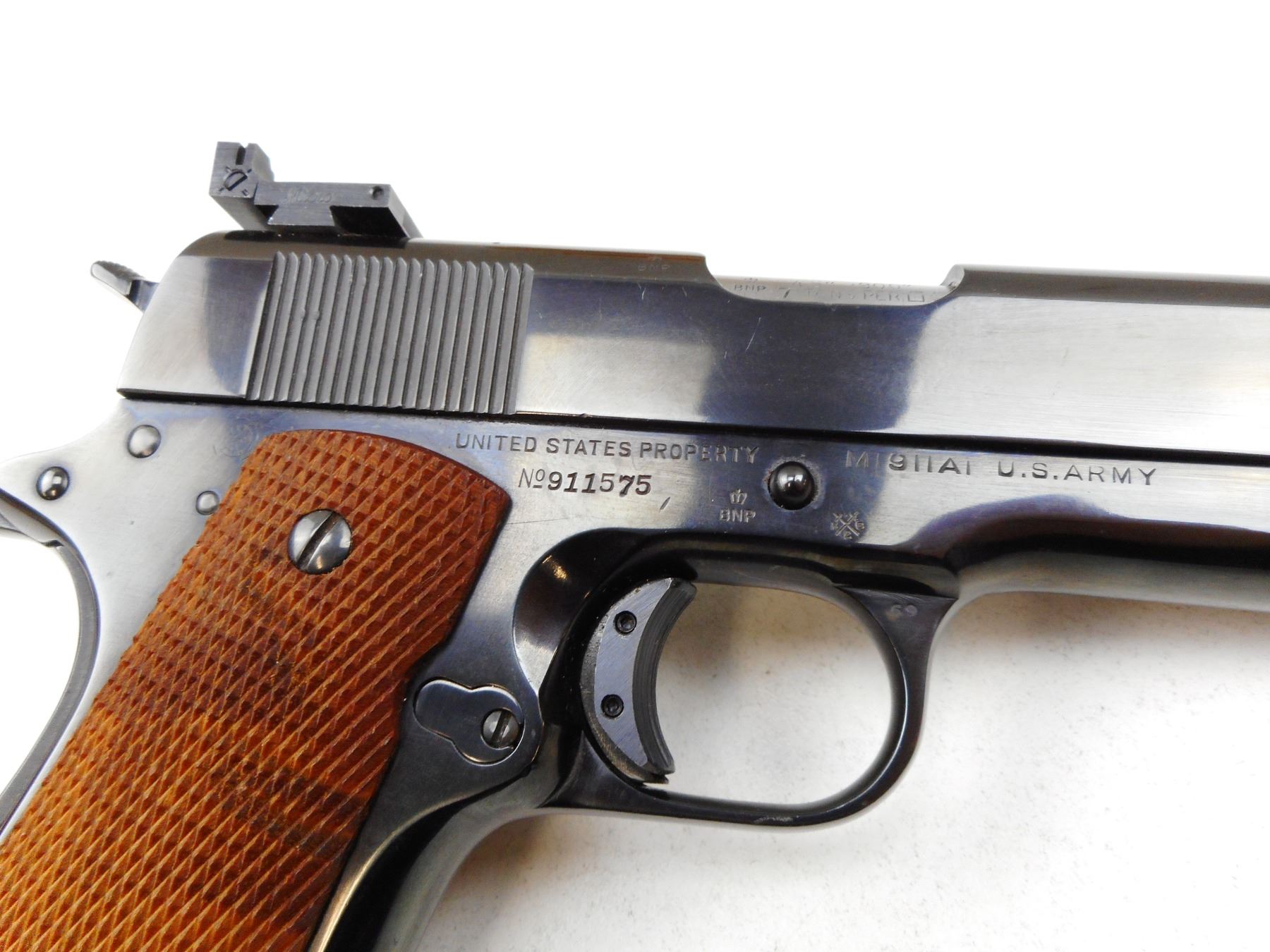 COLT , MODEL: M1911A1 US ARMY , CALIBER: 45 AUTO , COMES WITH MAGAZINE, BORE IS EXCELLENT, BLADE FRONT AND FULLY ADJUSTABLE REAR SIGHTS, CUSTOM CHECKERED WOOD GRIPS WITH THUMB REST, MAY HAVE BEEN REBLUED, HAS A CUSTOM WIDE TRIGGER, SHOWS VERY LITTLE HANDLING MARKS , SERIAL # 911575 , ACTION: SEMI-AUTOMATIC HANDGUN , BARREL LENGTH: 127MM , CONDITION: 8/10 , STOCK # 2779 , CLASS: CANADIAN RESTRICTED CLASS