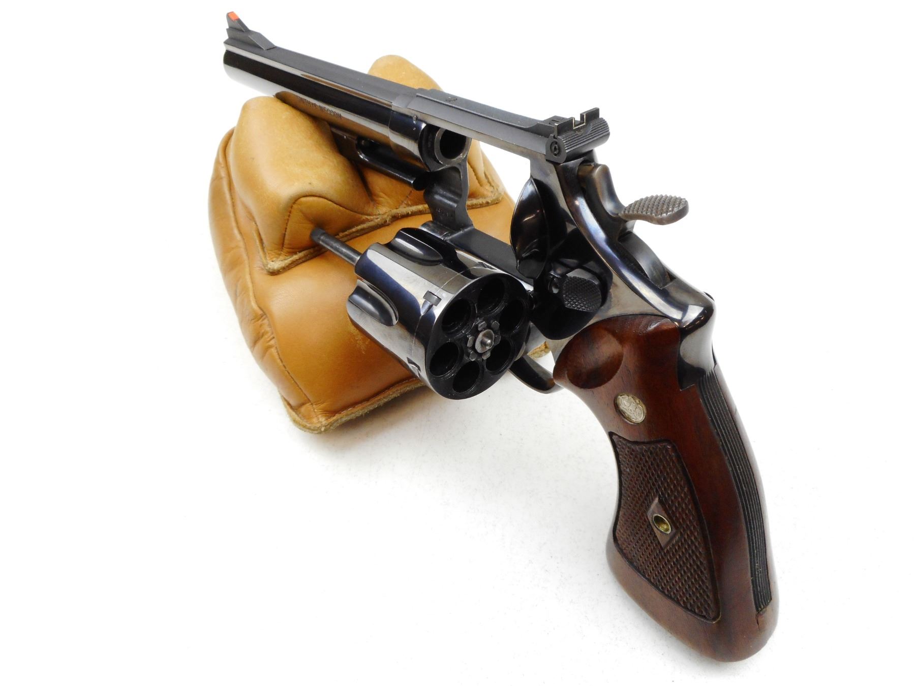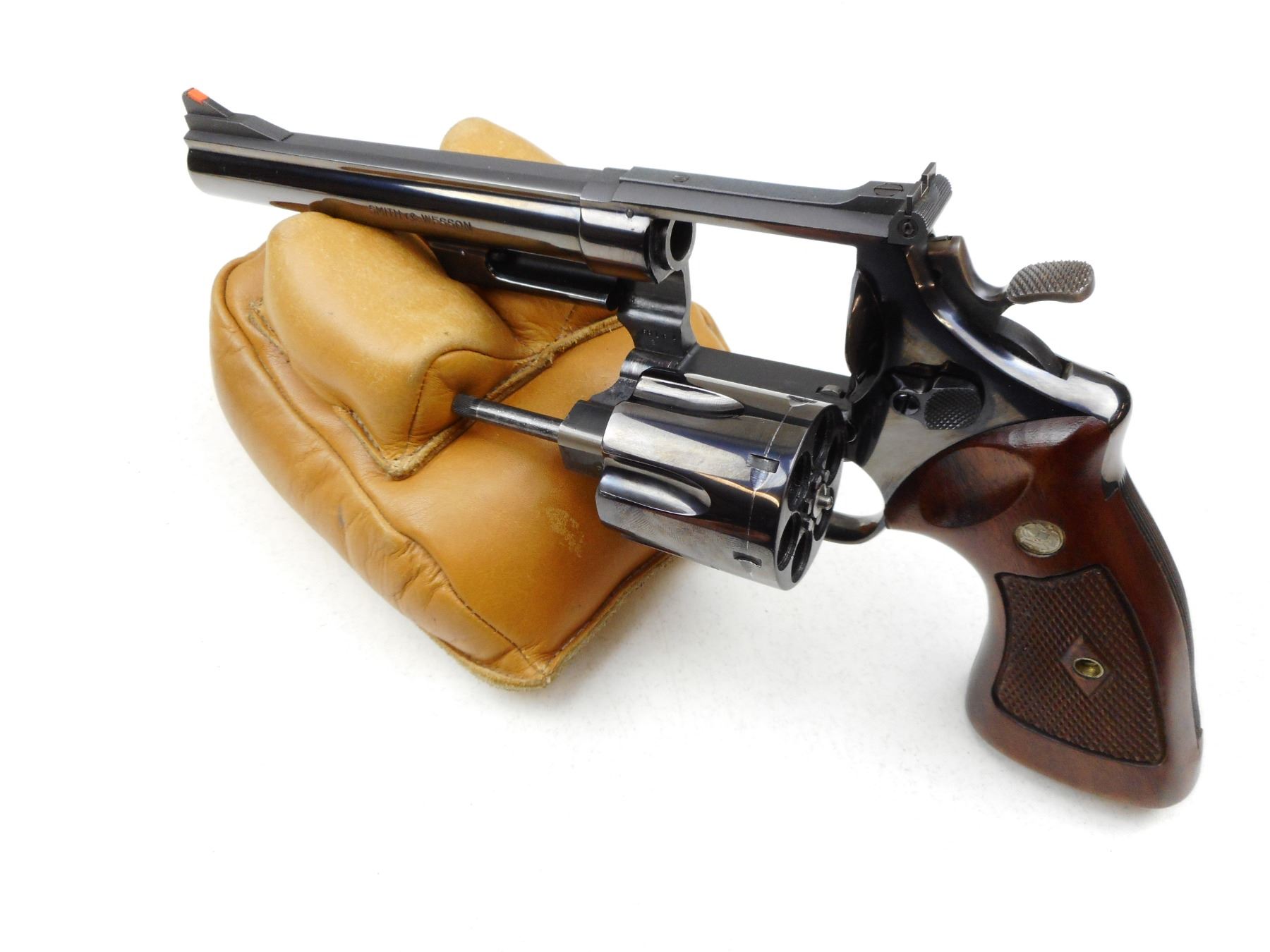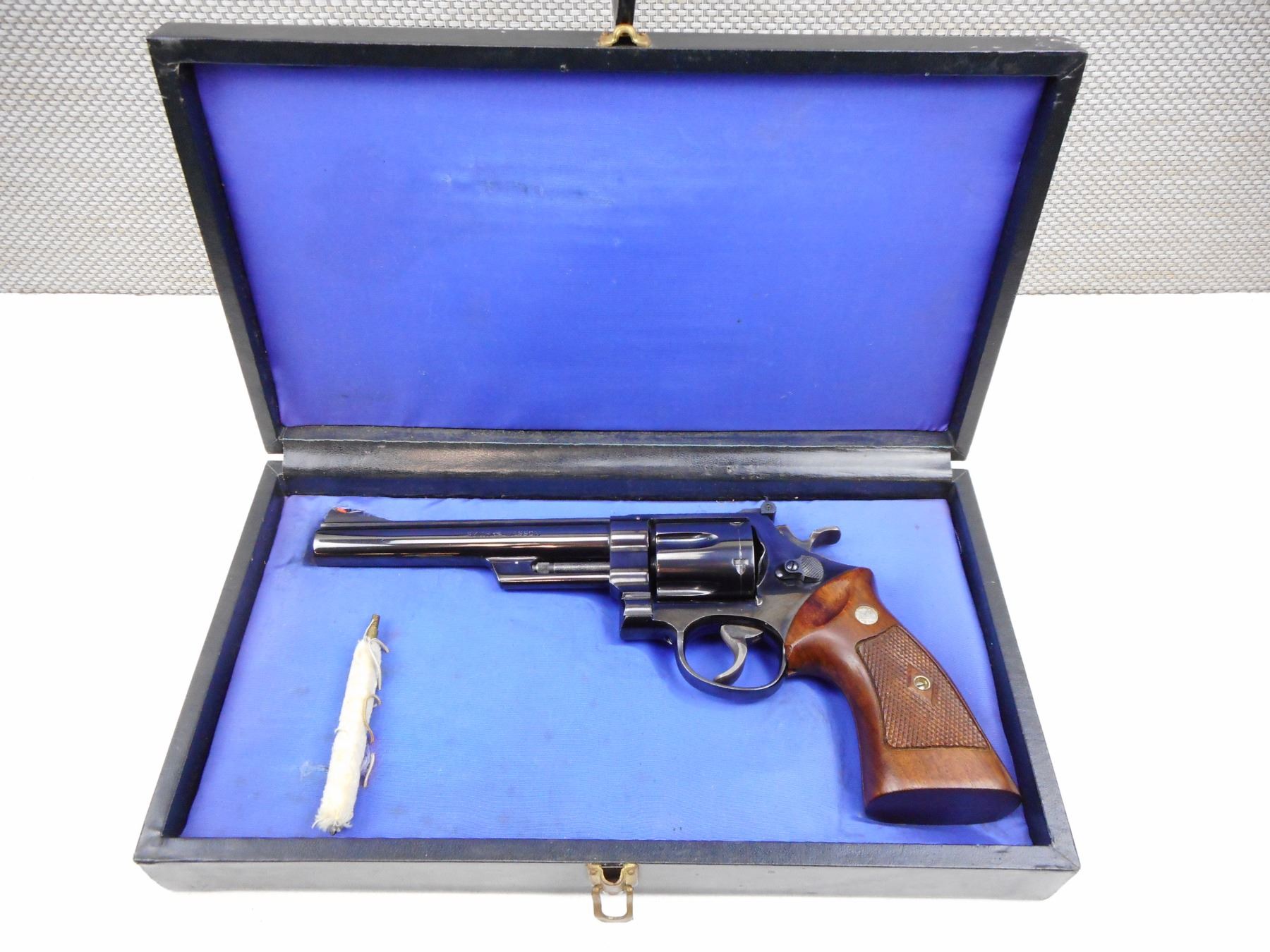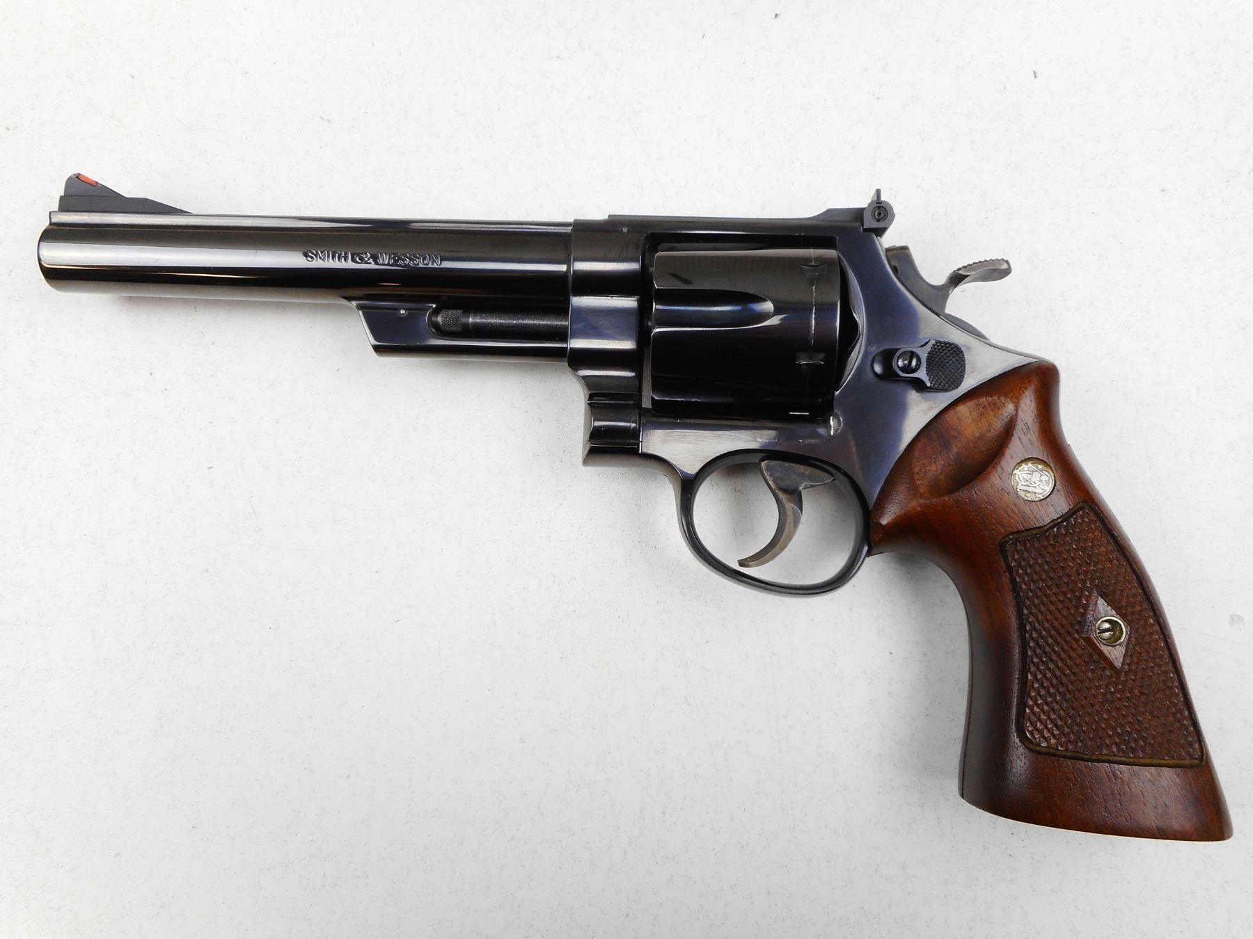 SMITH & WESSON , MODEL: HAND EJECTOR 44 MAGNUM , CALIBER: 44 MAGNUM , COMES WITH A CASE, BORE IS VERY GOOD, RAMP FRONT SIGHT WITH RED INSERT, ADJUSTABLE REAR SIGHTS, CHECKERED WOOD GRIP PANELS WITH S&W LOGO, SHOWS SOME HANDLING MARKS , SERIAL # S145304 , ACTION: REVOLVER , BARREL LENGTH: 165MM , CONDITION: 8/10 , STOCK # 2782 , CLASS: CANADIAN RESTRICTED CLASS