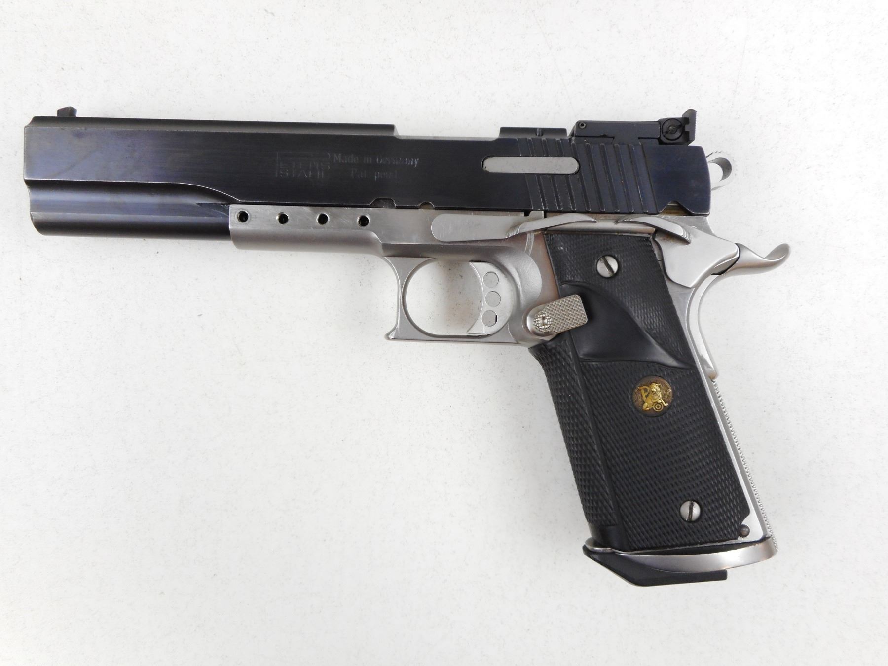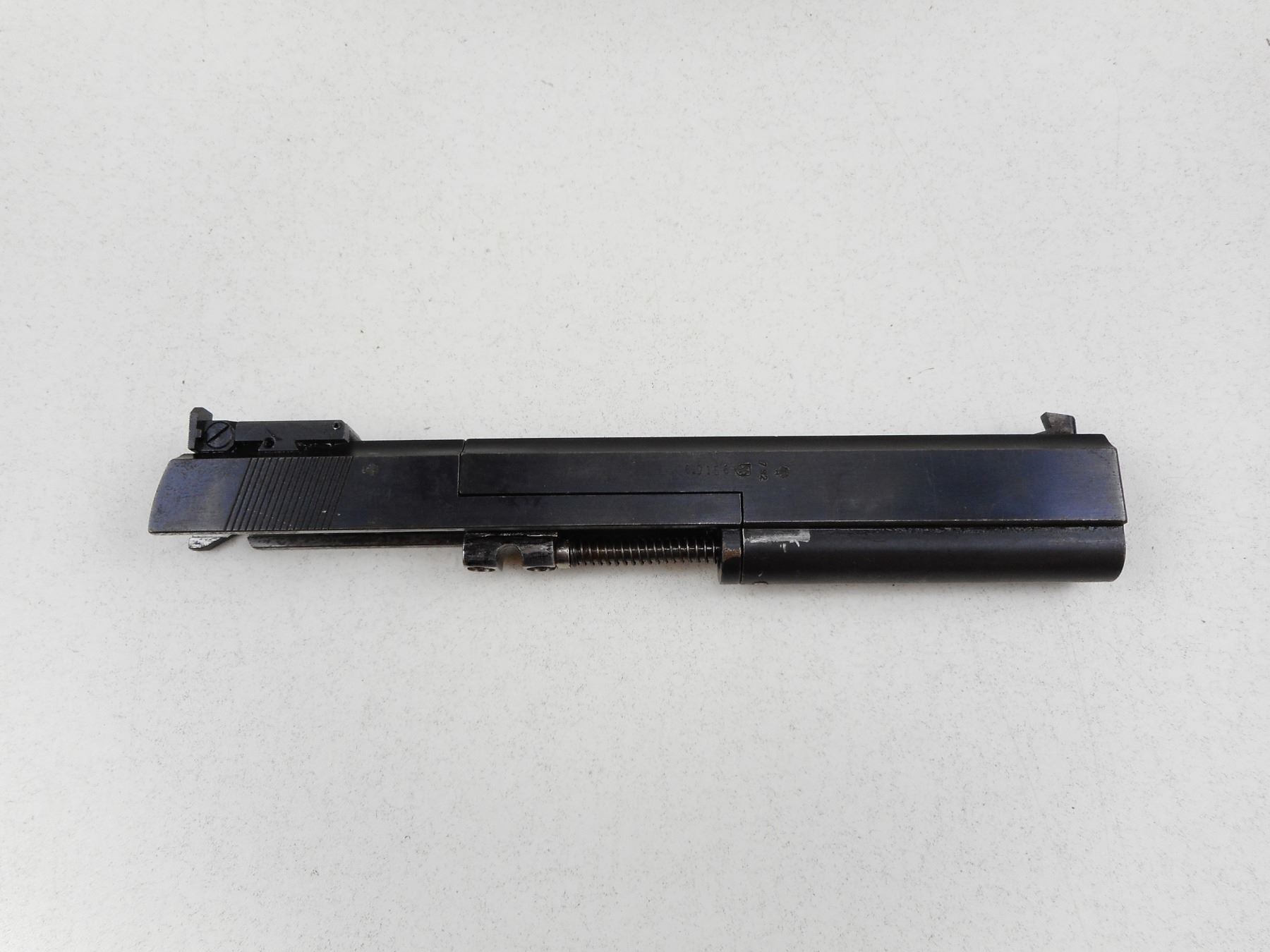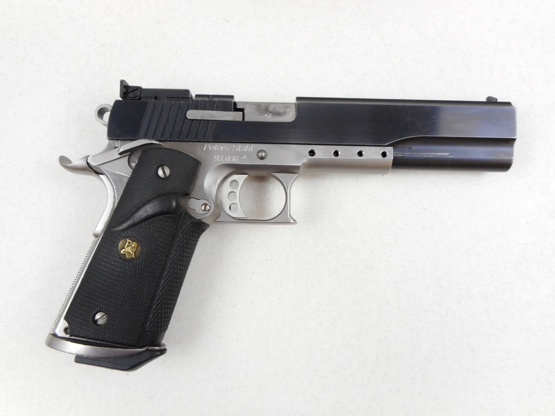 PETERS-STAHL , MODEL: HC , CALIBER: 38 SUPER/22 LR , COMES WITH EXTRA 22 LR BARREL WITH AN EXCELLENT BORE AND SLIDE ASSEMBLY, 10 MAGAZINES (9 FOR THE 38 SUPER 1 FOR THE 22 LR), 38 SUPER FIRED AND UNPRIMED BRASS, 38 SUPER 3 DIE SET,SPARE RECOIL SPRINGS, AND MAGAZINE CATCH, BORE IS EXCELLENT, BLADE FRONT AND ADJUSTABLE REAR SIGHTS, EXTENDED BEAVERTAIL GRIP SAFETY, SKELETON TRIGGER, PACHMAYR GRIPS, SHOWS SOME HANDLING MARKS , SERIAL # 93036 , ACTION: SEMI-AUTOMATIC HANDGUN , BARREL LENGTH: 152MM , CONDITION: 7/10 , STOCK # 2794 , CLASS: CANADIAN RESTRICTED CLASS