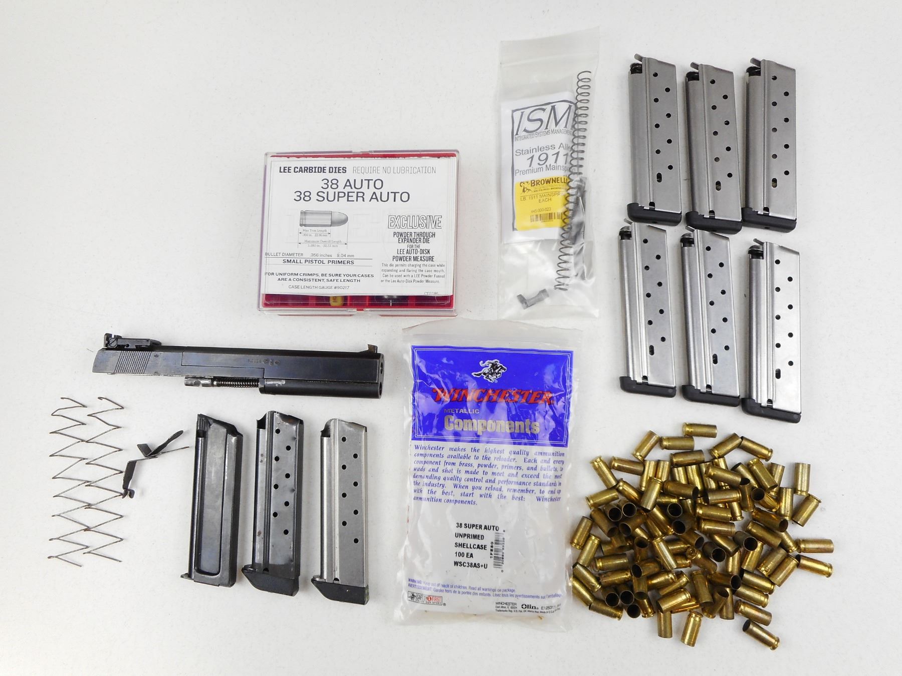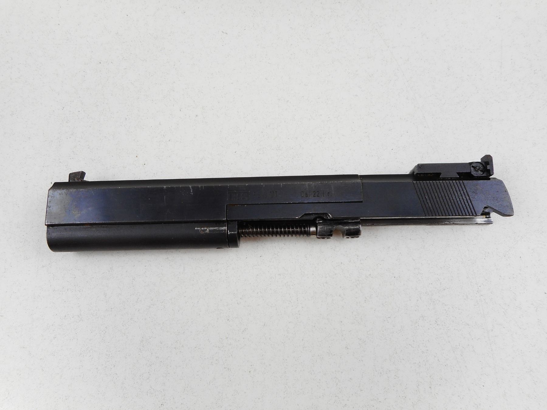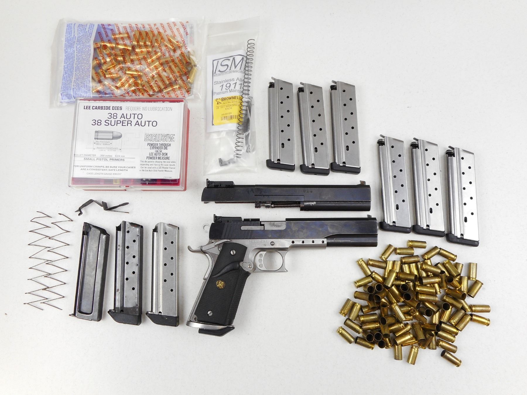 PETERS-STAHL , MODEL: HC , CALIBER: 38 SUPER/22 LR , COMES WITH EXTRA 22 LR BARREL WITH AN EXCELLENT BORE AND SLIDE ASSEMBLY, 10 MAGAZINES (9 FOR THE 38 SUPER 1 FOR THE 22 LR), 38 SUPER FIRED AND UNPRIMED BRASS, 38 SUPER 3 DIE SET,SPARE RECOIL SPRINGS, AND MAGAZINE CATCH, BORE IS EXCELLENT, BLADE FRONT AND ADJUSTABLE REAR SIGHTS, EXTENDED BEAVERTAIL GRIP SAFETY, SKELETON TRIGGER, PACHMAYR GRIPS, SHOWS SOME HANDLING MARKS , SERIAL # 93036 , ACTION: SEMI-AUTOMATIC HANDGUN , BARREL LENGTH: 152MM , CONDITION: 7/10 , STOCK # 2794 , CLASS: CANADIAN RESTRICTED CLASS