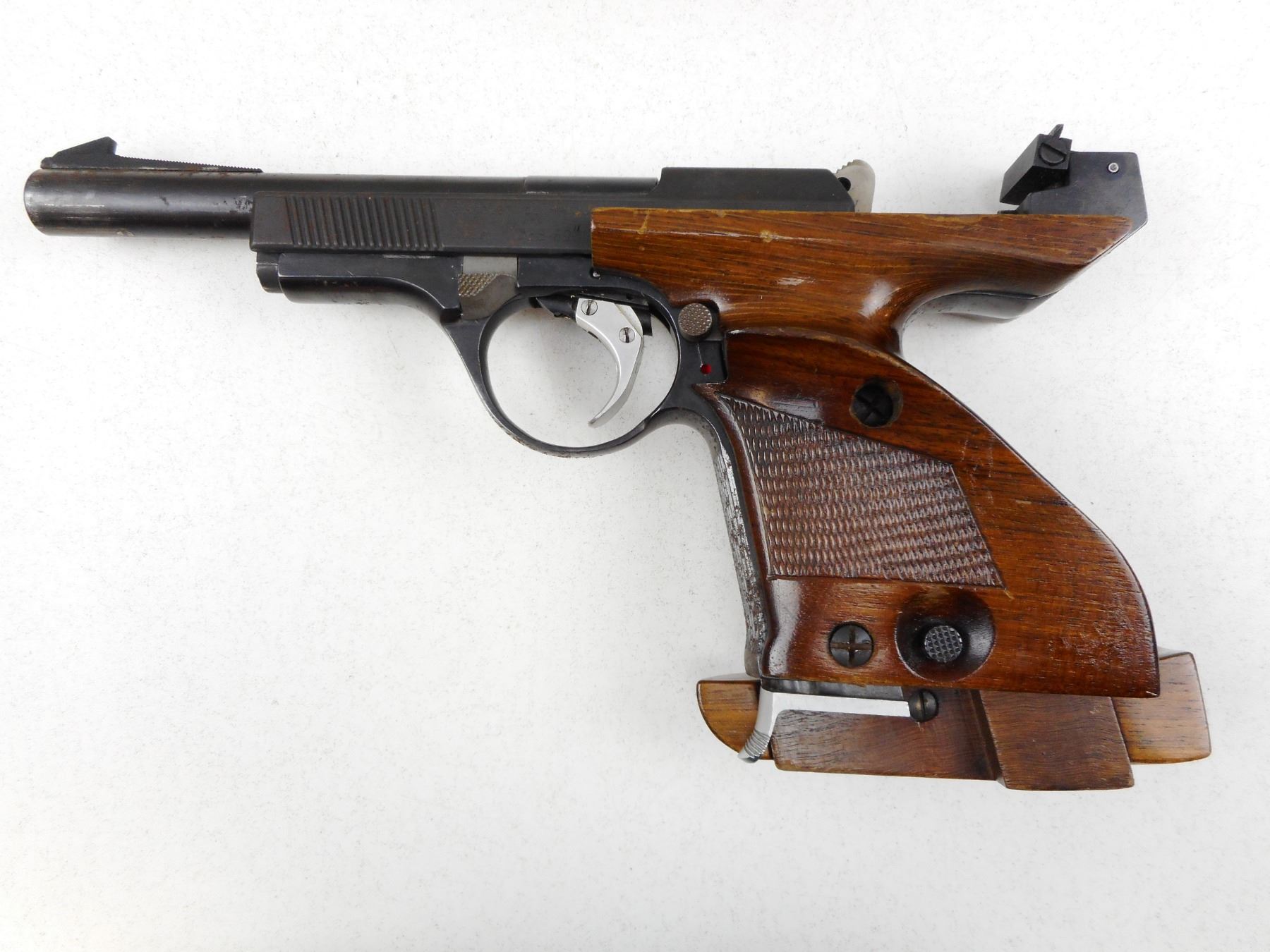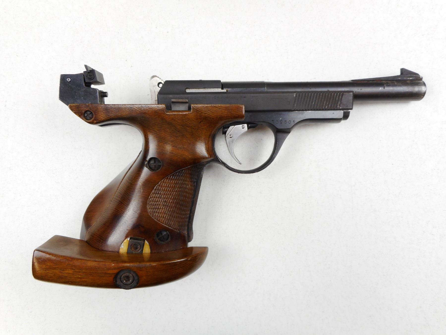 UNIQUE , MODEL: DES/69 , CALIBER: 22 LR , COMES WITH MAGAZINE, 10 SHOT CAPACITY, BORE IS EXCELLENT, BLADE FRONT AND FULLY ADJUSTABLE REAR SIGHTS, ERGONOMIC CHECKERED GRIPS WITH ADJUSTABLE PALM REST, SHOWS SOME HANDLING MARKS , SERIAL # 739501 , ACTION: SEMI-AUTOMATIC HANDGUN , BARREL LENGTH: 150MM , CONDITION: 8/10 , STOCK # 2798 , CLASS: CANADIAN RESTRICTED CLASS