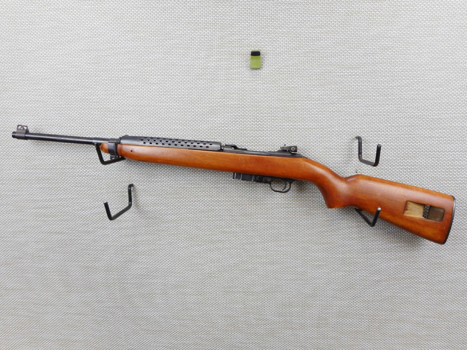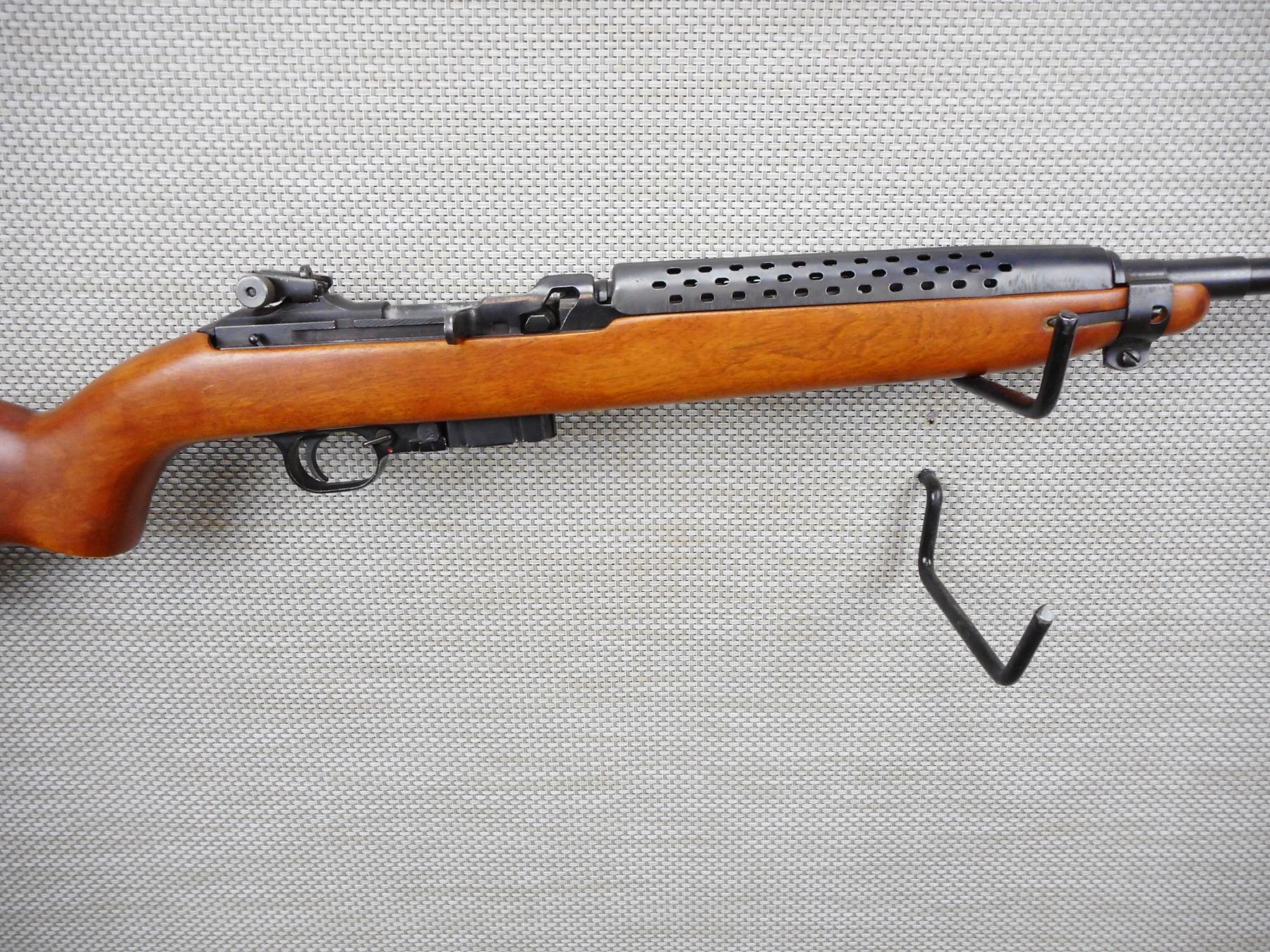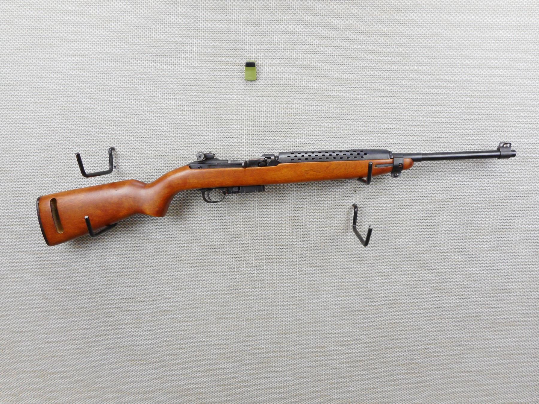 UNIVERSAL , MODEL: M1 CARBINE , CALIBER: 30 CARBINE , COMES WITH MAGAZINE, ADJ REAR FLIP PEEP & FRONT BLADE SIGHT, WOOD STOCKS , SLING LOOP, EXCELLENT BORE, BLUE FINISH, HEAT SHIELD, RESTRICTED CLASS RIFLE , SERIAL # 338649 , ACTION: RIFLE / SEMI-AUTOMATIC HANDGUN , BARREL LENGTH: 457MM , CONDITION: 9/10 , STOCK # 2811 , CLASS: CANADIAN RESTRICTED CLASS