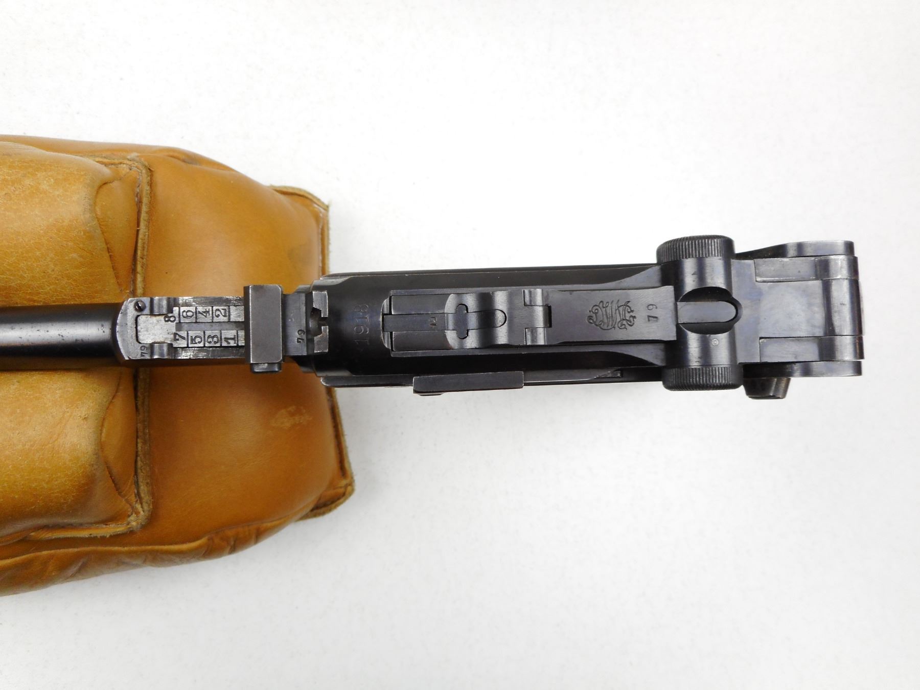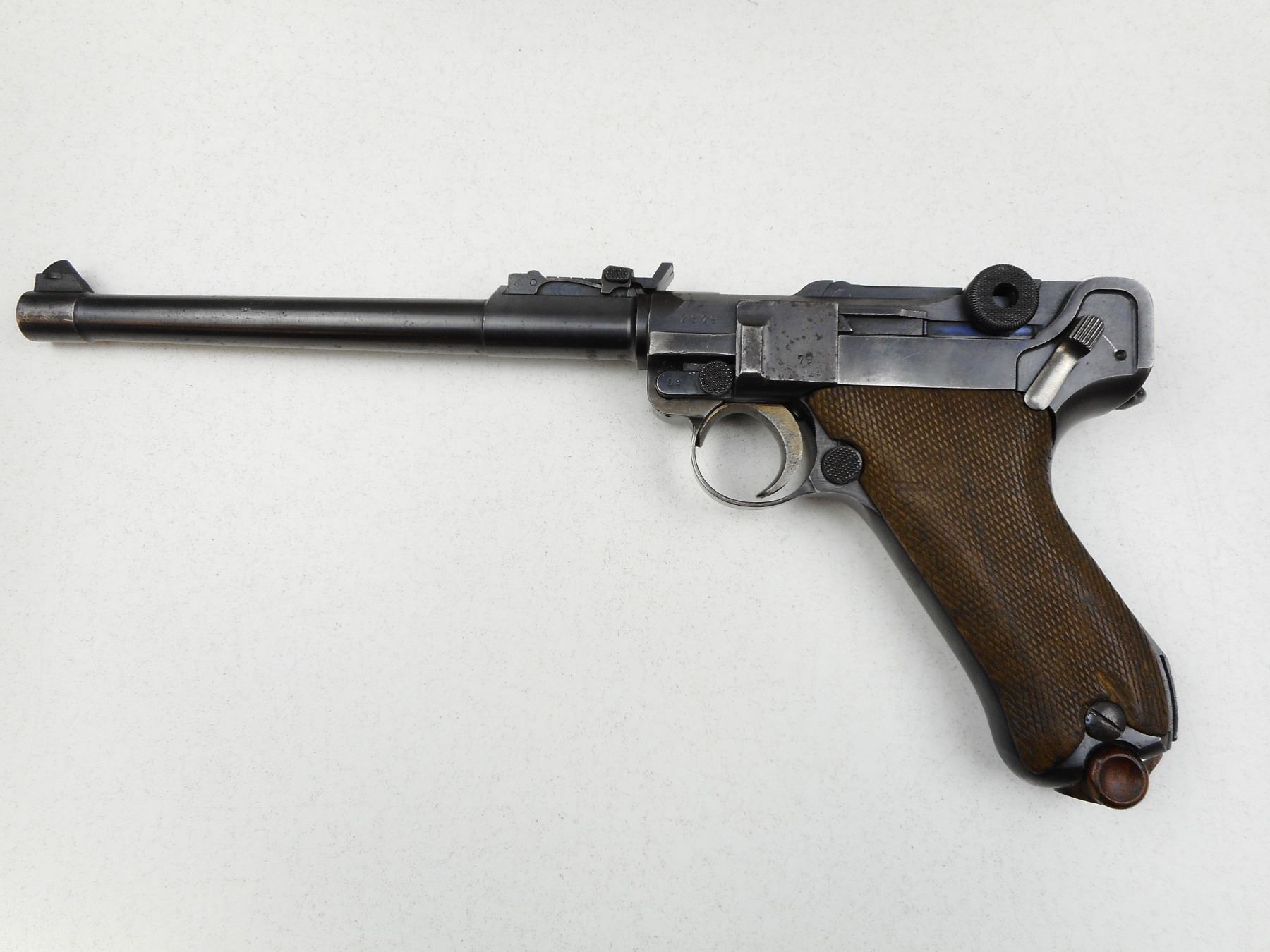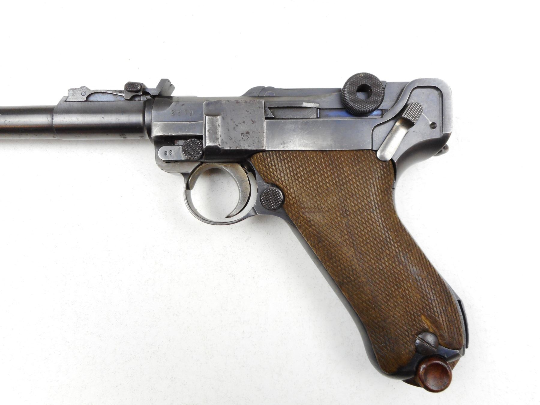 LUGER , MODEL: 1914 ARTILLERY , CALIBER: 9MM LUGER , COMES WITH MISMATCHED BY SERIAL # WOOD BOTTOM MAGAZINE, DATED 1918, MADE BY DWM, BORE IS GOOD, BLADE FRONT AND ADJUSTABLE REAR SIGHTS FROM 100-800 METRES, SEVERAL MISMATCHED PARTS BY SERIAL #, SHOWS SOME HANDLING MARKS, RETAINS 90% OF ORIGINAL BLUEING, SOME LIGHT PITTING ON THE LEFT SIDE PLATE, CHECKERED WOOD GRIP PANEL WITH SMALL CHIP OUT OF LEFT GRIP PANEL , SERIAL # 874602879 , ACTION: SEMI-AUTOMATIC HANDGUN , BARREL LENGTH: 203MM , CONDITION: 6/10 , STOCK # 2831 , CLASS: CANADIAN RESTRICTED CLASS