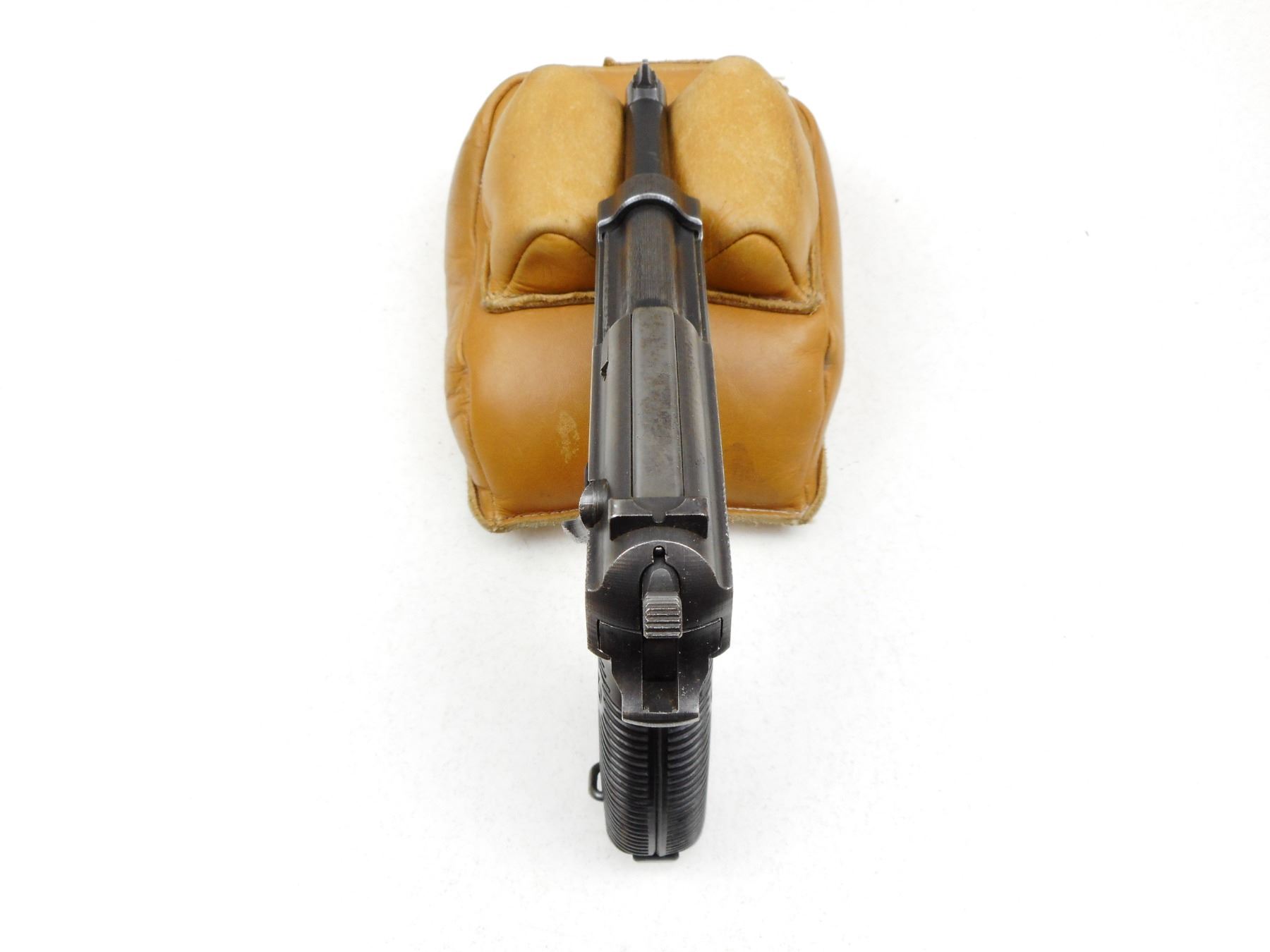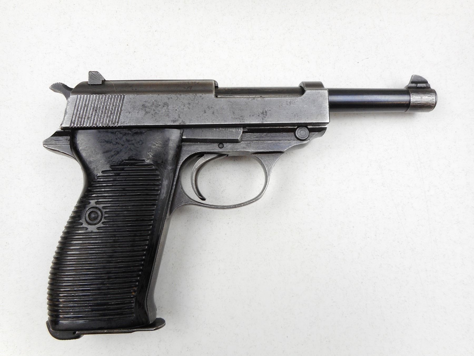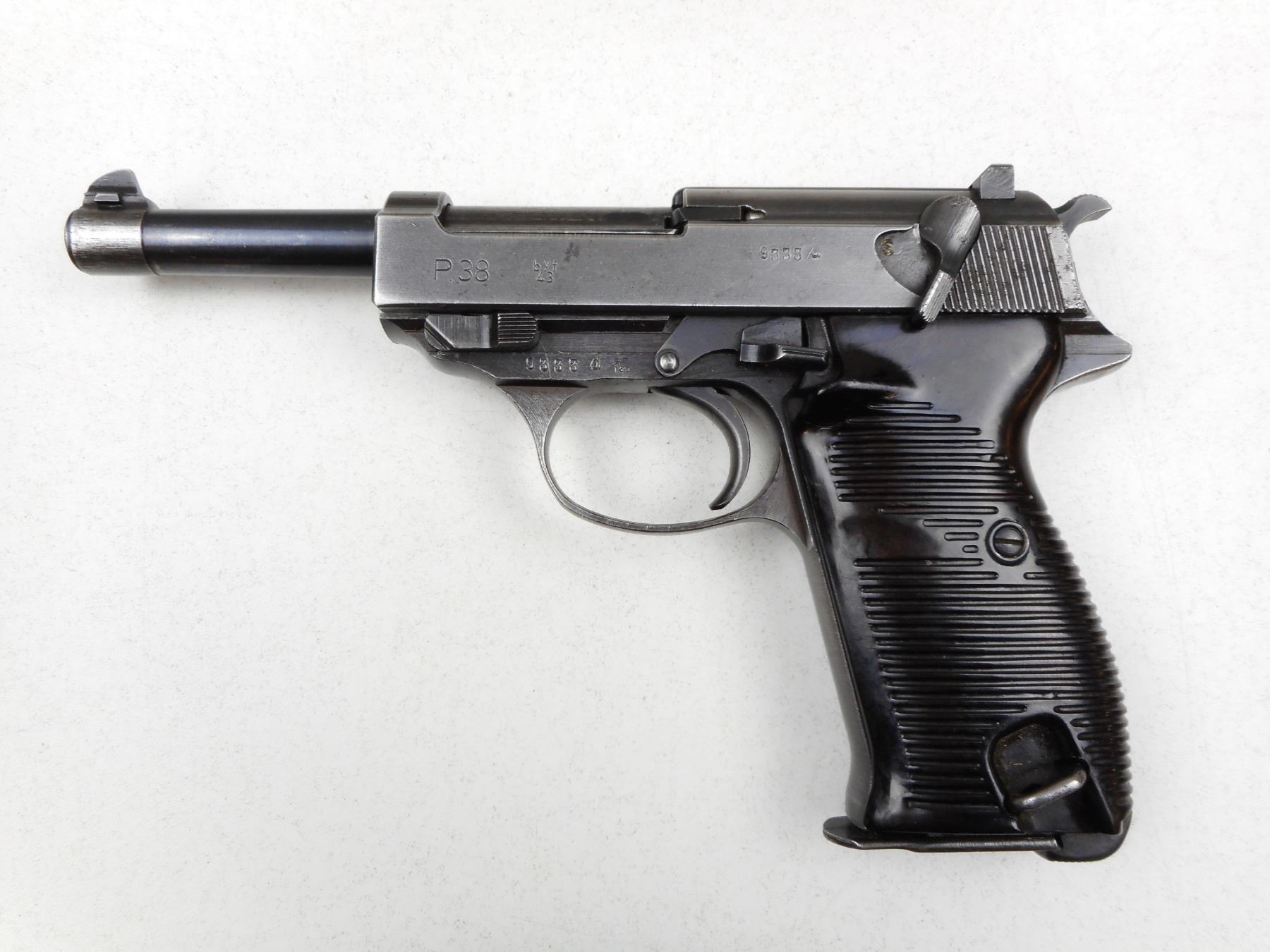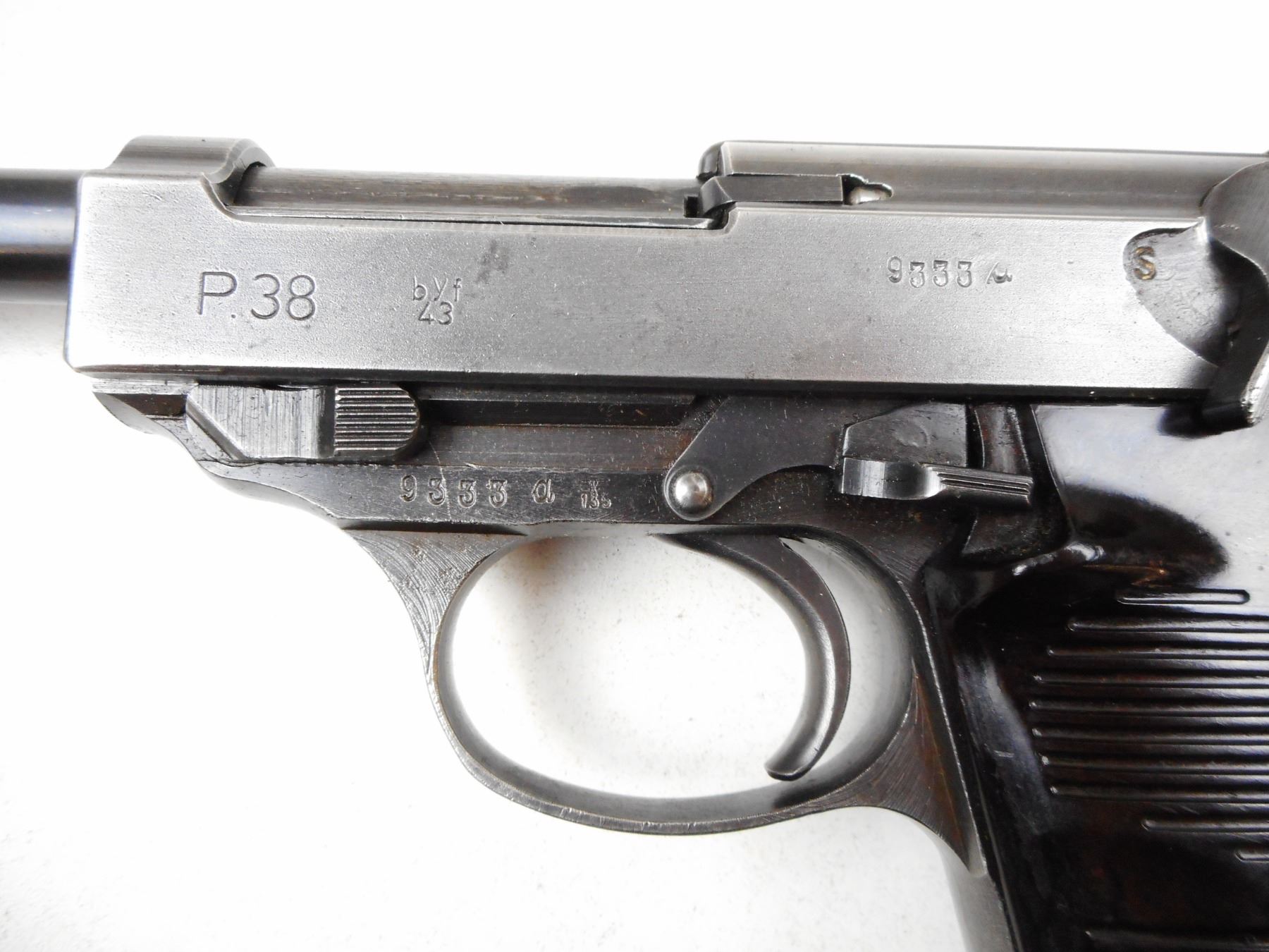 WWII ERA, WALTHER , MODEL: P38 , CALIBER: 9MM LUGER , COMES WITH NON NUMBERED MAGAZINE, ALL EXTERNAL PARTS APPEAR TO BE MATCHING, BORE IS VERY GOOD, MADE BY MAUSER IN 1943, NUMEROUS WAR TIME GERMAN MARKINGS, PLASTIC GRIPS, SOME LIGHT SURFACE PITTING ON THE SLIDE, BLADE FRONT AND FIXED REAR SIGHTS, SHOWS SOME HANDLING MARKS , SERIAL # 9333A , ACTION: SEMI-AUTOMATIC HANDGUN , BARREL LENGTH: 121MM , CONDITION: 6/10 , STOCK # 2832 , CLASS: CANADIAN RESTRICTED CLASS