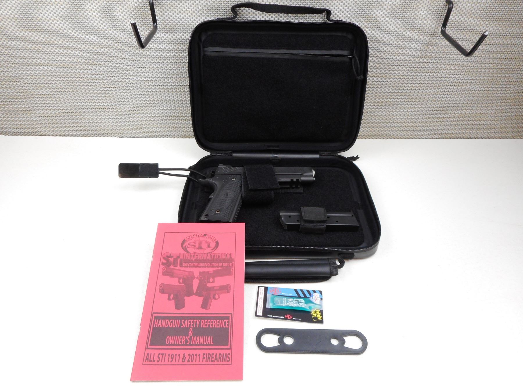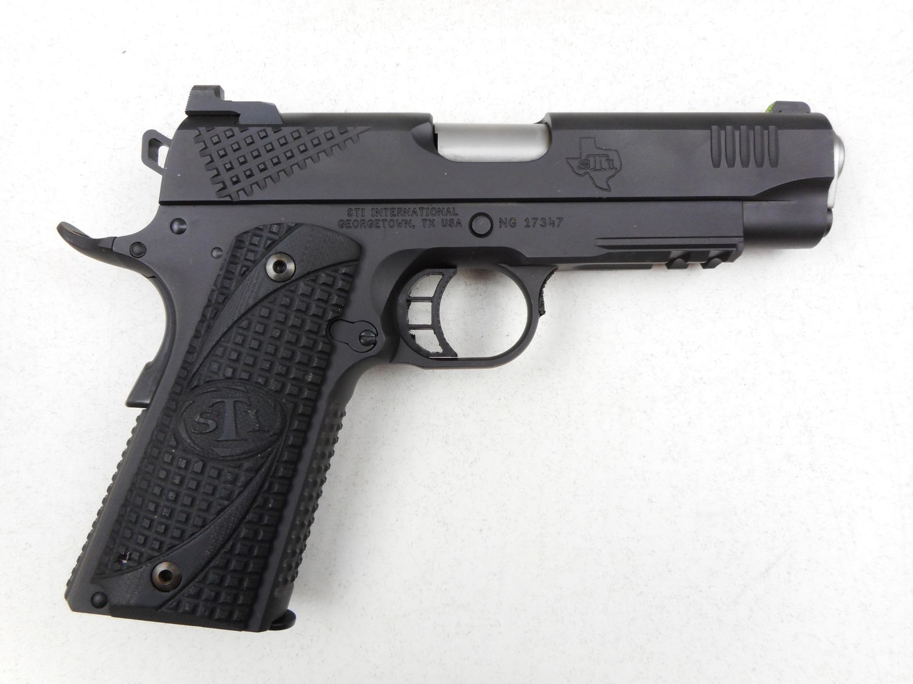 STI INTERNATIONAL , MODEL: 1911 DUTY ONE 4.0 , CALIBER: 9MM LUGER , COMES WITH CASE, 2 MAGAZINES, AND MANUAL, BORE IS EXCELLENT, BLADE FRONT AND HEINIE ADJUSTABLE REAR SIGHT, STI SYNTHETIC GRIPS, BEAVER TAIL GRIP SAFETY, COMBAT HAMMER, SKELETONIZED TRIGGER, FRONT AND REAR GRIP SERRATIONS, SHOWS VERY FEW HANDLING MARKS , SERIAL # NG17347 , ACTION: SEMI-AUTOMATIC HANDGUN , BARREL LENGTH: 111MM , CONDITION: 9/10 , STOCK # 2841 , CLASS: CANADIAN RESTRICTED CLASS