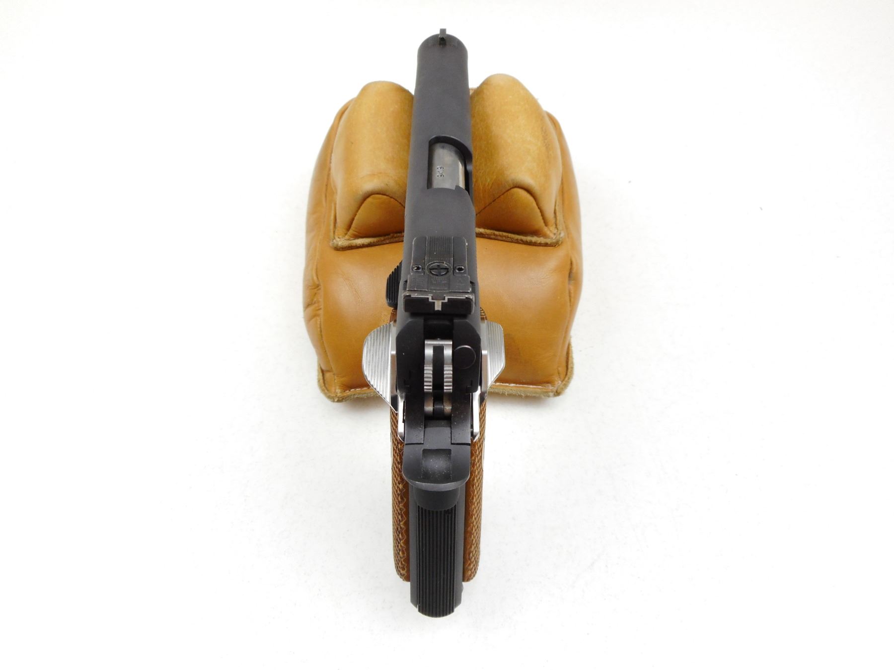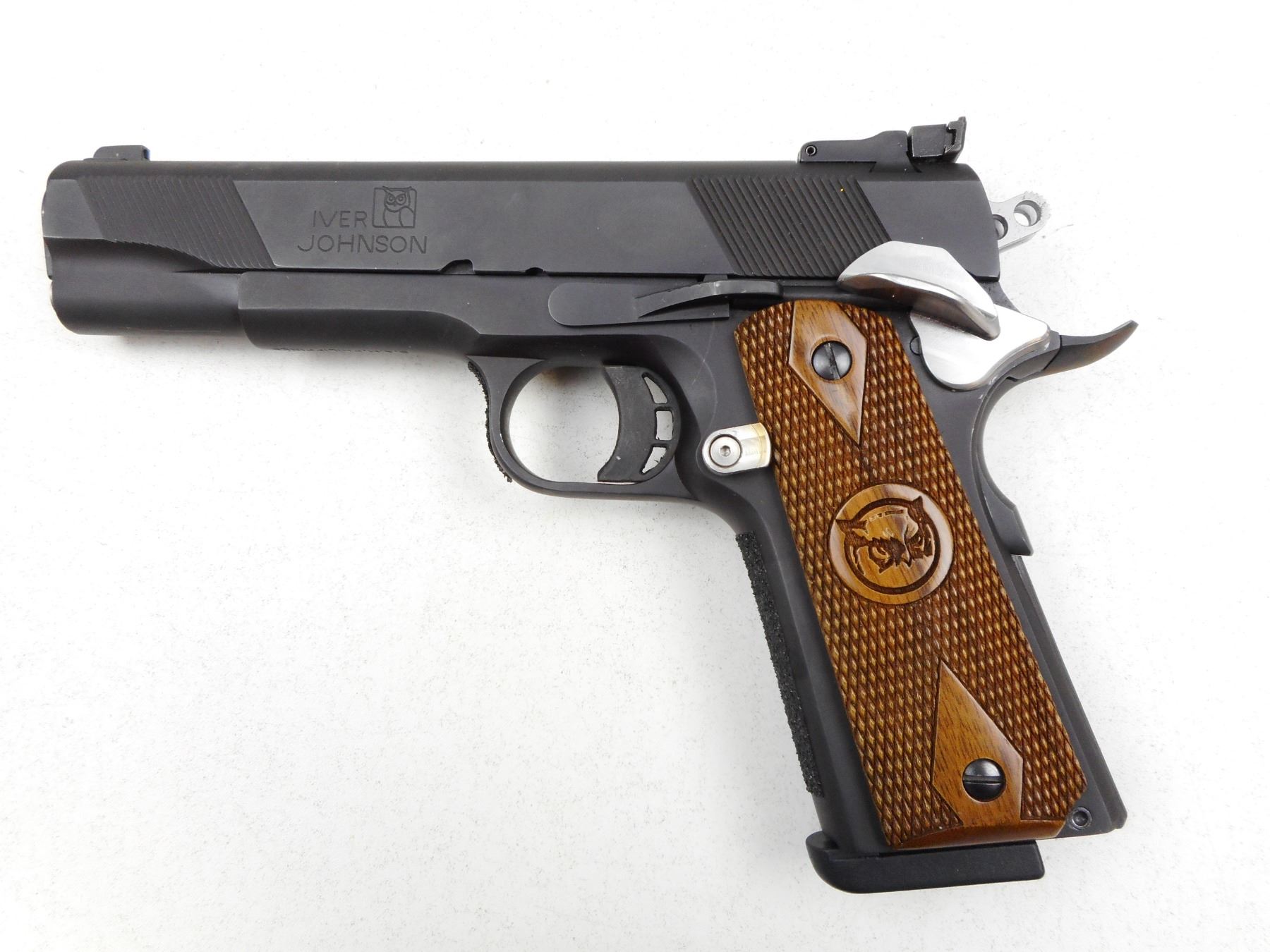 IVER JOHNSON , MODEL: 1911-A1 EAGLE , CALIBER: 9MM LUGER , COMES WITH CASE AND MAGAZINE, EXCELLENT BORE, BLADE FRONT AND ADJUSTABLE REAR SIGHT, COMBAT HAMMER, EXTENDED BEAVER TAIL GRIP SAFETY, SKELETONIZED TRIGGER, CHECKERED WOOD GRIP PANELS, EXTENEDED MAGAZINE RELEASE, APPEARS AS NEW CONDITION , SERIAL # CM900046 , ACTION: SEMI-AUTOMATIC HANDGUN , BARREL LENGTH: 121MM , CONDITION: 9/10 , STOCK # 2842 , CLASS: CANADIAN RESTRICTED CLASS