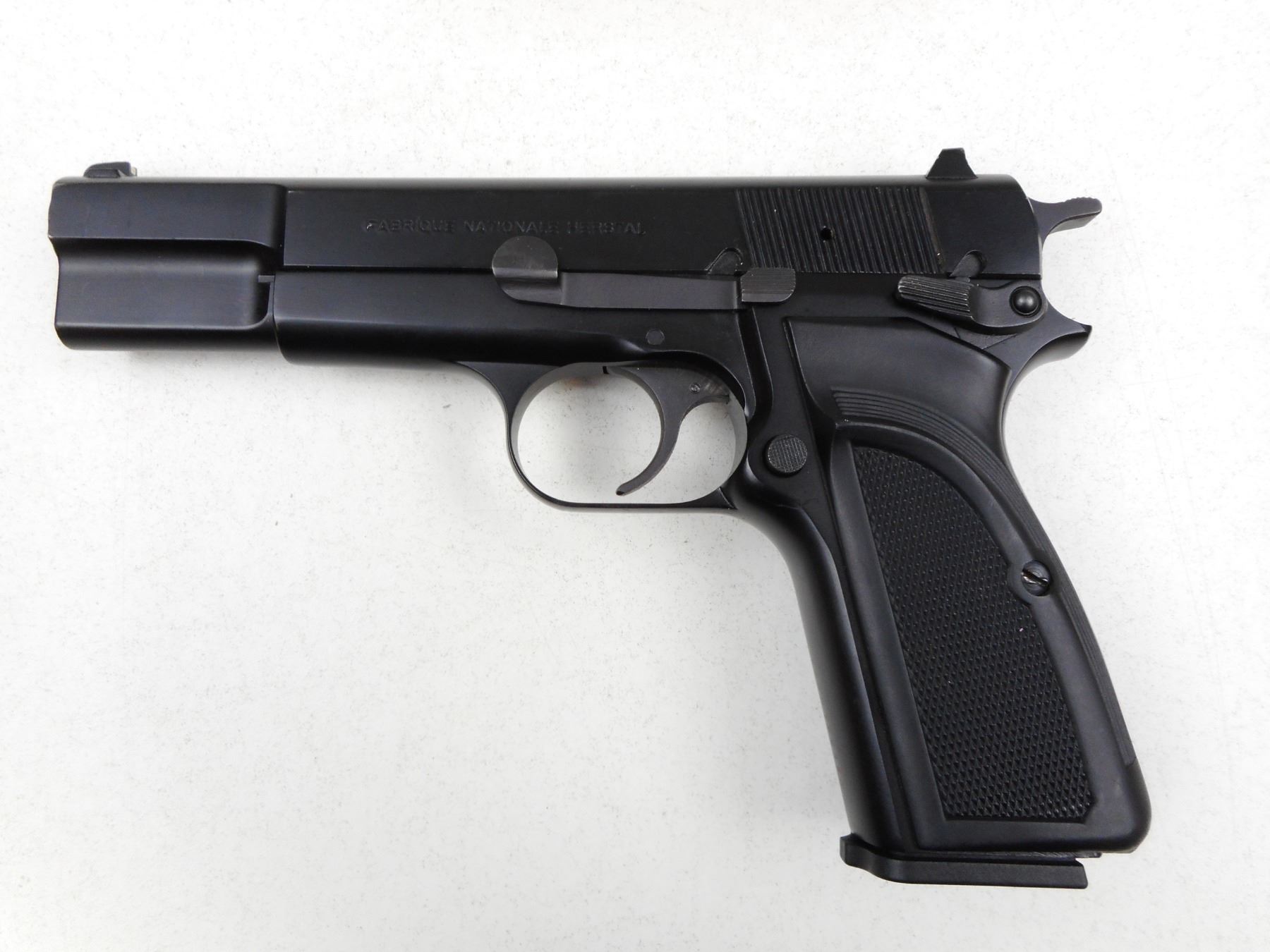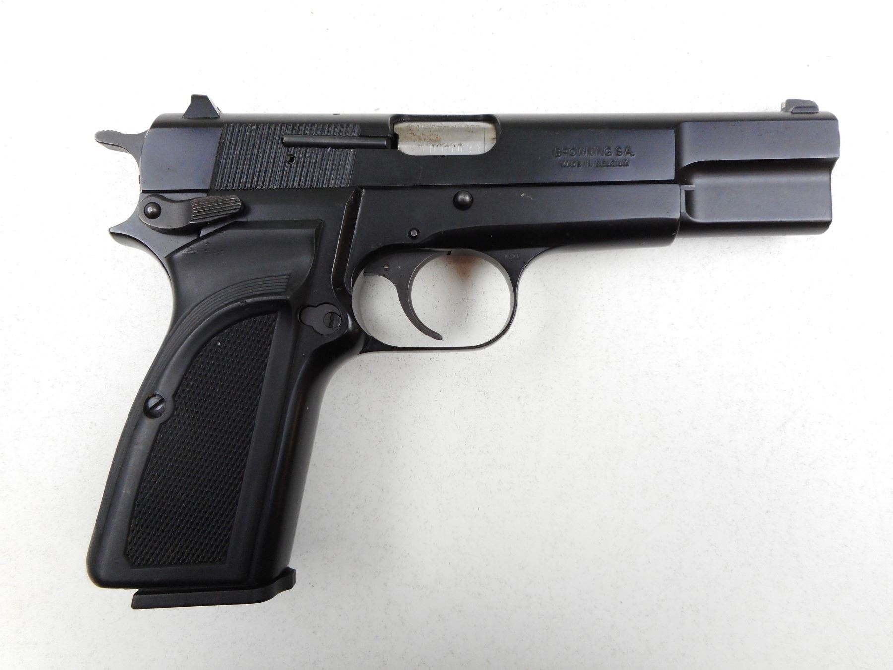 BROWNING , MODEL: HIGH POWER , CALIBER: 9MM LUGER , COMES WITH MAGAZINE, BORE IS EXCELLENT, BLADE FRONT AND ADJUSTABLE REAR SIGHTS, CHECKERED PLASTIC GRIPS, SHOWS VERY LITTLE HANDLING MARKS, WHITE 3 DOT SIGHT SYSTEM, MARKED MADE IN BELGIUM , SERIAL # 245NT56380 , ACTION: SEMI-AUTOMATIC HANDGUN , BARREL LENGTH: 115MM , CONDITION: 9/10 , STOCK # 2857 , CLASS: CANADIAN RESTRICTED CLASS