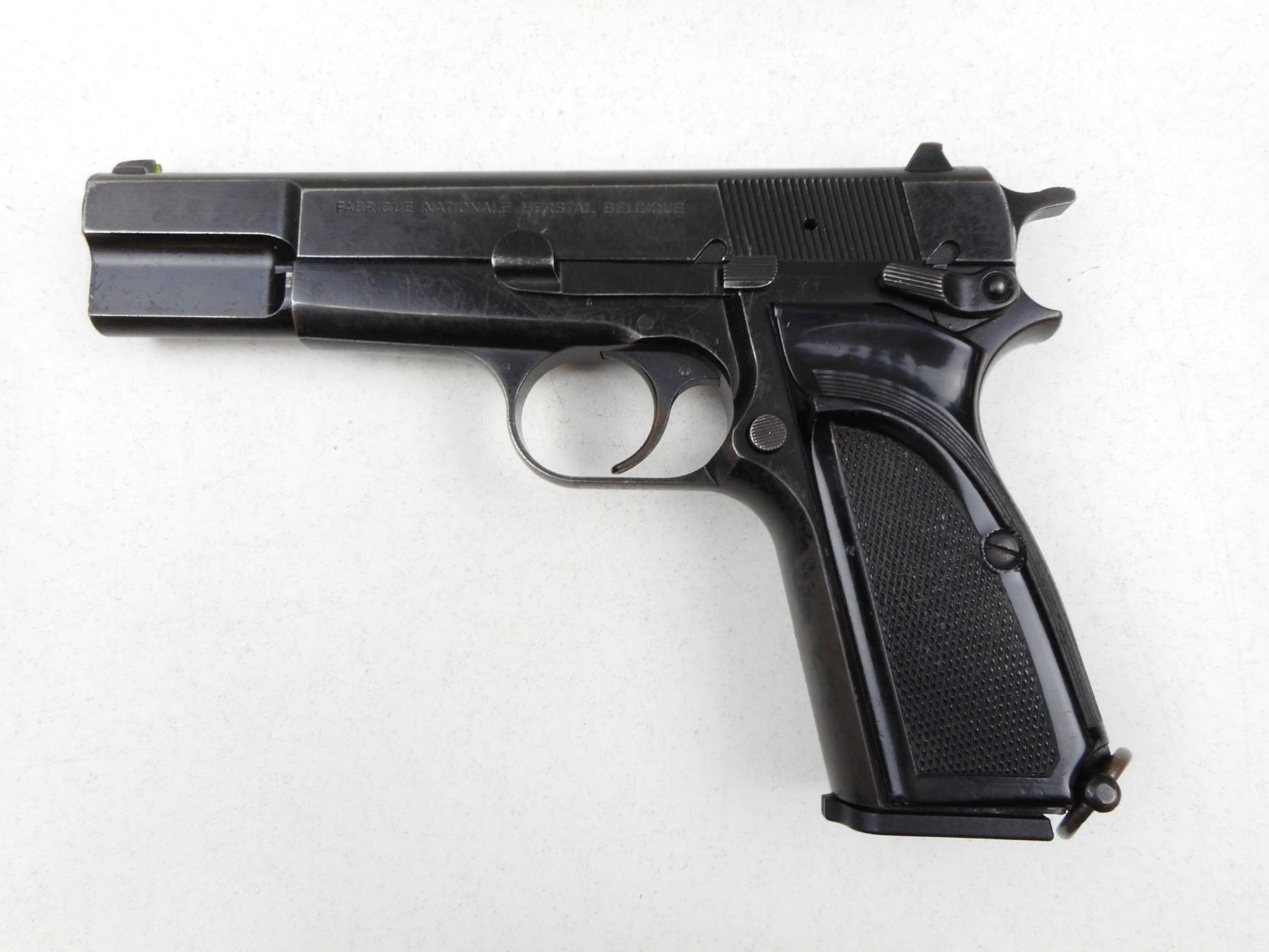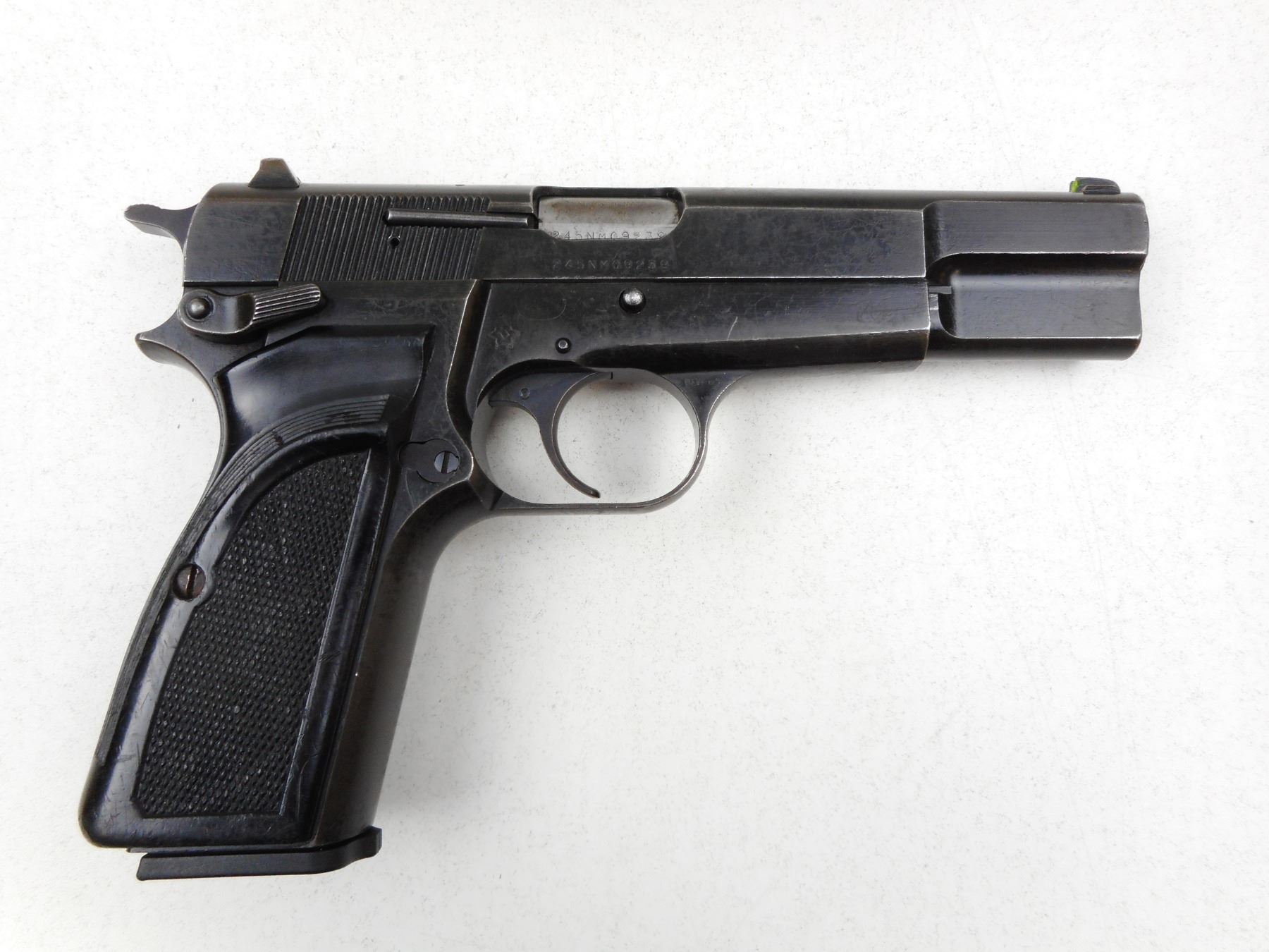 BROWNING , MODEL: HIGH POWER , CALIBER: 9MM LUGER , COMES WITH MAGAZINE, BORE IS GOOD, BLADE FRONT AND ADJUSTABLE REAR SIGHTS, CHECKERED PLASTIC GRIPS, SHOWS EXTENSIVE HANDLING MARKS, DARKENED 3 DOT SYSTEM, MARKED MADE IN BELGIUM, FEATURES A LANYARD LOOP , SERIAL # 245NM09239 , ACTION: SEMI-AUTOMATIC HANDGUN , BARREL LENGTH: 115MM , CONDITION: 5/10 , STOCK # 2858 , CLASS: CANADIAN RESTRICTED CLASS