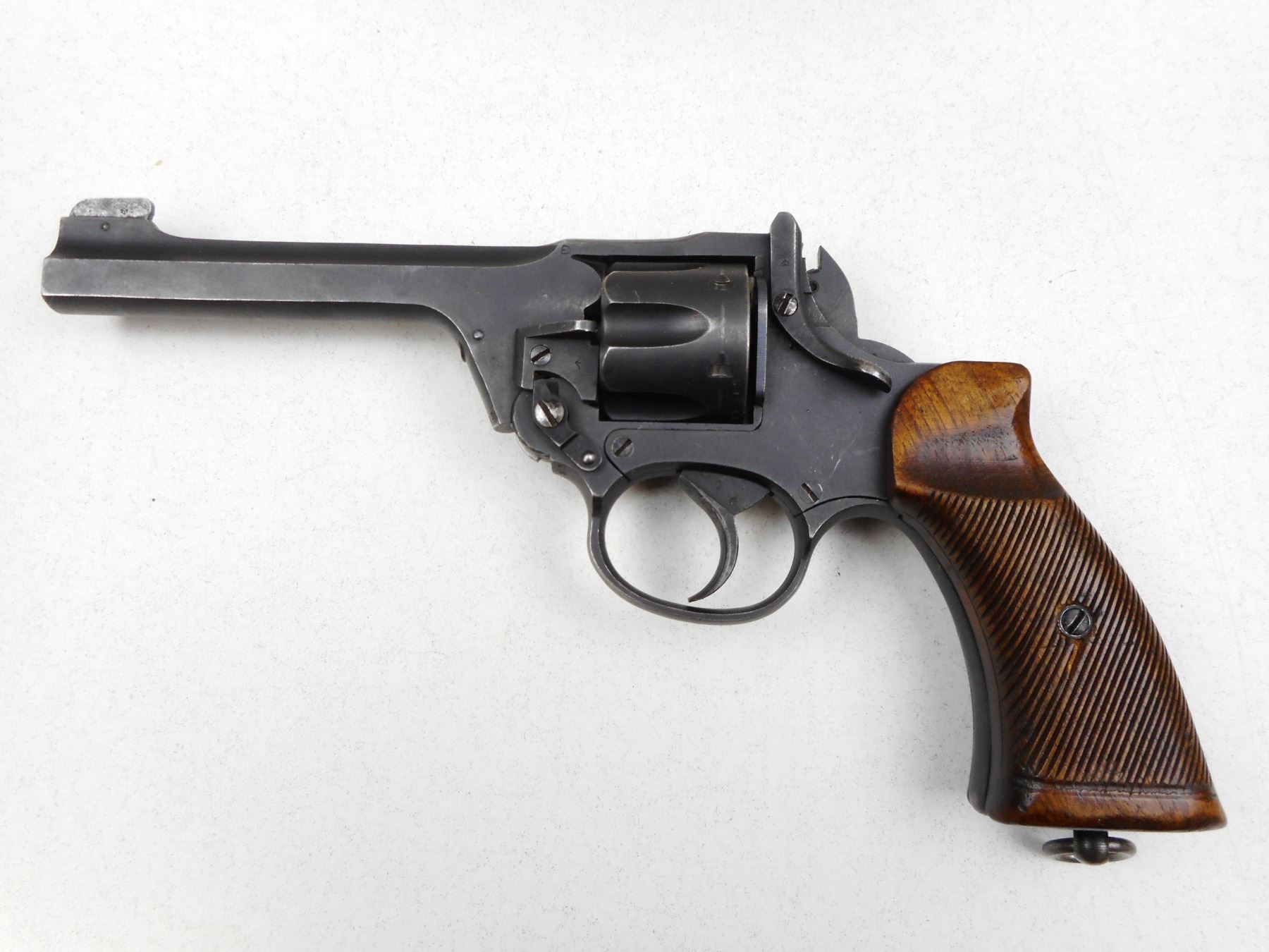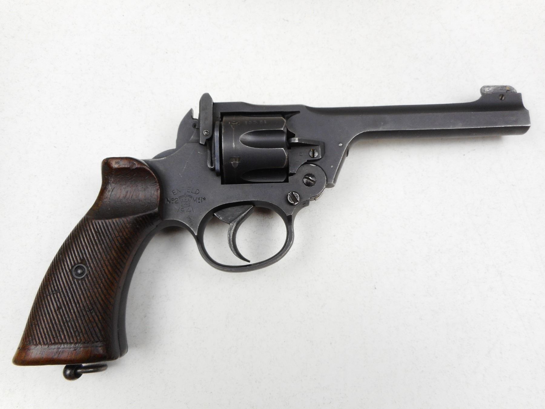 WWII ERA, ENFIELD , MODEL: TANKER NO2 MK I* , CALIBER: 38S&W , WWII ERA, DATED 1941 WITH A C BRD ARROW, BORE IS VERY GOOD, BLADE FRONT AND NOTCH REAR SIGHT, ORIGINAL WOOD GRIPS, SHOWS VERY LITTLE HANDLING MARKS , SERIAL # 01412 , ACTION: REVOLVER , BARREL LENGTH: 123MM , CONDITION: 8/10 , STOCK # 2865 , CLASS: CANADIAN RESTRICTED CLASS