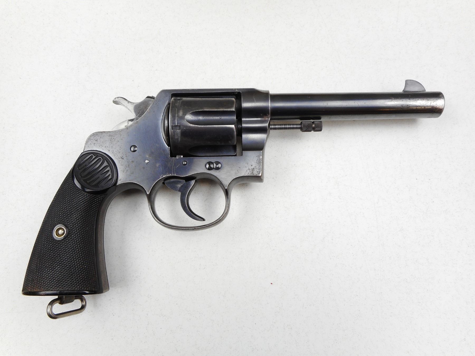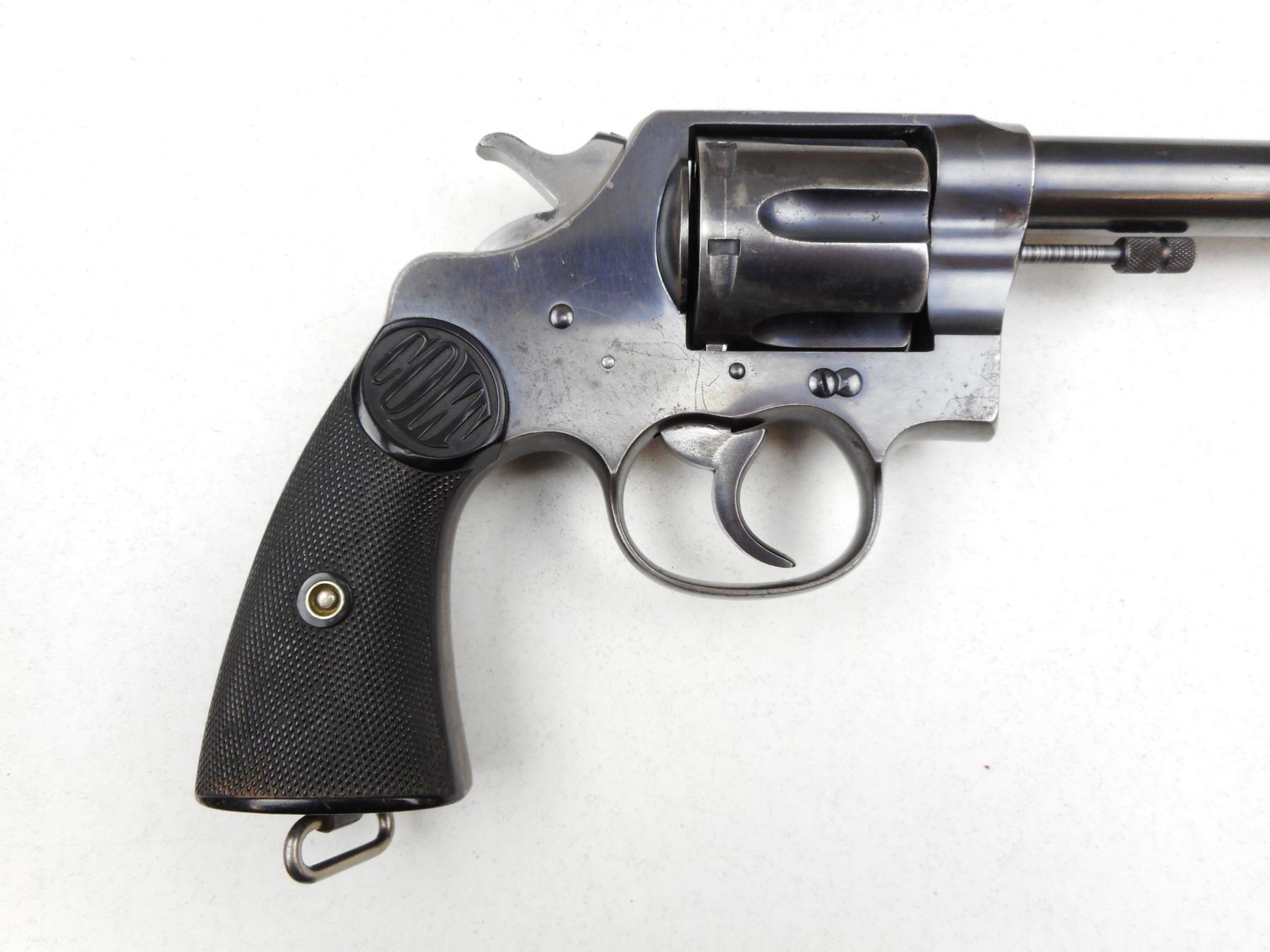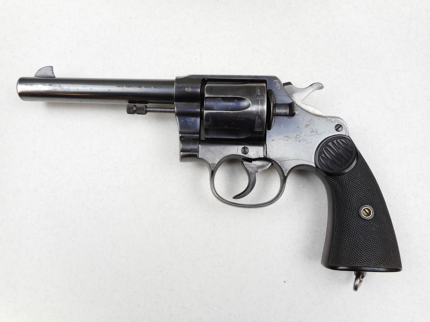 COLT , MODEL: NEW SERVICE , CALIBER: 455 ELY , BORE IS GOOD, BRD ARROW MARKED, CHECKERED PLASTIC GRIPS, LANYARD LOOP, SHOWS SOME HANDLING MARKS, BLADE FRONT AND NOTCH RECEIVER REAR SIGHT, ACTION IS TIGHT, LANYARD LOOP , SERIAL # 145799 , ACTION: REVOLVER , BARREL LENGTH: 140MM , CONDITION: 7/10 , STOCK # 2872 , CLASS: CANADIAN RESTRICTED CLASS