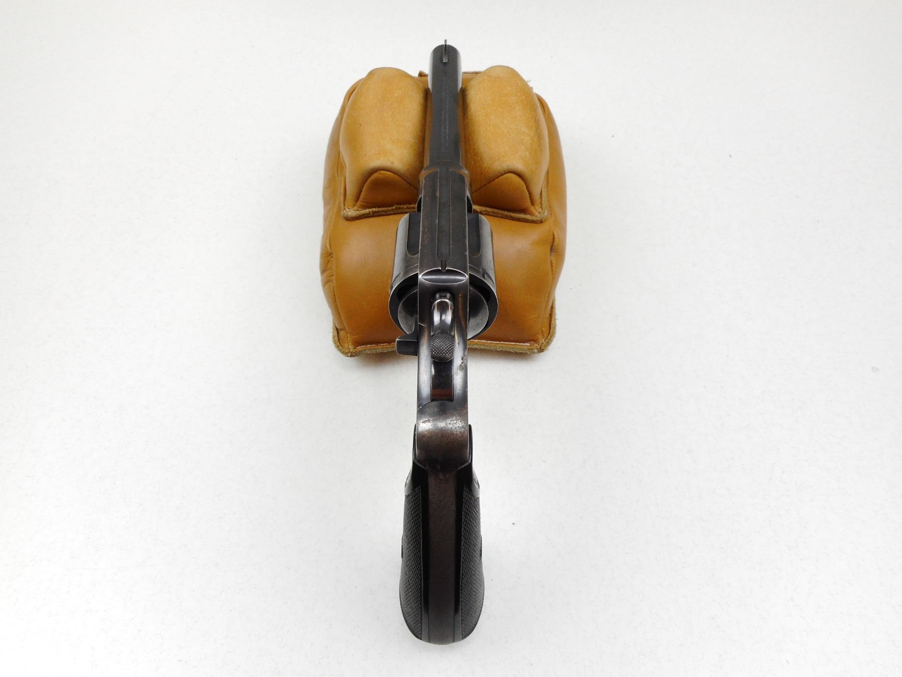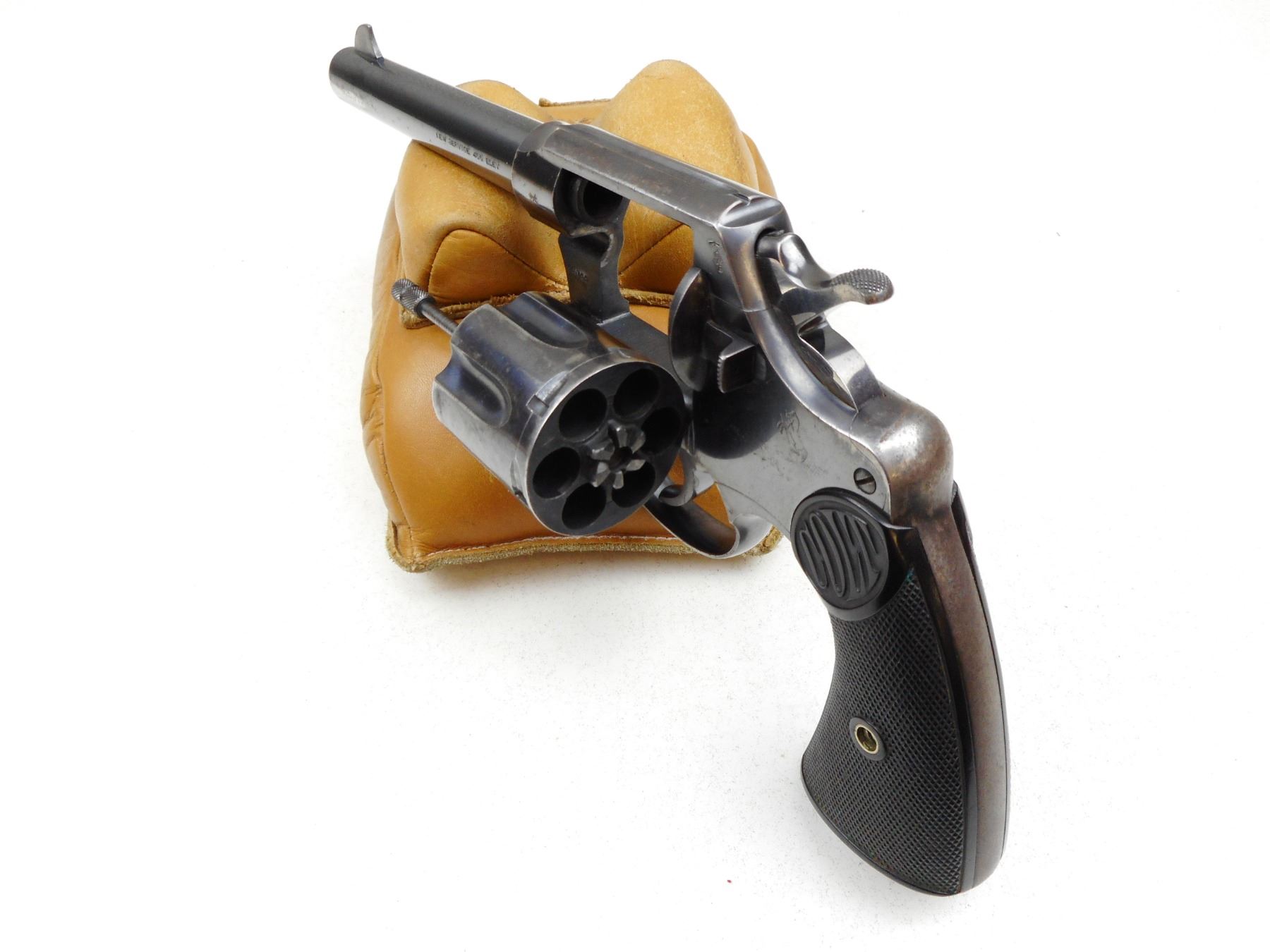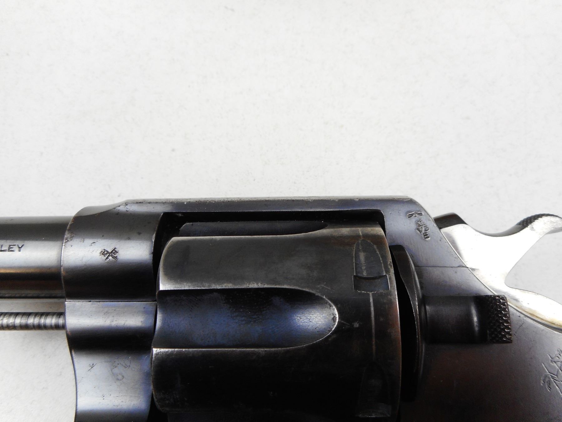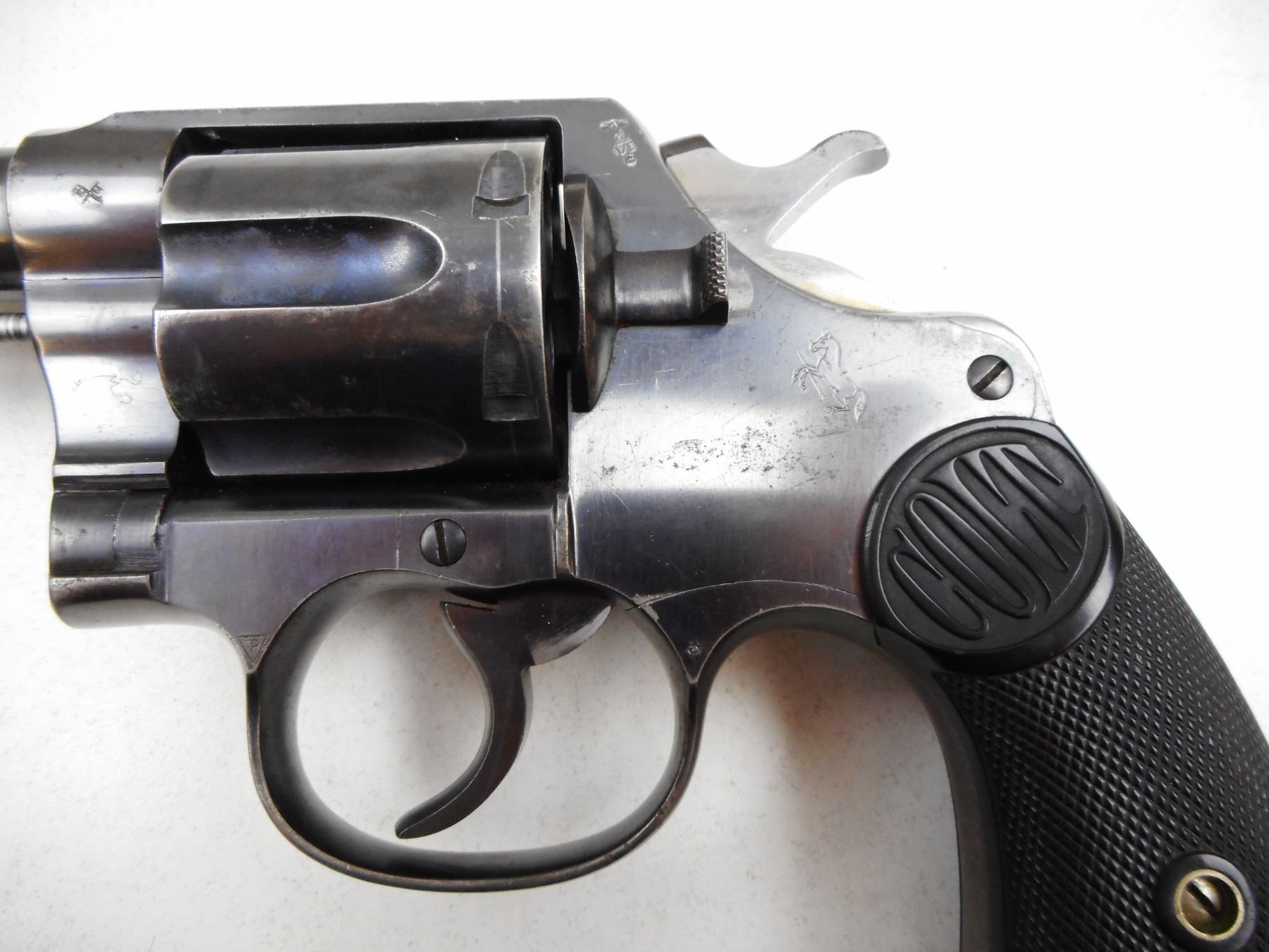 COLT , MODEL: NEW SERVICE , CALIBER: 455 ELY , BORE IS GOOD, BRD ARROW MARKED, CHECKERED PLASTIC GRIPS, LANYARD LOOP, SHOWS SOME HANDLING MARKS, BLADE FRONT AND NOTCH RECEIVER REAR SIGHT, ACTION IS TIGHT, LANYARD LOOP , SERIAL # 145799 , ACTION: REVOLVER , BARREL LENGTH: 140MM , CONDITION: 7/10 , STOCK # 2872 , CLASS: CANADIAN RESTRICTED CLASS