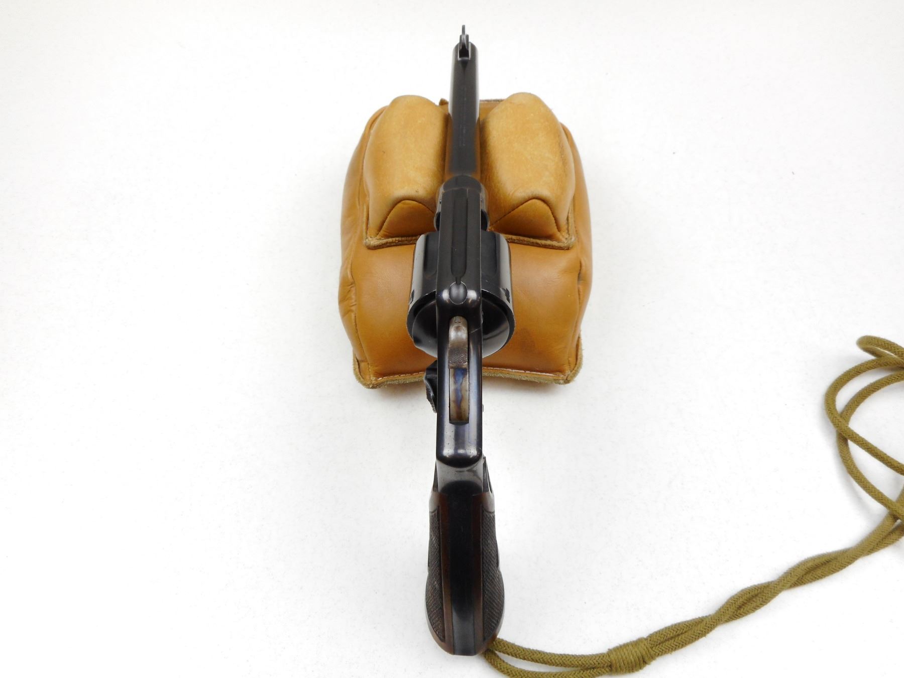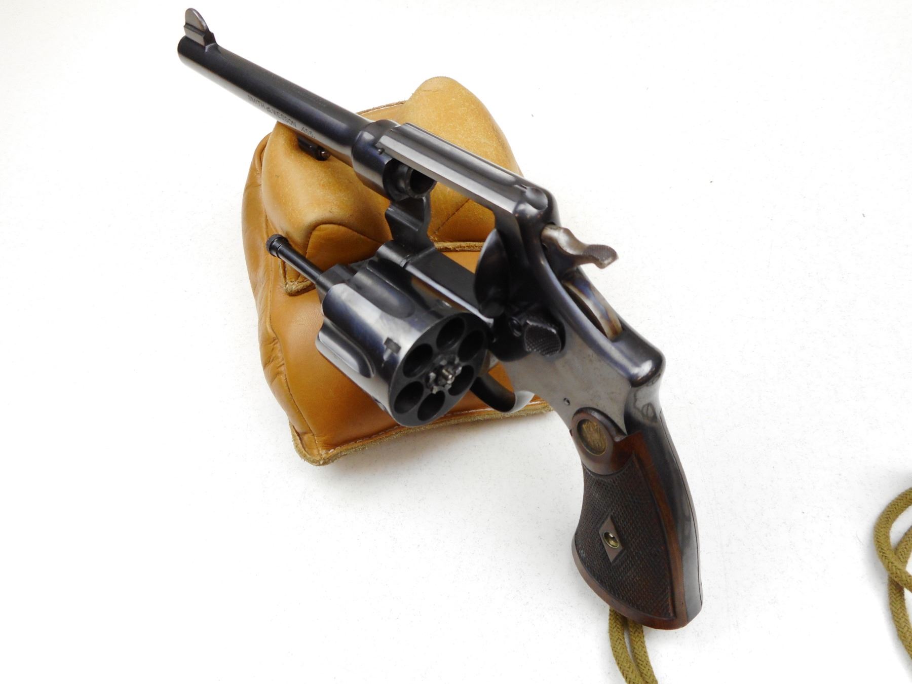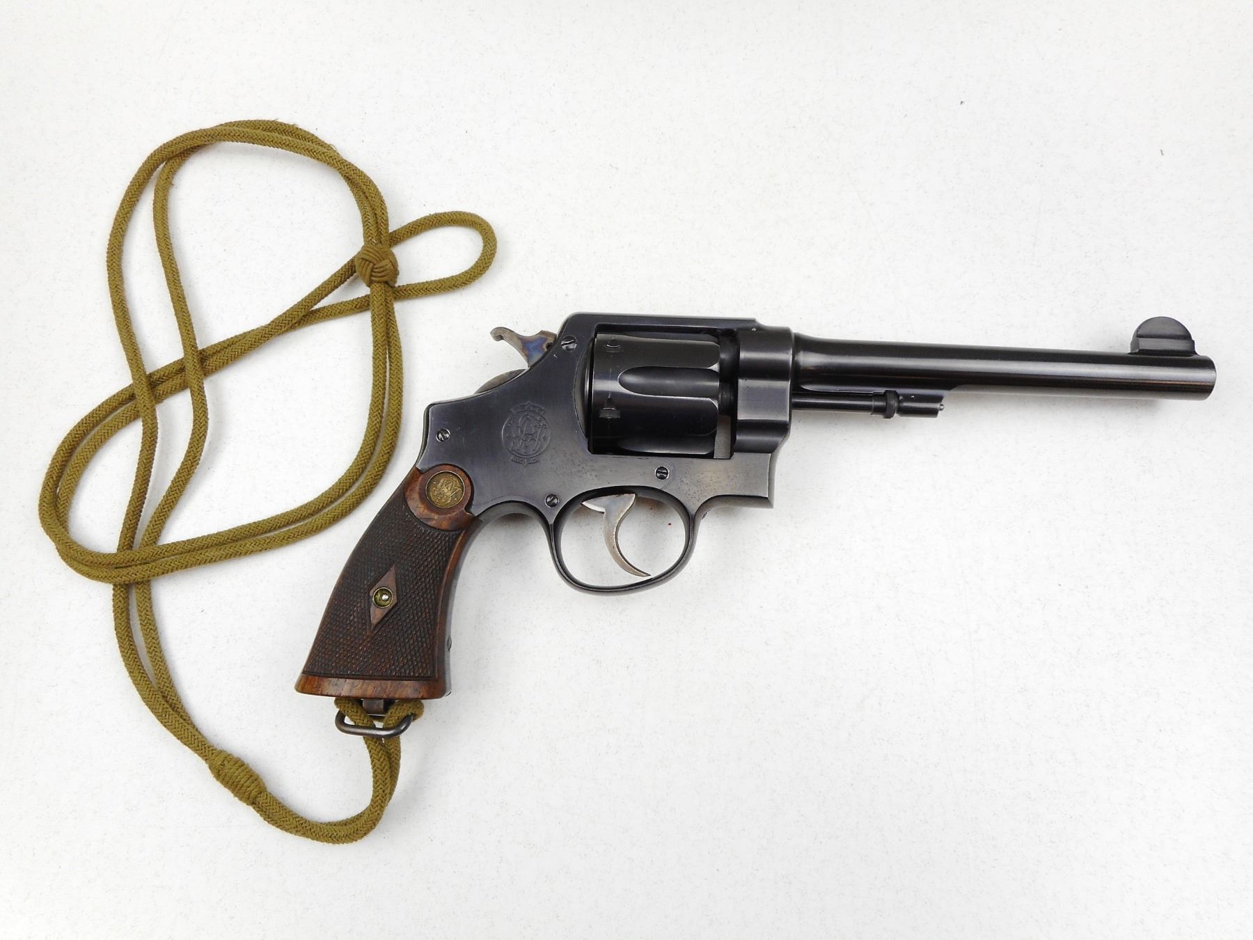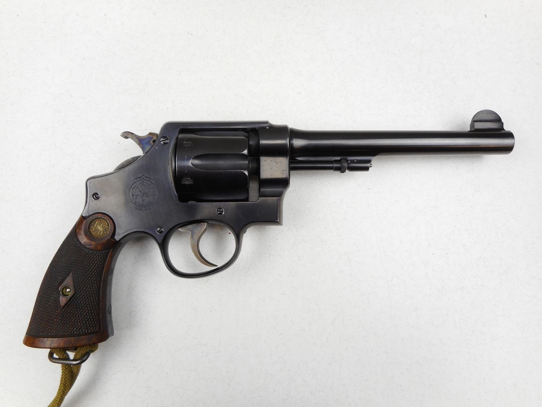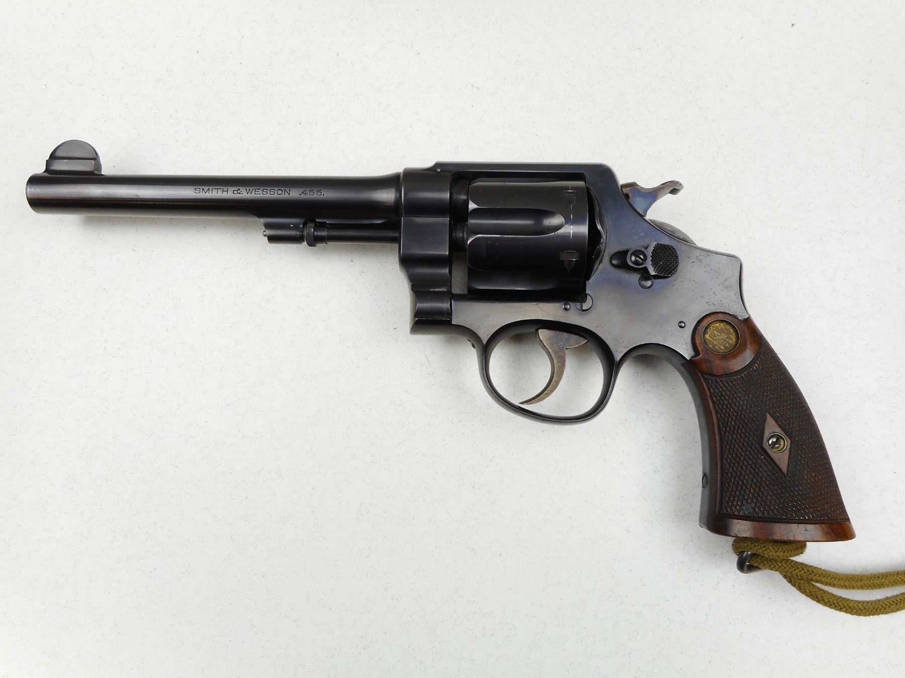 SMITH & WESSON , MODEL: HAND EJECTOR 455 MARK 2 MODEL 2 AKA NEW CENTURY , CALIBER: 455 REV , BORE IS VERY GOOD, BLADE FRONT AND NOTCH REAR SIGHT, ACTION IS TIGHT, SHOWS VERY LITTLE HANDLING MARKS, CHECKERED WOOD GRIPS WITH S&W LOGO, LANYARD RING WITH ORIGINAL LANYARD CORD , SERIAL # 38546 , ACTION: REVOLVER , BARREL LENGTH: 164MM , CONDITION: 8/10 , STOCK # 2873 , CLASS: CANADIAN RESTRICTED CLASS