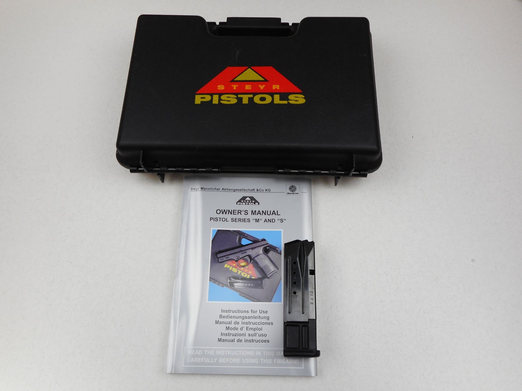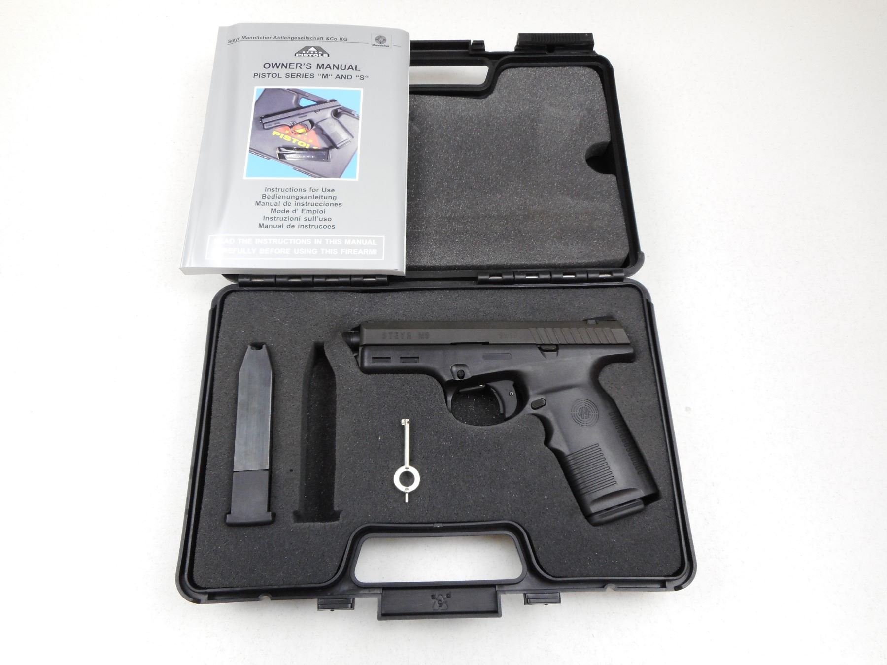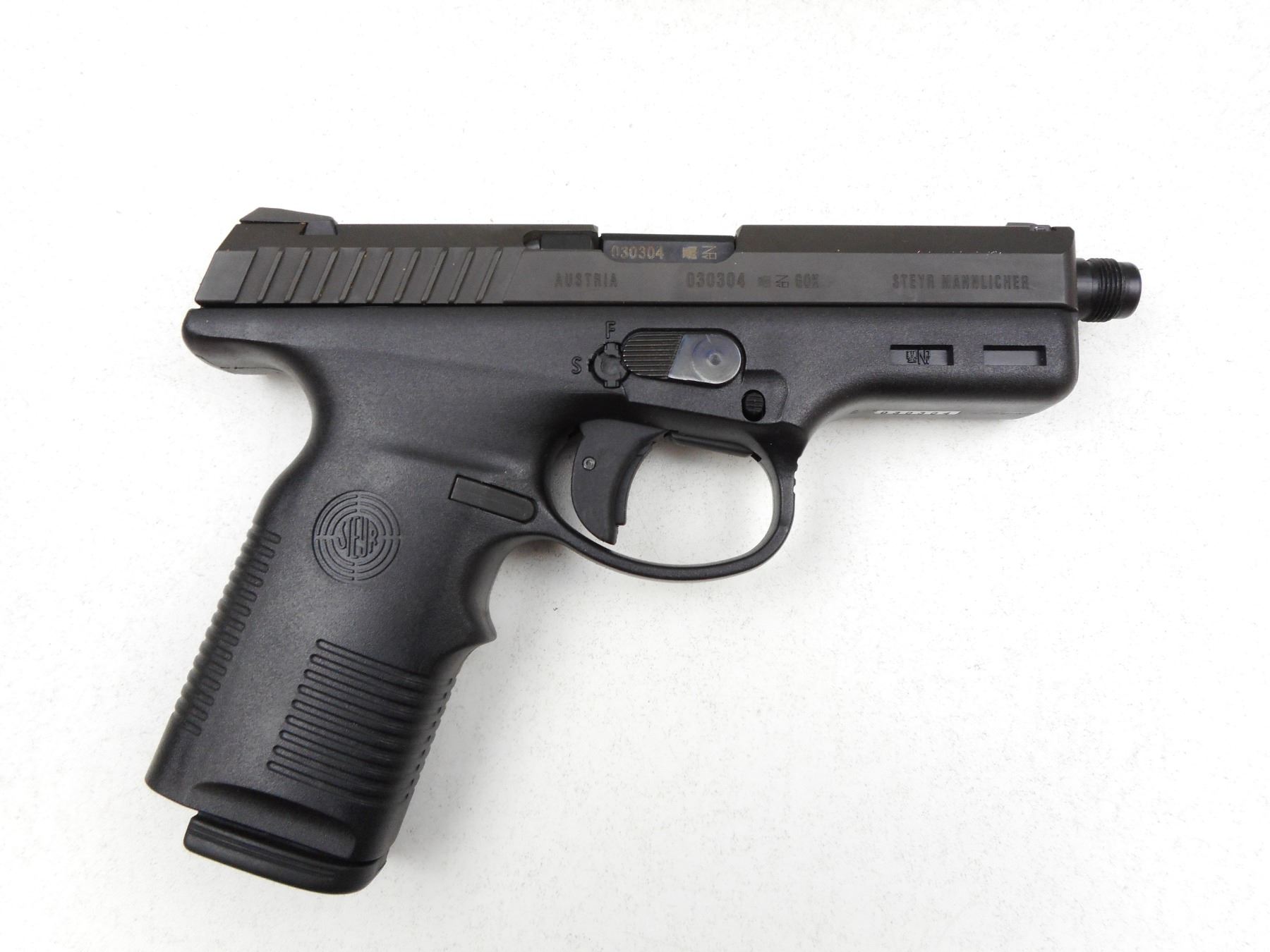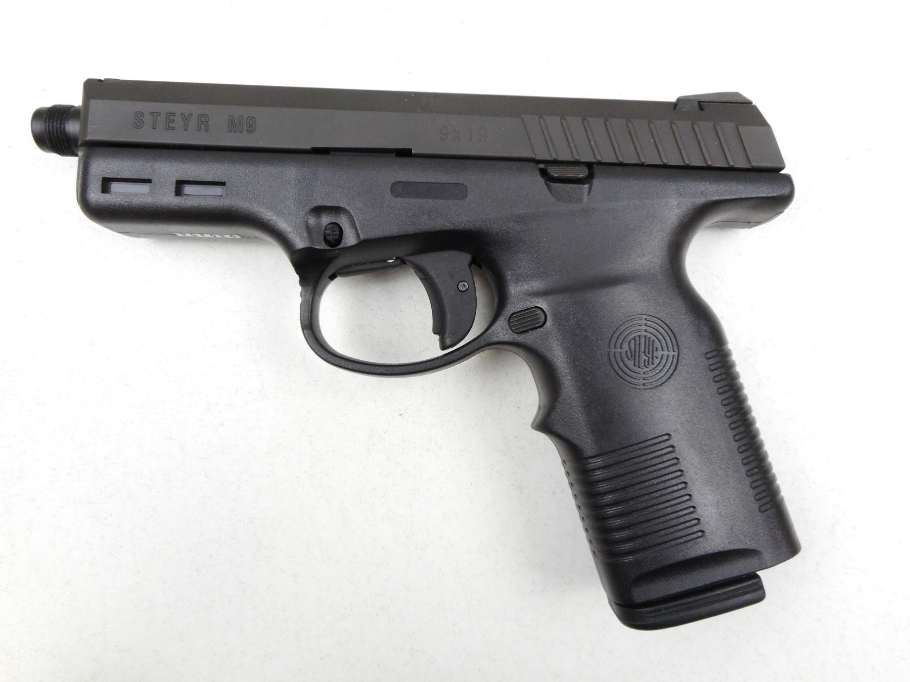 STEYR , MODEL: M9 , CALIBER: 9MM LUGER , COMES WITH CASE AND 2 MAGAZINES, BORE IS VERY GOOD, THREADED MUZZLE, STEEL SLIDE AND POLYMER RECEIVER FRAME, SHOWS VERY LITTLE HANDLING MARKS, TRIANGULAR WHITE FRONT SIGHT AND FIXED REAR SIGHT , SERIAL # 030304 , ACTION: SEMI-AUTOMATIC HANDGUN , BARREL LENGTH: 115MM , CONDITION: 9/10 , STOCK # 2876 , CLASS: CANADIAN RESTRICTED CLASS