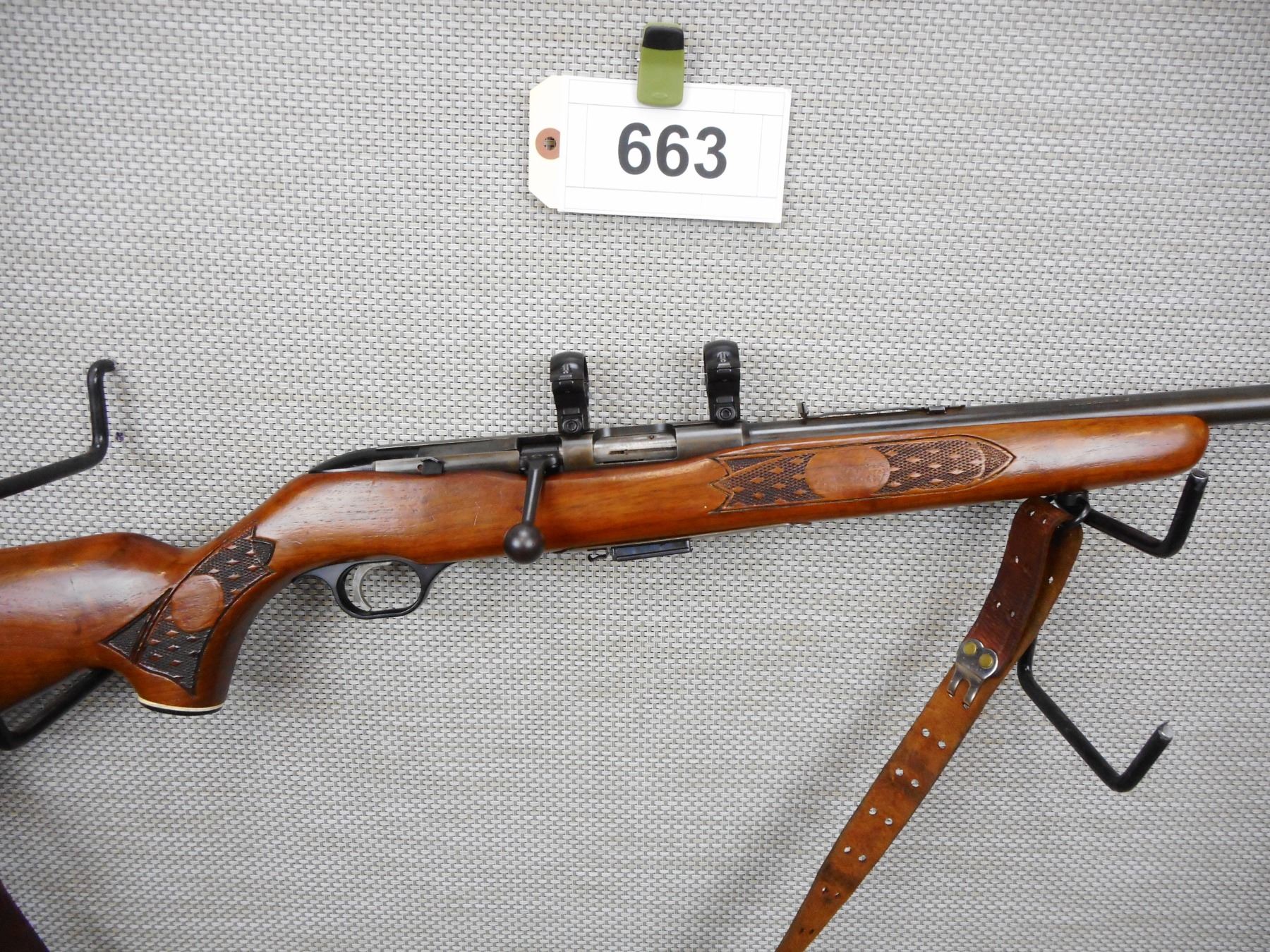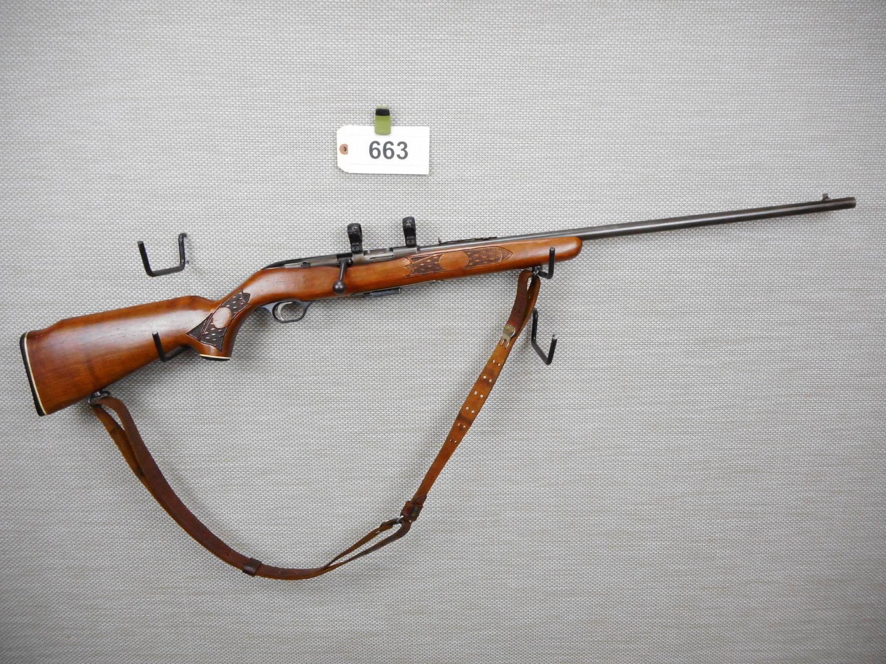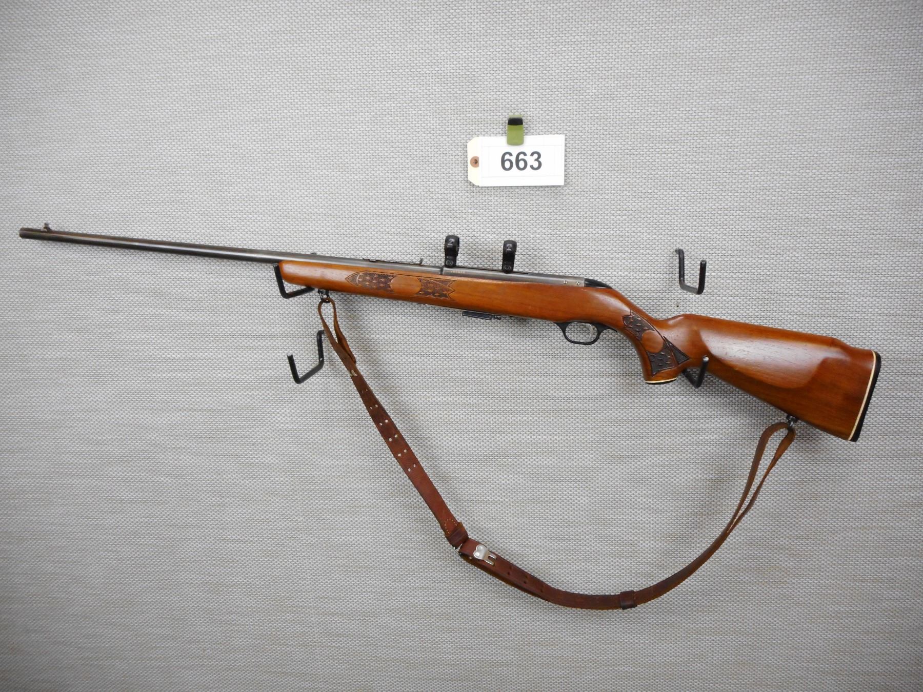 MOSSBERG , MODEL: 640K CHUCKSTER , CALIBER: 22 MAG , COMES WITH MAGAZINE, BOUGHT NEW IN 1971, BLADE FRONT AND ADJUSTABLE REAR SIGHT, BORE IS VERY GOOD, GROOVED RECEIVER COMPLETE WITH SCOPE RINGS, CHECKERED FOREND AND CAPPED PISTOL GRIP BUTT STOCK, PLASTIC BUTT PLATE, LEATHER SLING ON SLING LOOPS, SHOWS SOME HANDLING MARKS , SERIAL # 144947 , ACTION: BOLT ACTION REPEATER RIFLE , BARREL LENGTH: 24" , CONDITION: 7/10 , STOCK # 8668 , CLASS: CANADIAN NON RESTRICTED CLASS