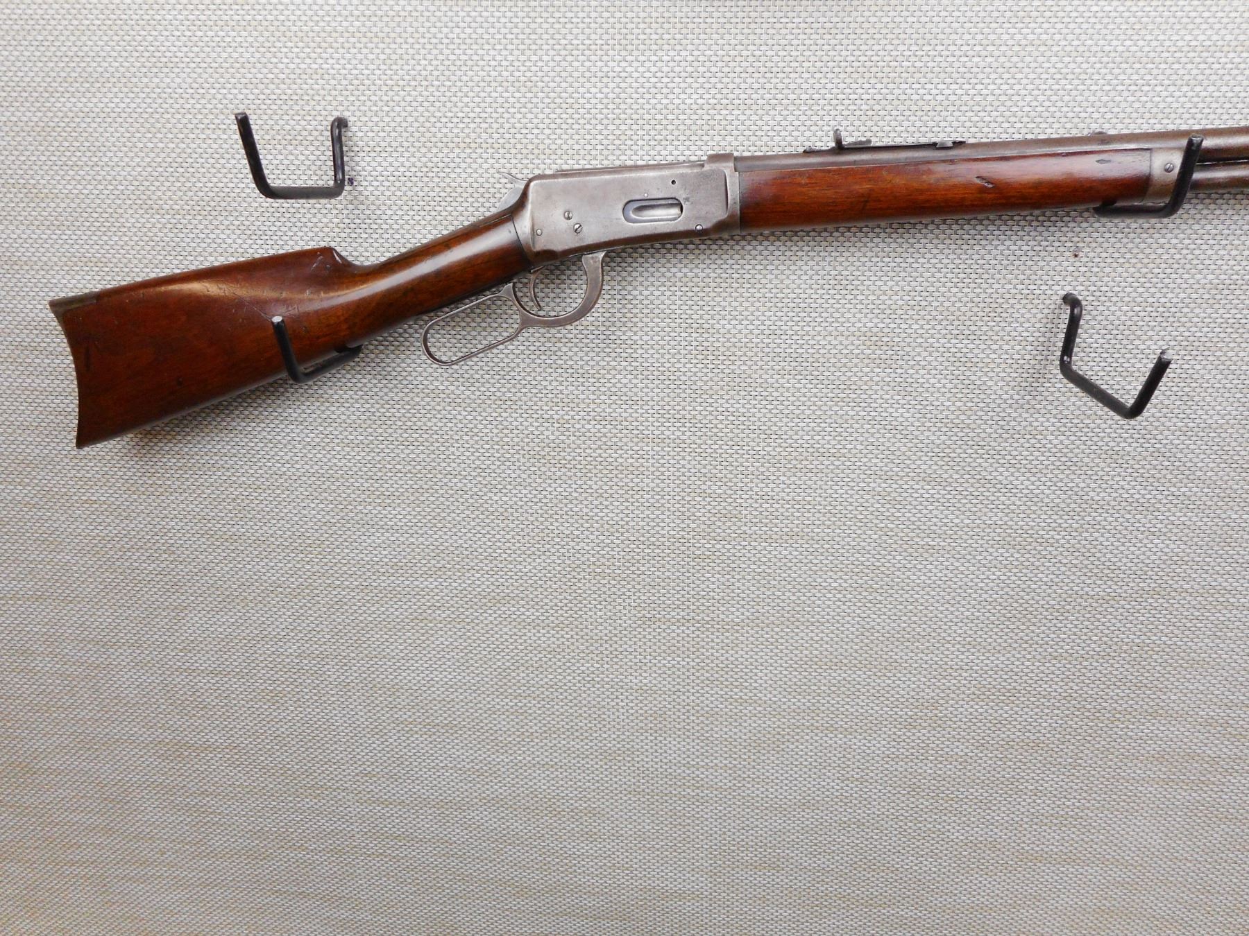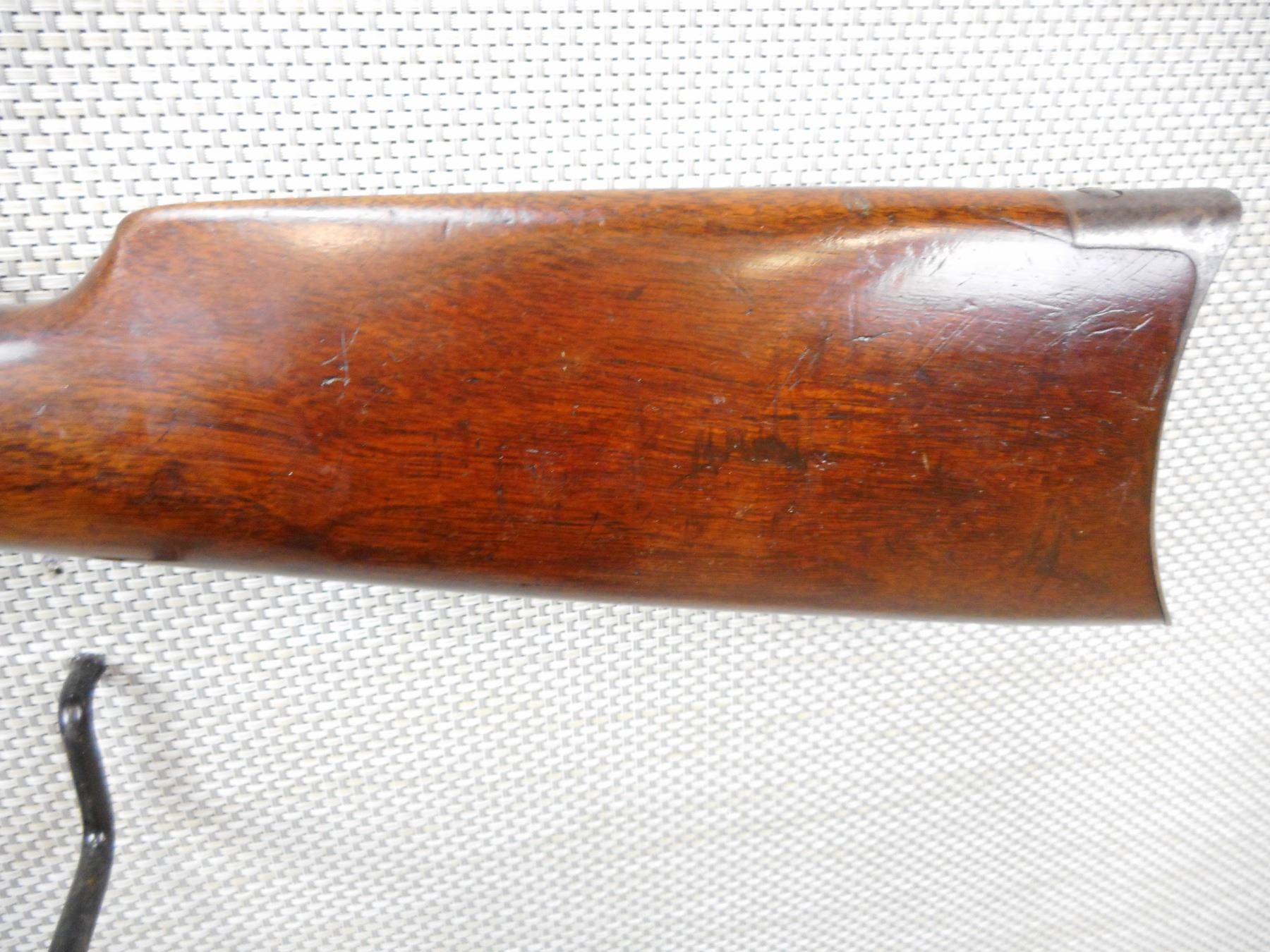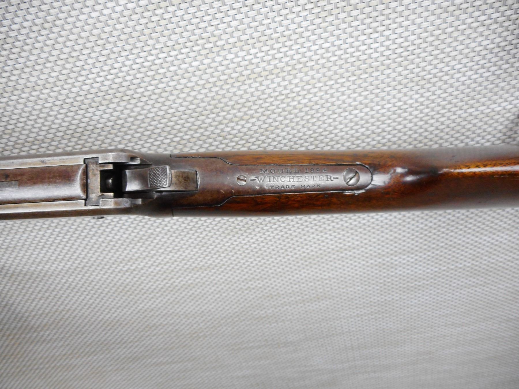WINCHESTER , MODEL: 1894 , CALIBER: 38-55 WIN , MANUFACTURED IN 1905, BORE IS DARK, BLADE FRONT AND FULLY ADJUSTABLE REAR SIGHTS, MINOR CRACKS AT FOREND AND AT THE WRIST, SHOWS SOME HANDLING MARKS, CRESCENT METAL BUTT PLATE, VERY LITTLE FINISH REMANING , SERIAL # 350623 , ACTION: LEVER ACTION RIFLE , BARREL LENGTH: 26" , CONDITION: 5/10 , STOCK # 8673 , CLASS: CANADIAN NON RESTRICTED CLASS